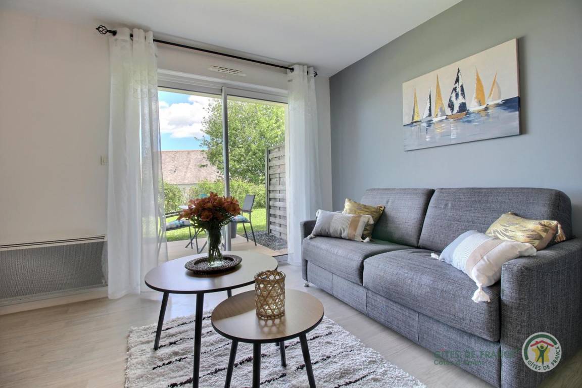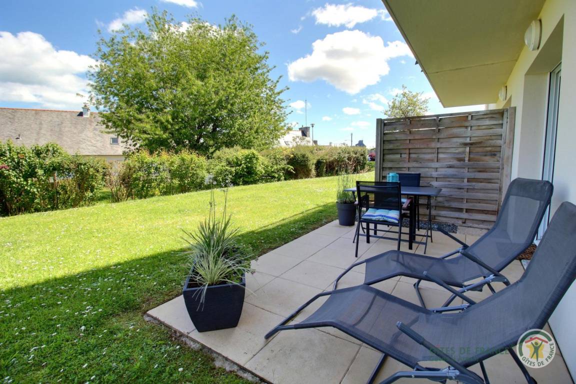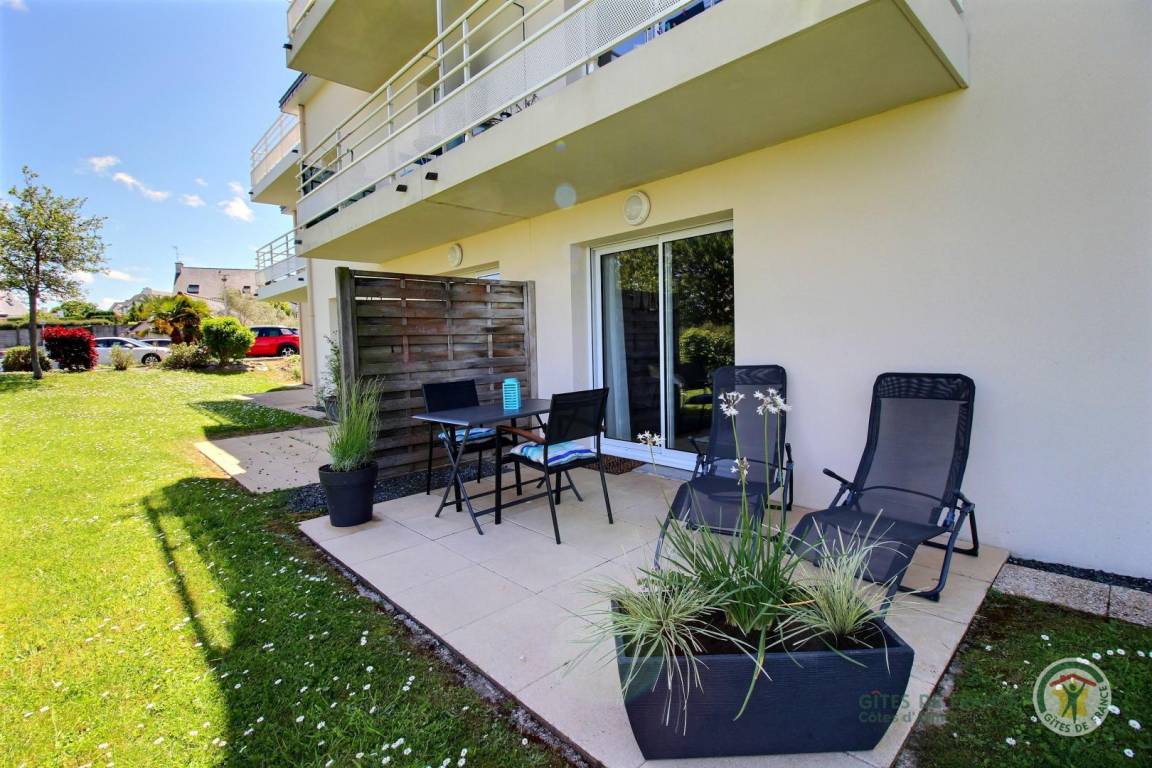 Ihre Ferienwohnung befindet sich im Erdgeschoss einer Residenz und besteht aus: Küche, Wohnzimmer (mit Schlafsofa), einem Schlafzimmer mit kleinem Meerblick (1 Doppelbett 160x200), Badezimmer mit Dusche und WC. Zu Ihrer Verfügung: private Terrasse von 14 m². Gemeinsamer Garten mit den anderen Bewohnern. Parken Sie Ihr Fahrzeug auf dem Privatparkplatz der Residenz.