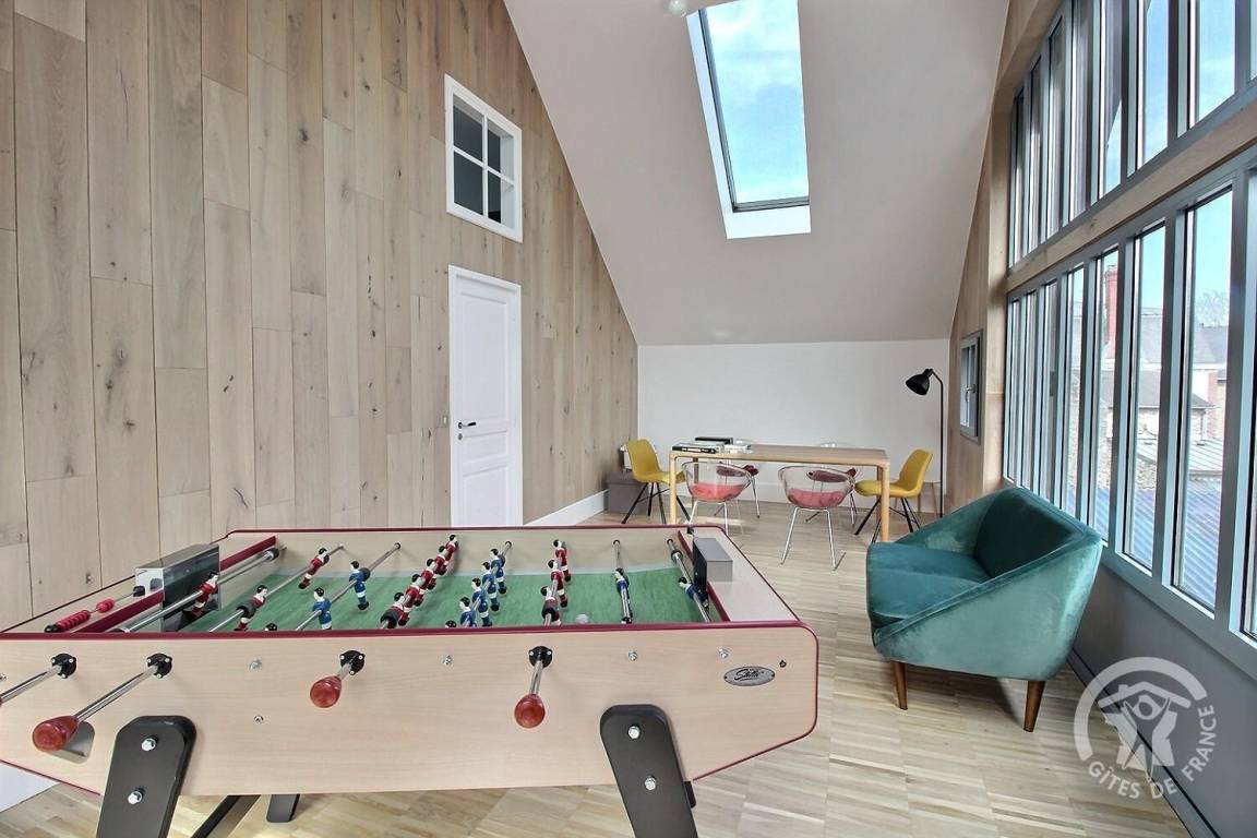 „Grande capacité d’accueil pour ce gîte, aménagement fonctionnel, sanitaires en nombre, salon, salle de jeux, salle télé et séjour immense pour que chacun puisse trouver son espace.“