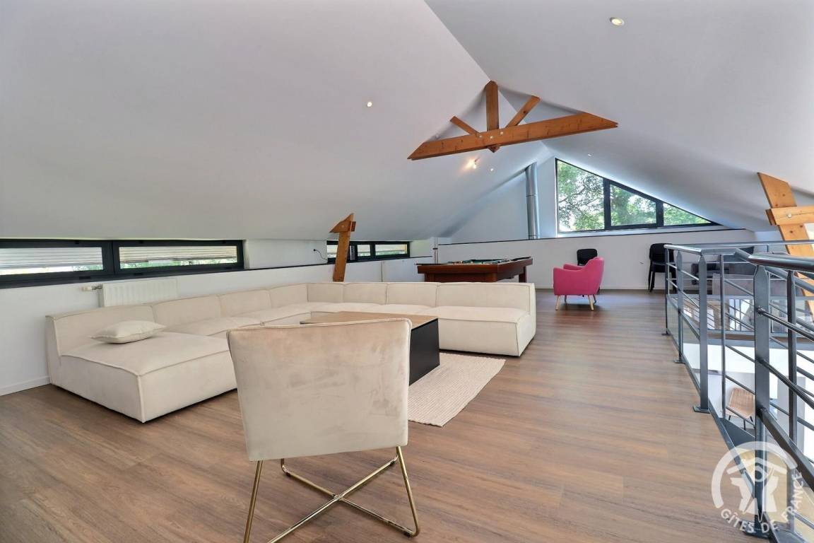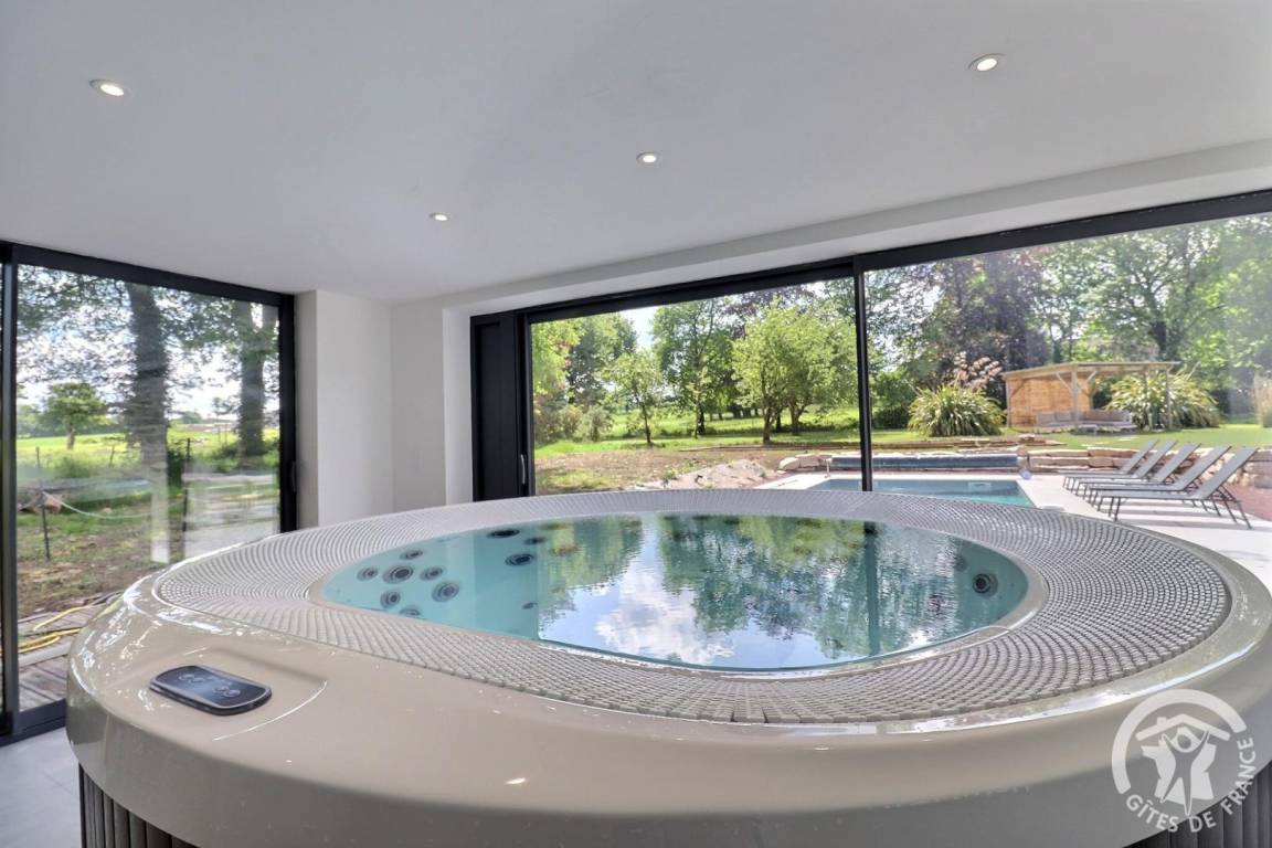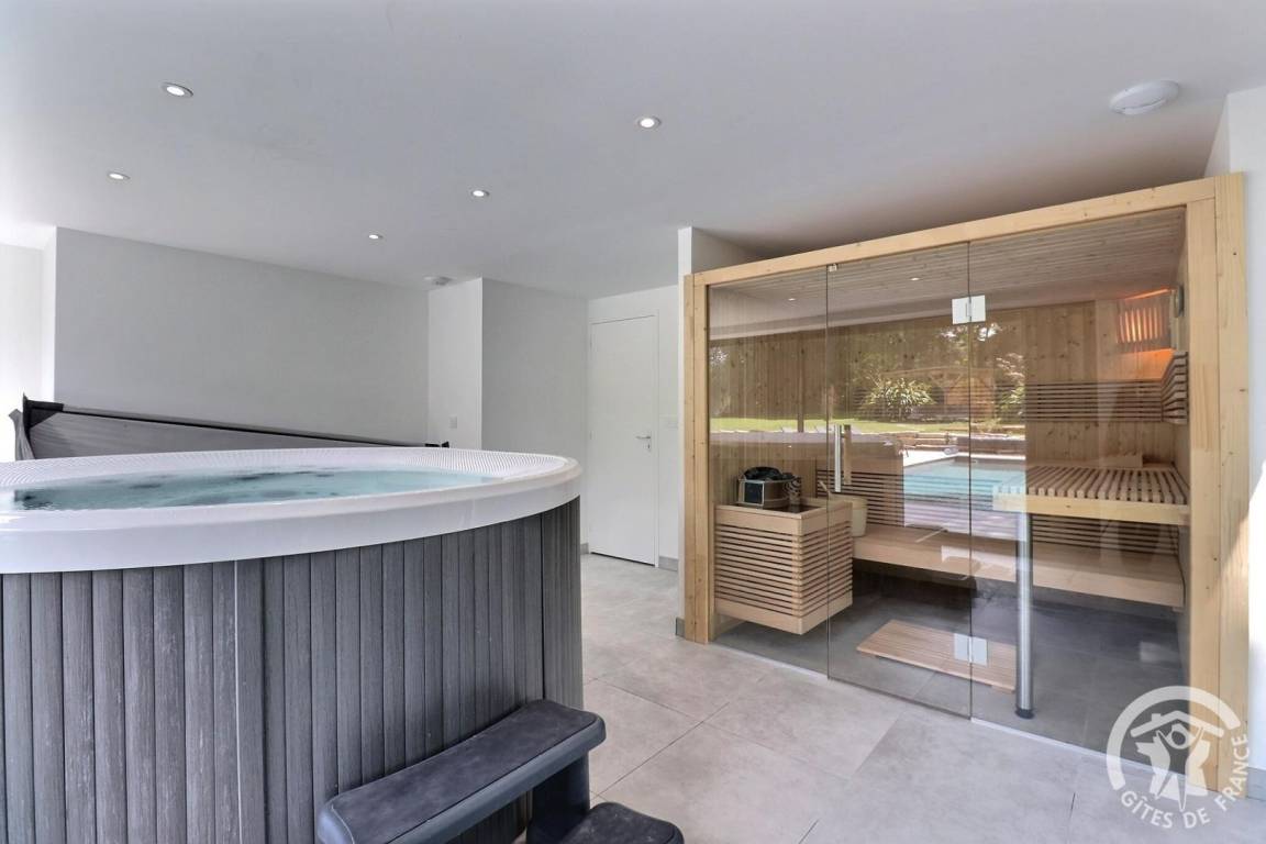 Das auf Wohlbefinden ausgelegte Haus verfügt über einen Entspannungsbereich mit Sauna, Whirlpool für 6 Personen und großem beheiztem Innenpool (Größe: 10 x 4 m – Tiefe: 1,50 m), der das ganze Jahr über zugänglich ist. Das Cottage vereint erstklassigen Komfort und eine warme Atmosphäre. Die elegante Einrichtung der Zimmer lädt zum Entspannen in ruhiger Atmosphäre ein.
