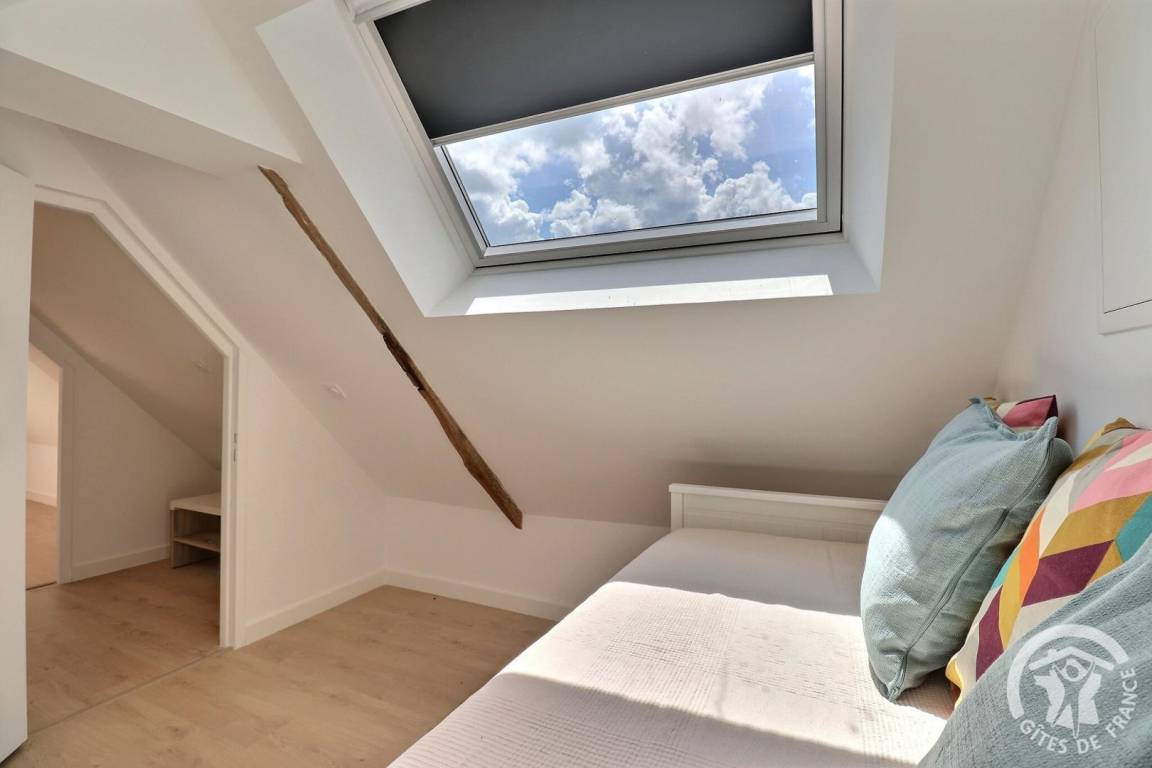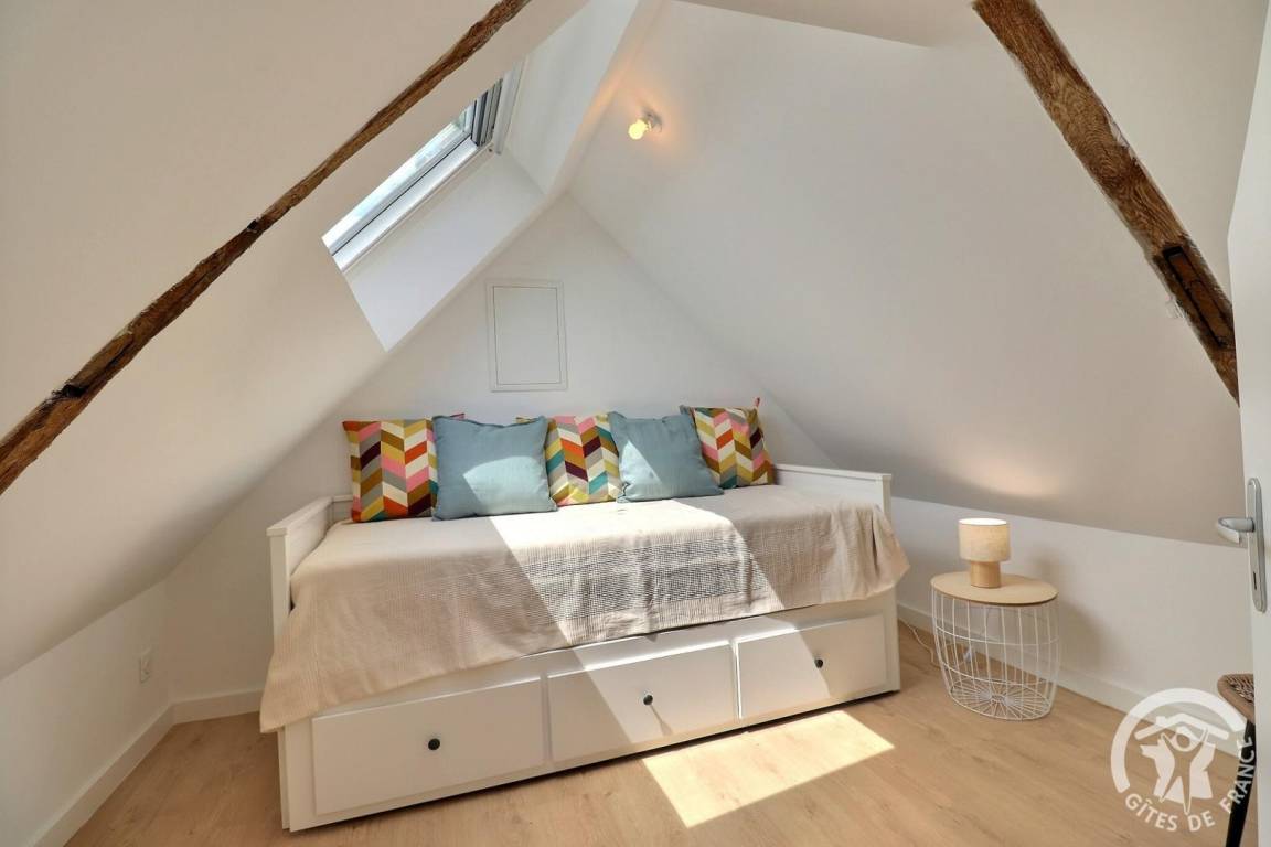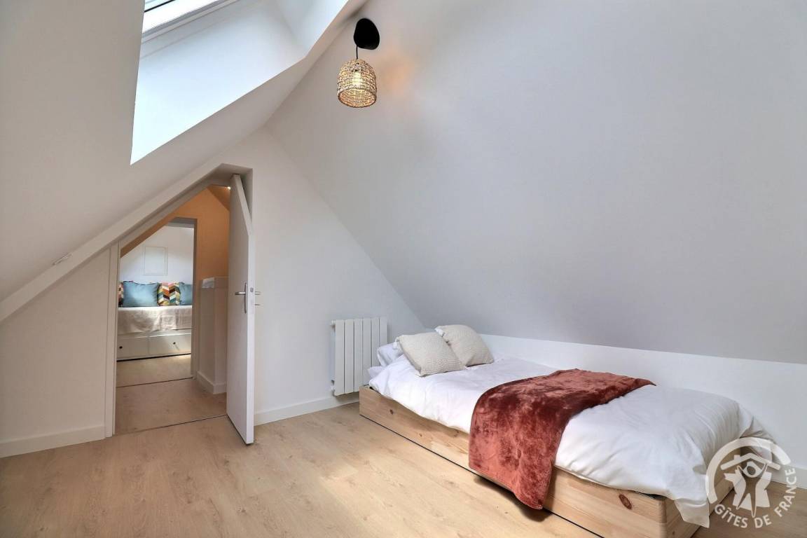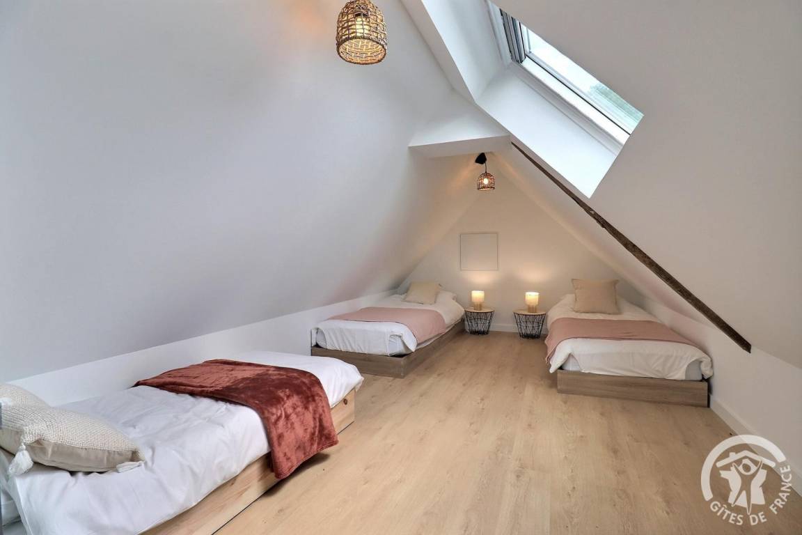 - ein kleines Schlafzimmer im Dachgeschoss mit drei 90 x 190 Betten