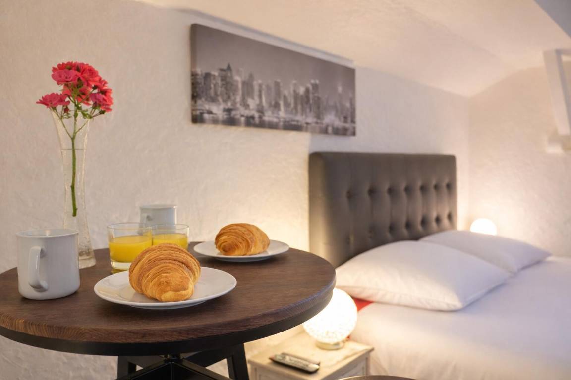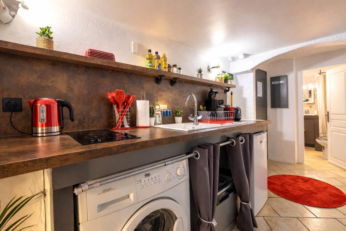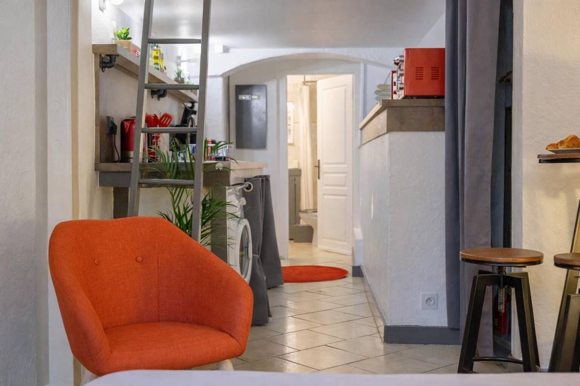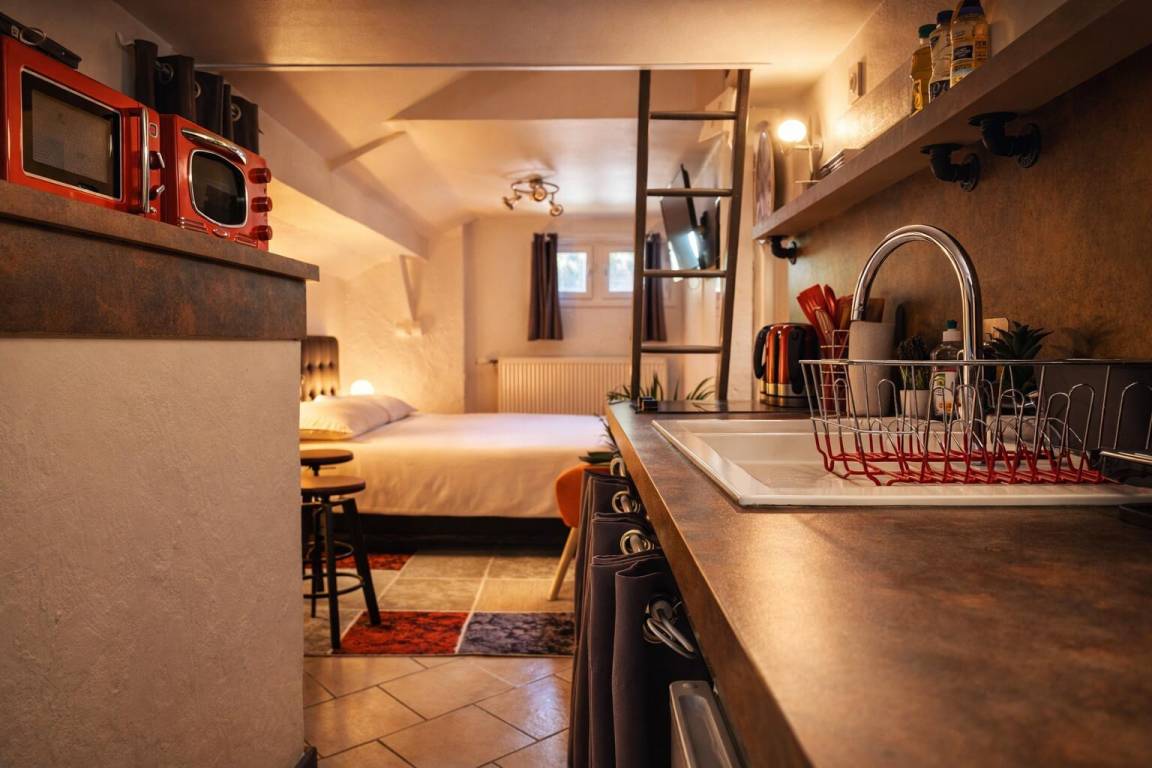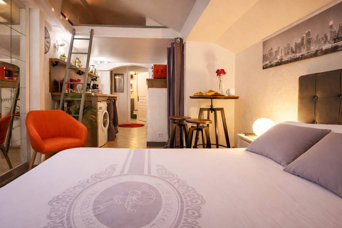 Studio im 1. Stock mit einem Badezimmer (Dusche und WC), einem Küchenbereich und einem Wohnzimmer (1 Doppelbett 160 x 200 cm) mit über Bluetooth verbundenem TV, einem Badezimmer (Dusche mit WC).