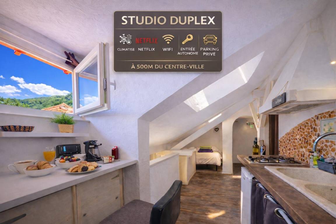 3 Ferienhäuser in einem Haus neben dem der Eigentümer, in einem Wohngebiet, auf den Anhöhen von Albertville. Gemeinsamer Eingang für die 3 Ferienhäuser, verteilt auf halbe Ebenen. Maisonette-Studio mit Klimaanlage, eingerichtet in einem atypischen Volumen. Gemeinsamer Außenparkplatz für die 3 Ferienhäuser.