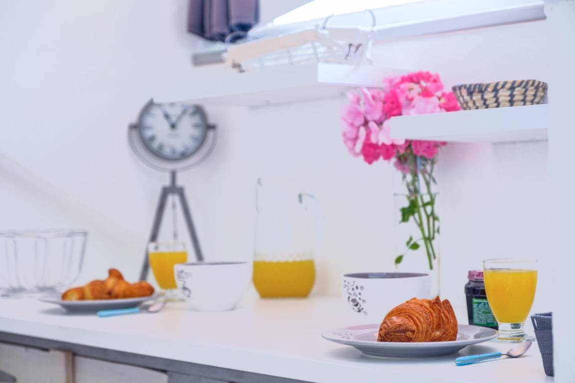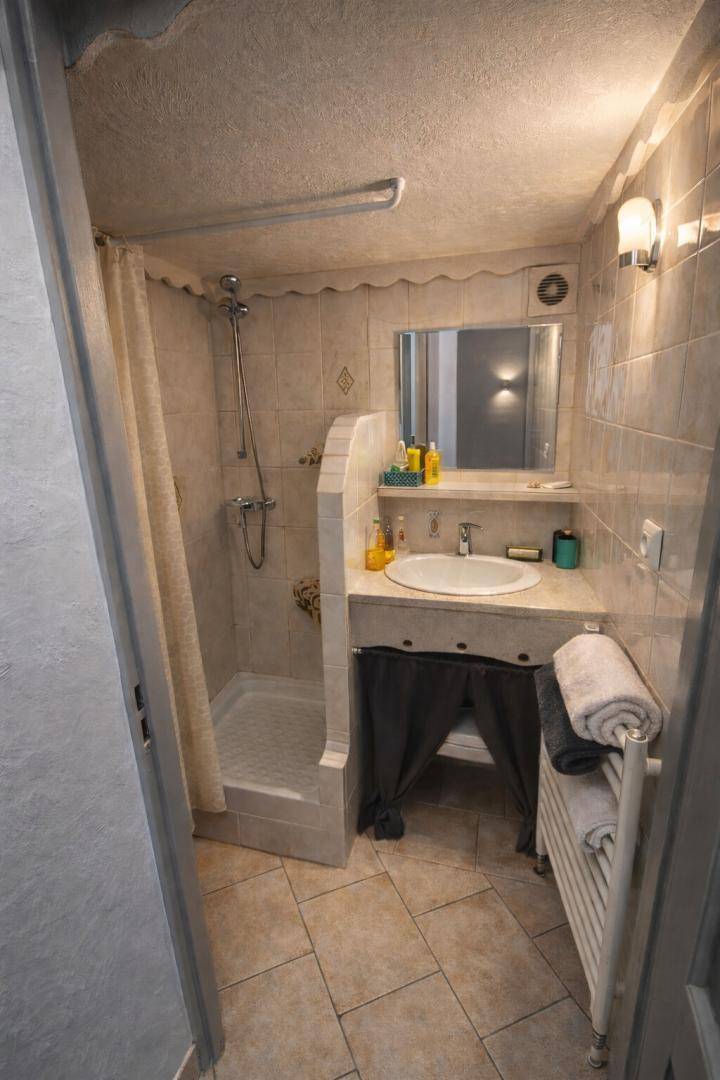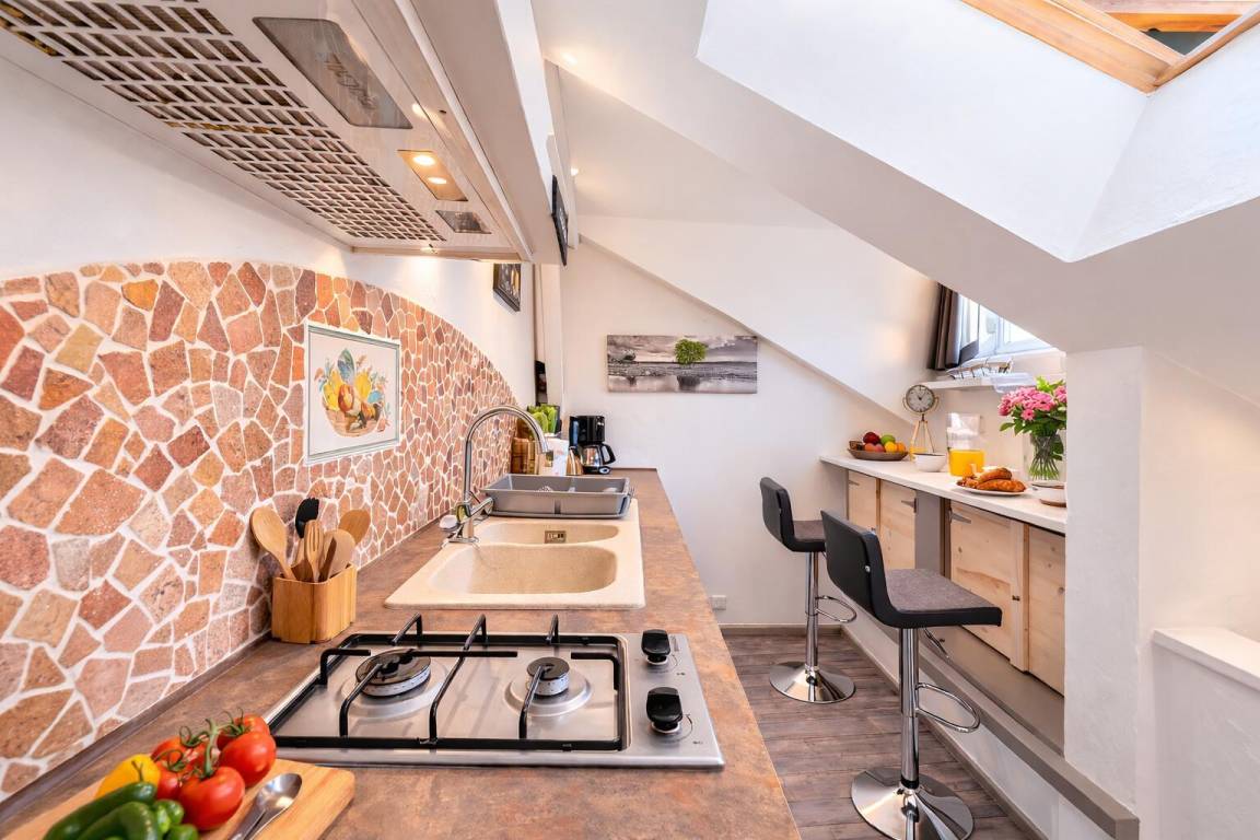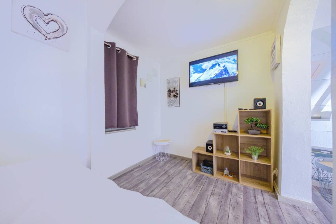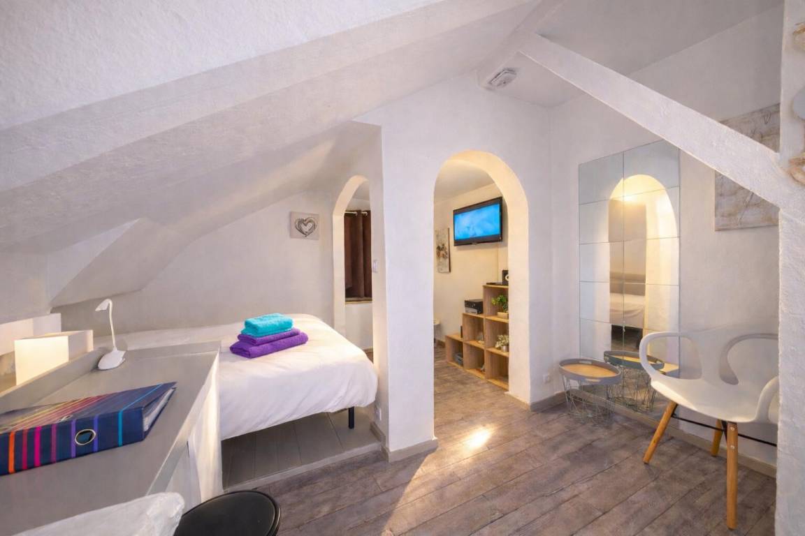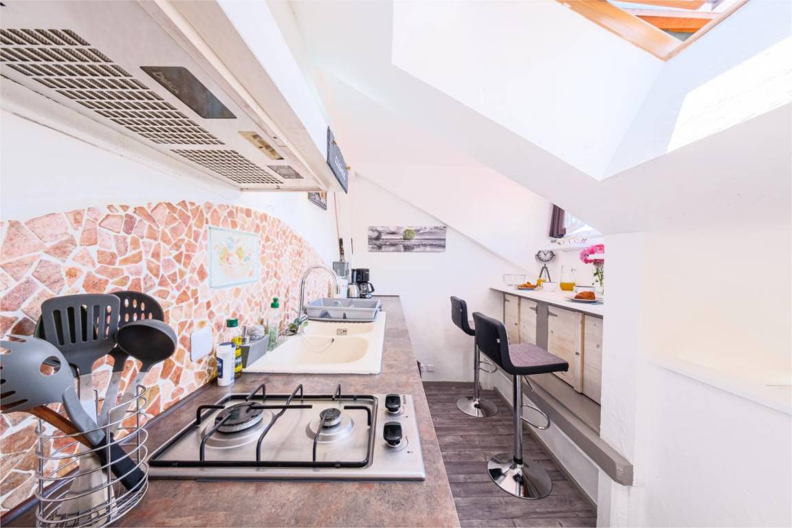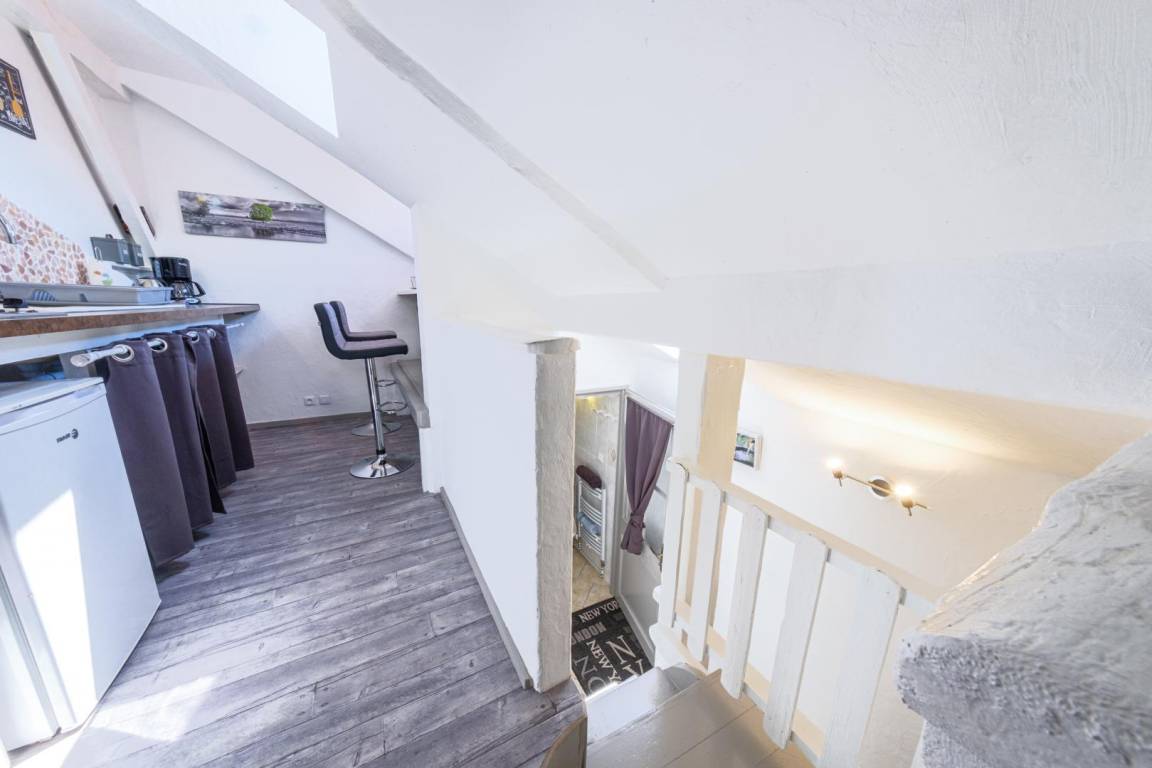 Maisonette-Studio bestehend aus im 1. Stock: einem Eingang, einem Badezimmer (Dusche und WC). Im 2. Stock befindet sich ein Dachgeschoss, das in einen Küchenbereich (Kühlschrank mit Konservator, 2 Gasbrenner, Mini-Backofen) mit Stehtisch und 2 hohen Hockern sowie ein Wohnzimmer (1 Doppelbett 160 x 200 cm) mit über Bluetooth verbundenem Fernseher umgewandelt wurde. Gesamtnutzfläche: 26 m² Dachgeschossteile inklusive.