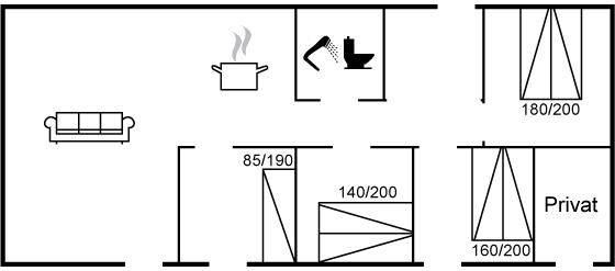SchlafverhältnisseDie Schlafplätze verteilen sich auf 4 Schlafräume. 6 Schlafplätze in Doppelbetten.1 Schlafplatz in einem Einzelbett.