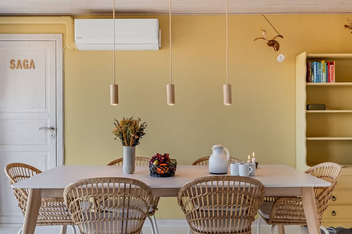 EinrichtungDas Ferienhaus eignet sich für 6 Personen sowie 1 Kleinkind bis zu 3 Jahren. Die Ferienunterkunft hat eine Wohnfläche von 97 m², ist 2-stöckig, und wurde 1996 gebaut. 2021 wurde die Ferienunterkunft teilweise renoviert. Es ist erlaubt 1 Haustier mitzubringen. Die Ferienunterkunft ist mit einer energiefreundlichen Luft-Luft-Wärmepumpe ausgestattet. Die Ferienunterkunft ist mit Waschmaschine ausgestattet. Wäschetrockner. Tiefkühlmöglichkeit mit 50 Liter Nutzinhalt. Für die jüngsten Feriengäste ist 1 Kinderhochstuhl vorhanden.