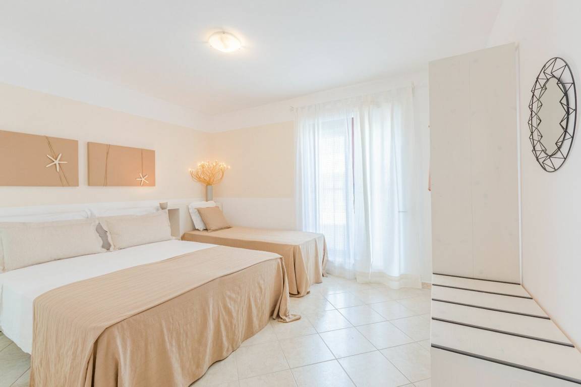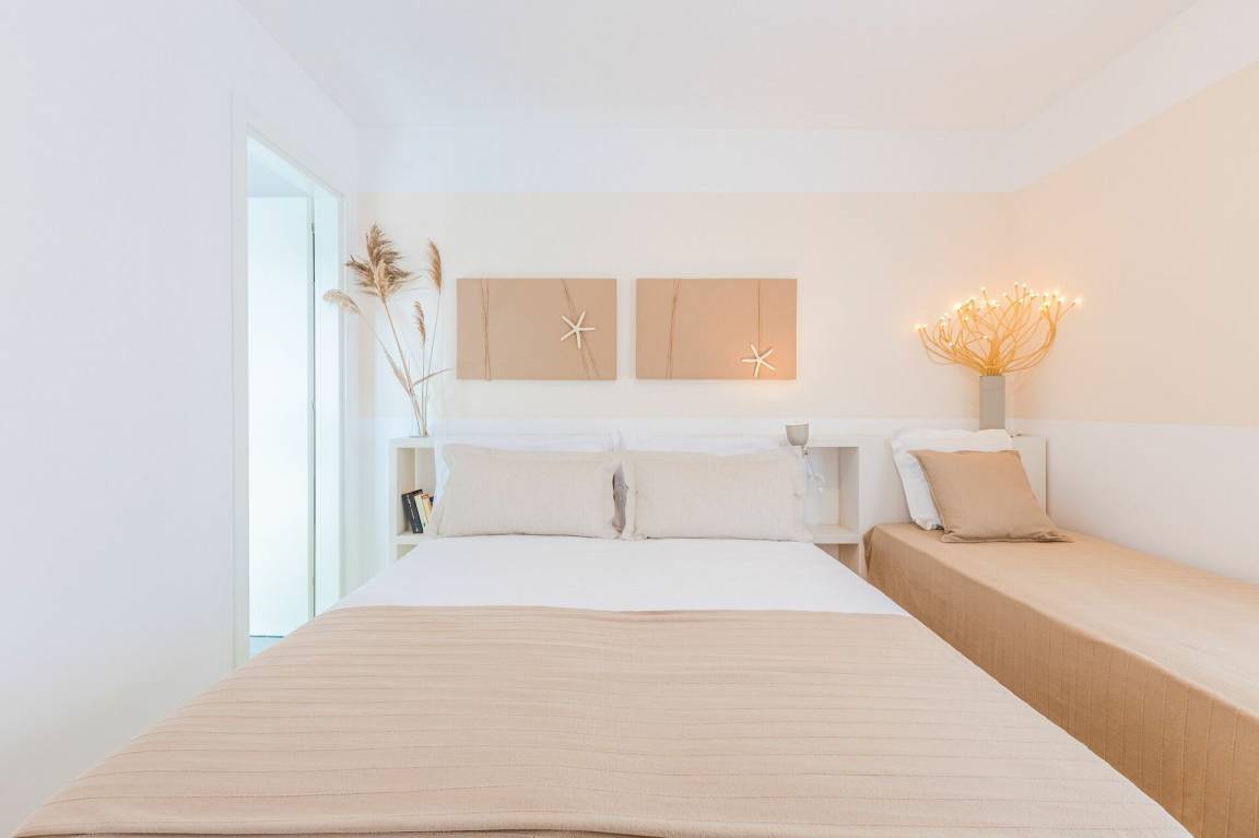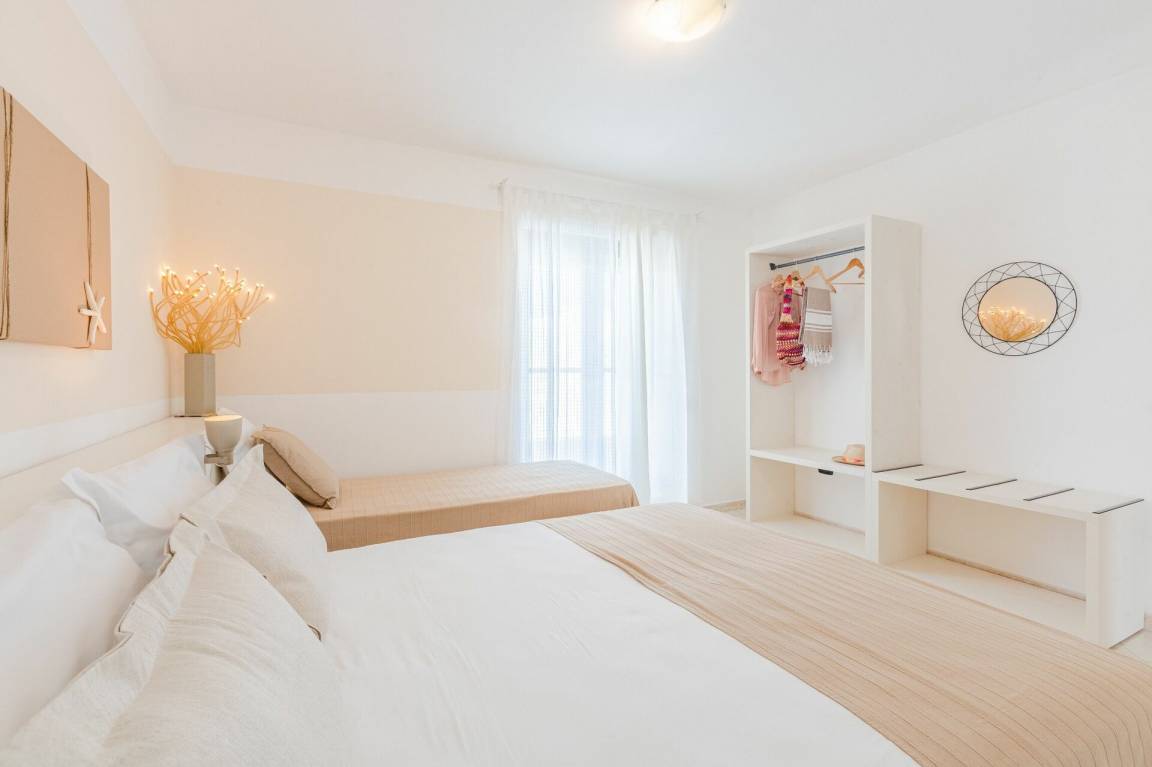 Schlafzimmer mit Bad: Doppelbett, Einzelbett, WiFi Internet, Internet, Waschbecken, WC, Bidet, Dusche, Fön, Waschmaschine.