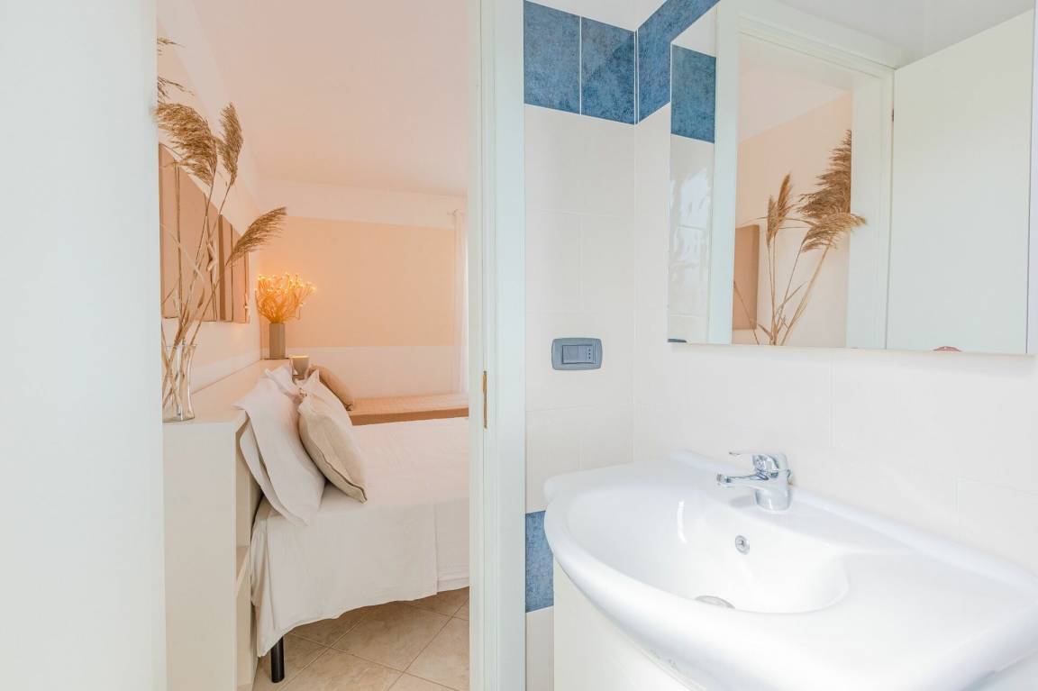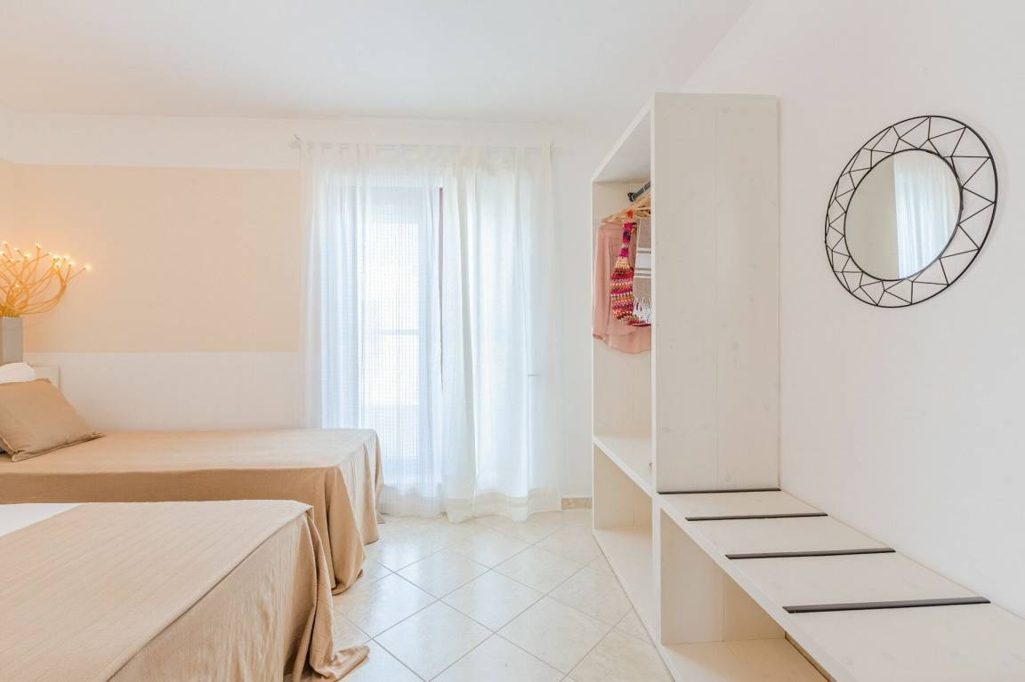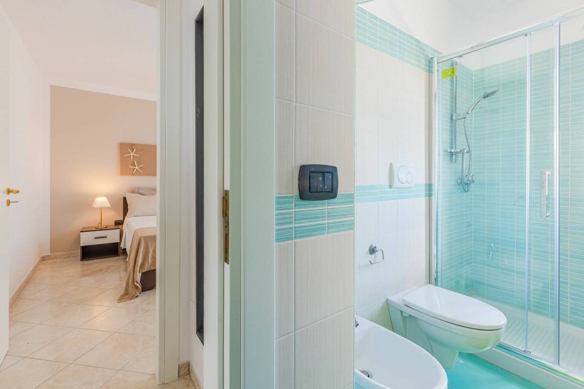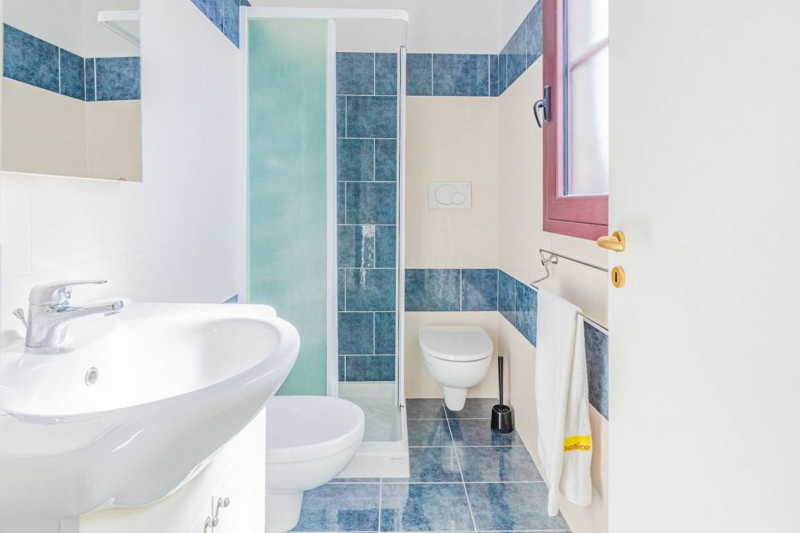Schlafzimmer mit Bad: Doppelbett, Einzelbett, WiFi Internet, Internet, Waschbecken, WC, Bidet, Dusche, Fön, Waschmaschine.