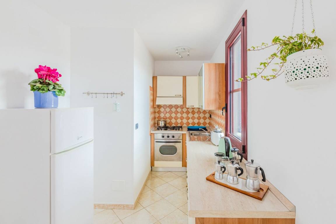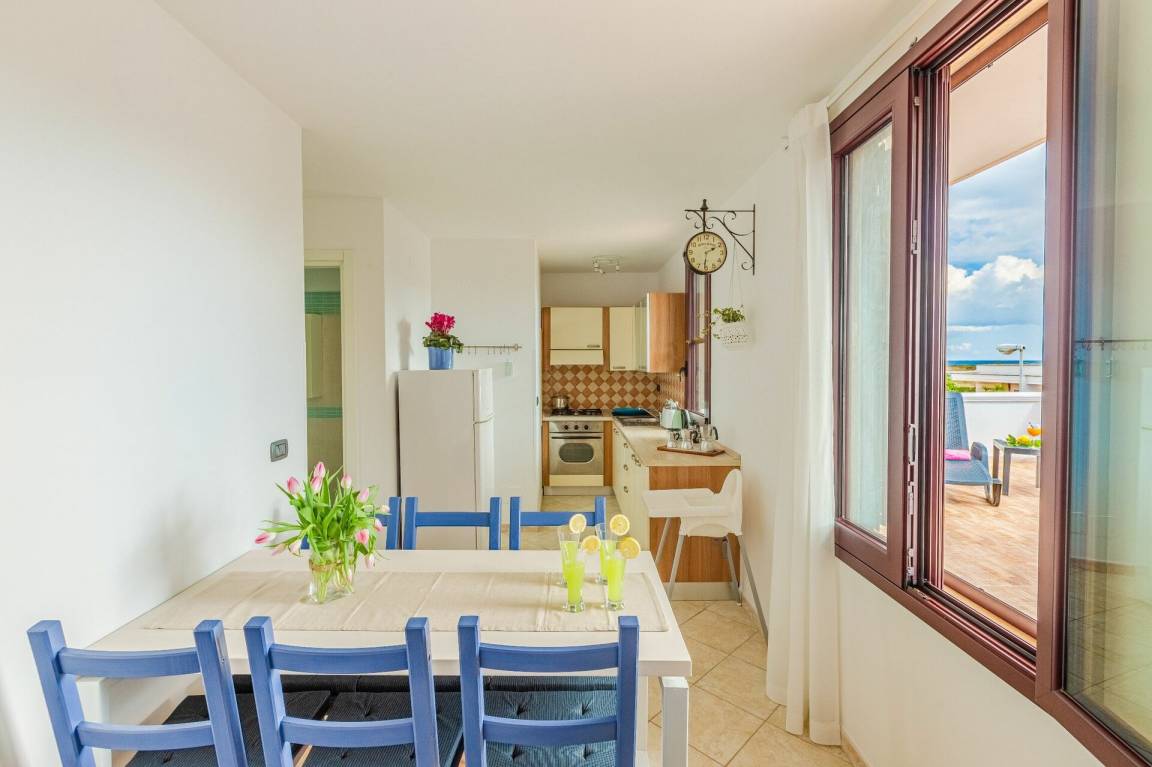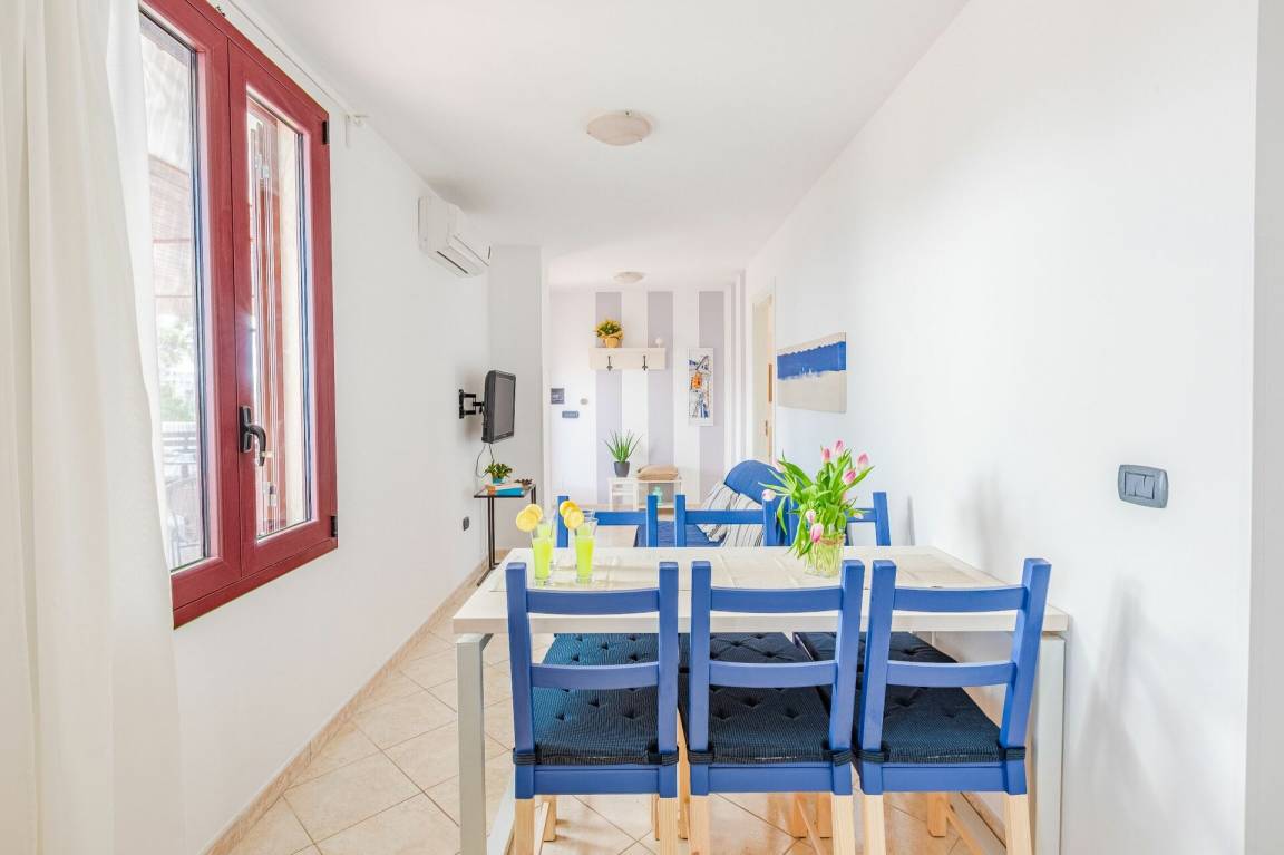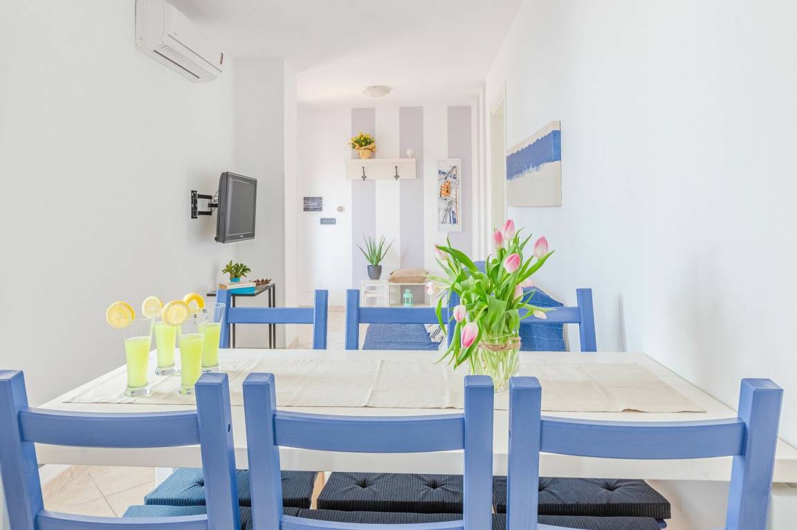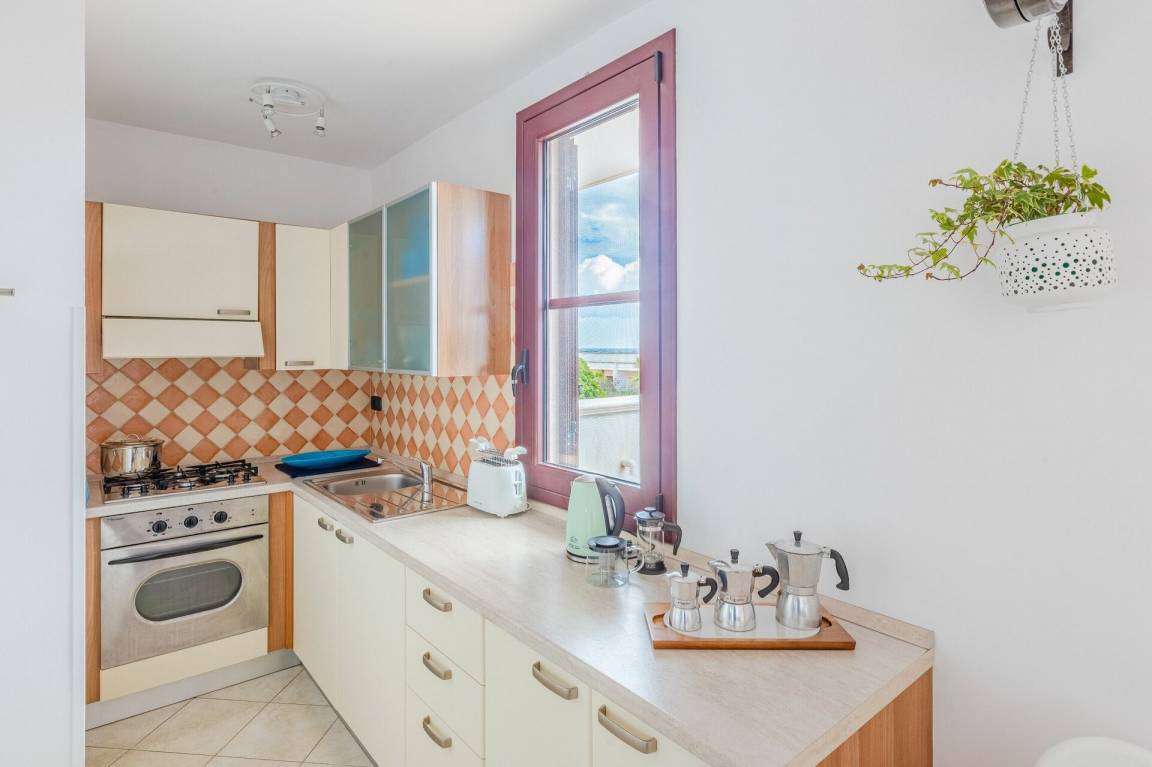 Wohnküche: gut ausgestattete Küche, Esstisch, Kühlschrank, Tiefkühler, Herd, Ofen, Sofa, WiFi Internet, Klimaanlage, TV, Ausgang auf die Terrasse.
