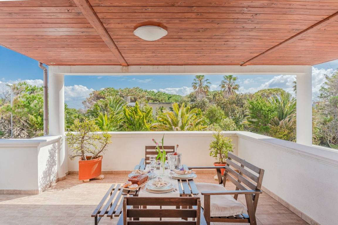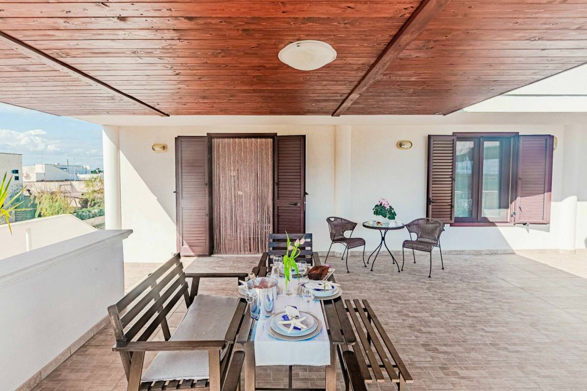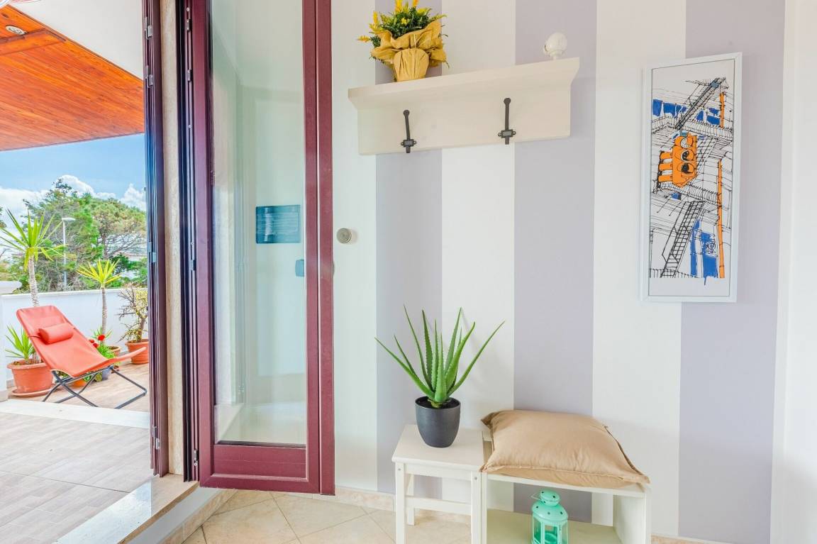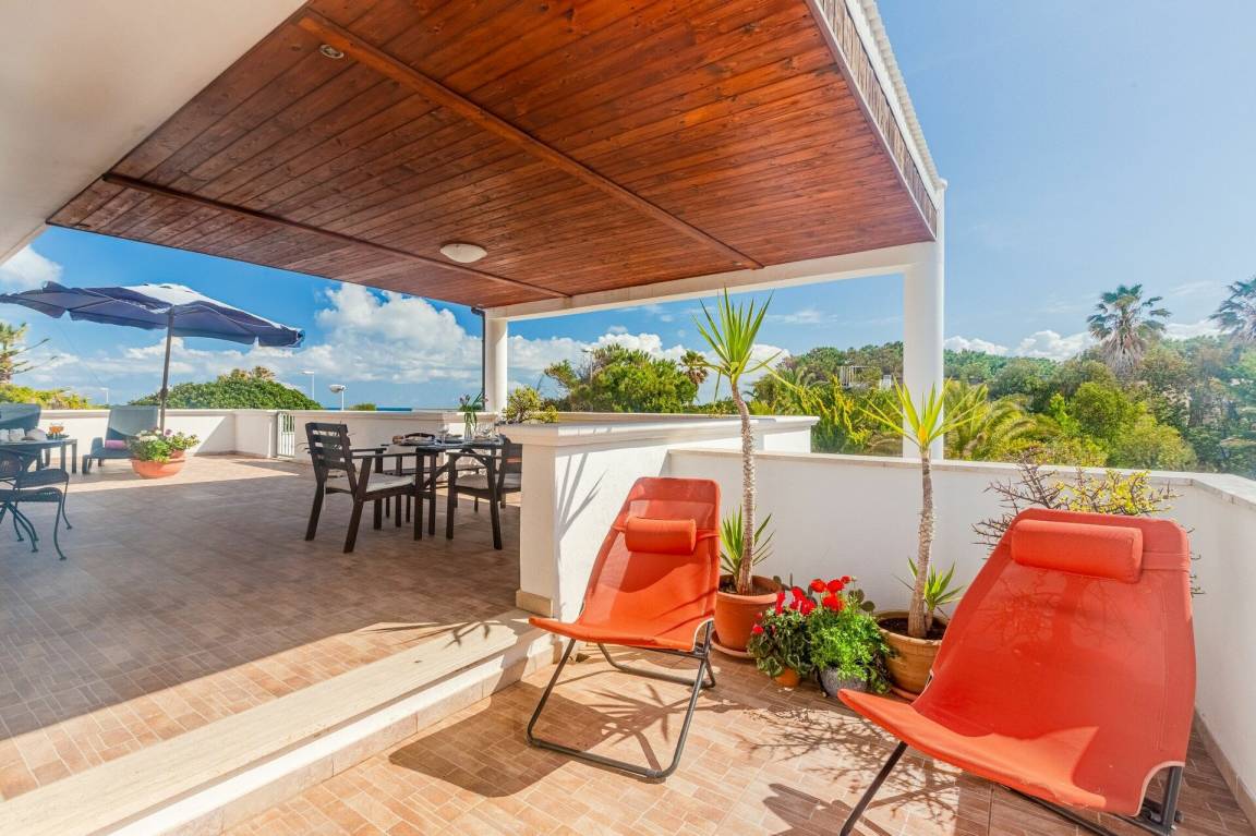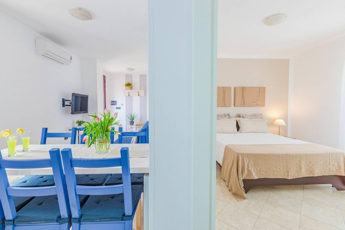 Wohnküche: gut ausgestattete Küche, Esstisch, Kühlschrank, Tiefkühler, Herd, Ofen, Sofa, WiFi Internet, Klimaanlage, TV, Ausgang auf die Terrasse.