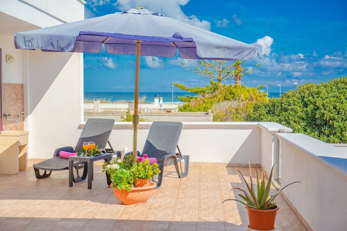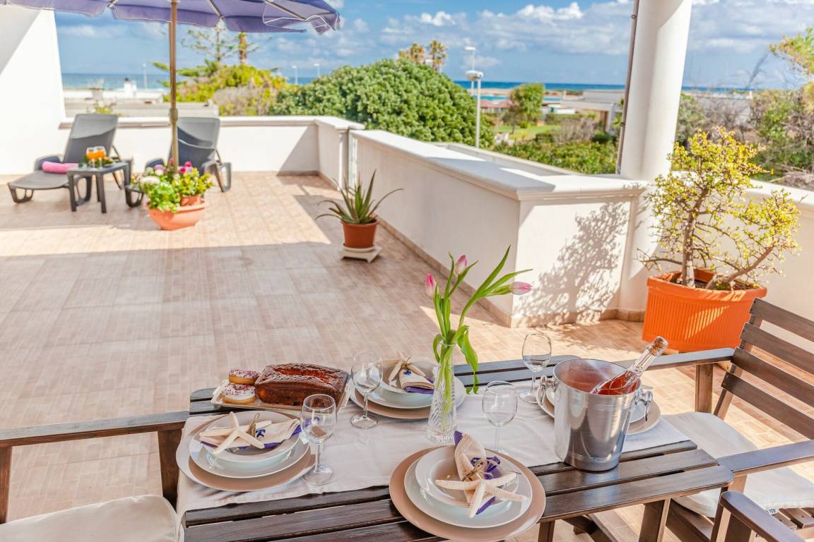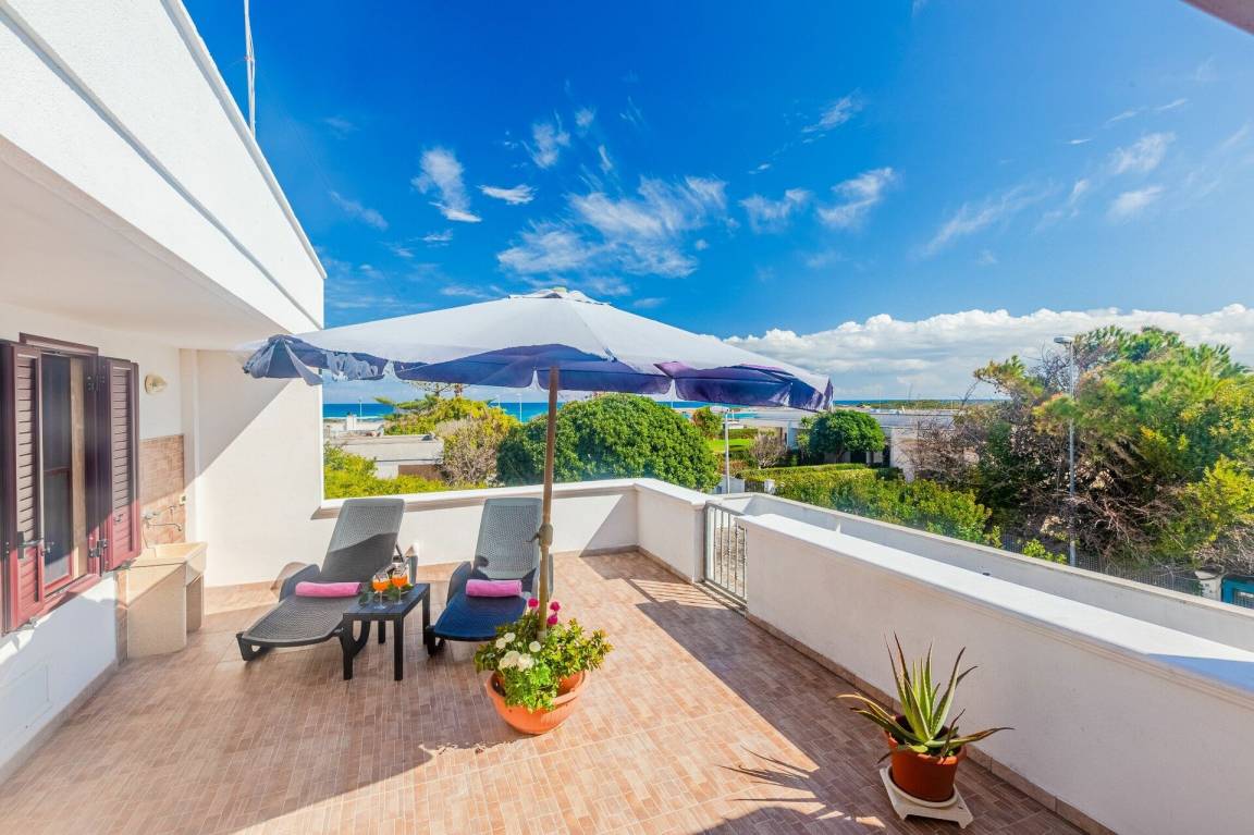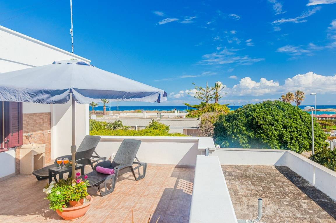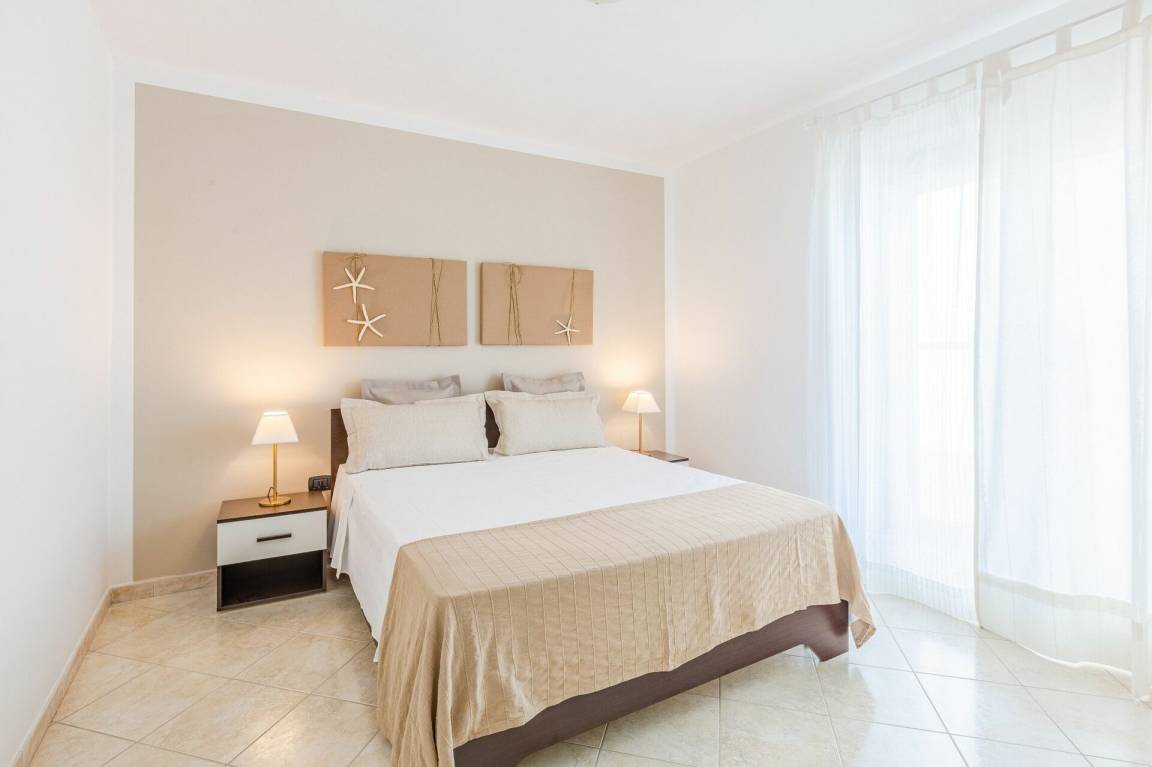 Wohnküche: gut ausgestattete Küche, Esstisch, Kühlschrank, Tiefkühler, Herd, Ofen, Sofa, WiFi Internet, Klimaanlage, TV, Ausgang auf die Terrasse.