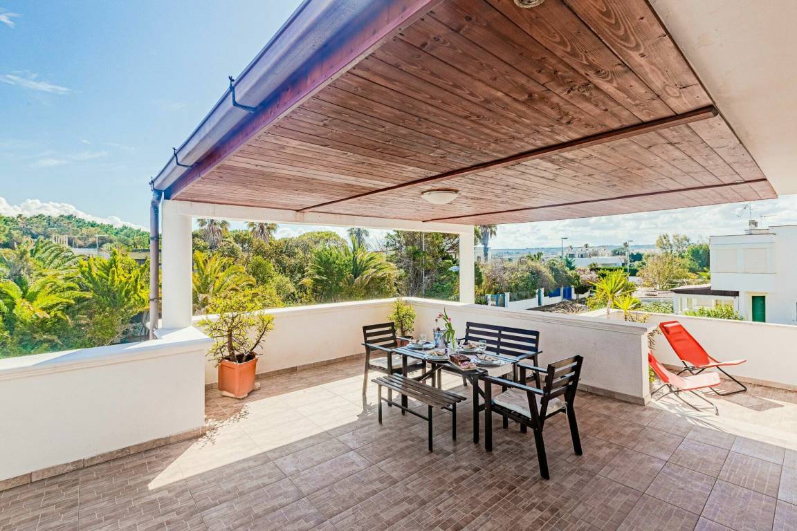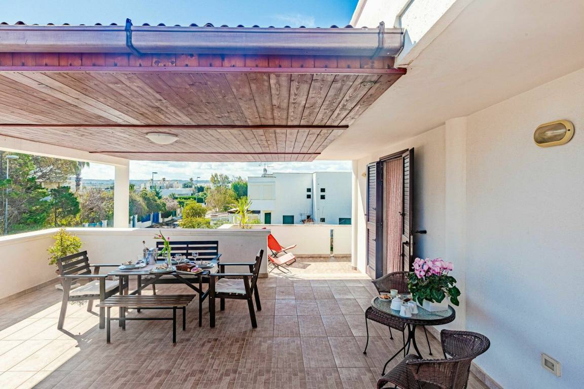 Veranda: Außenbereich für das Essen im Freien, Esstisch, Gartenmöbel, Terrassenmöbel.