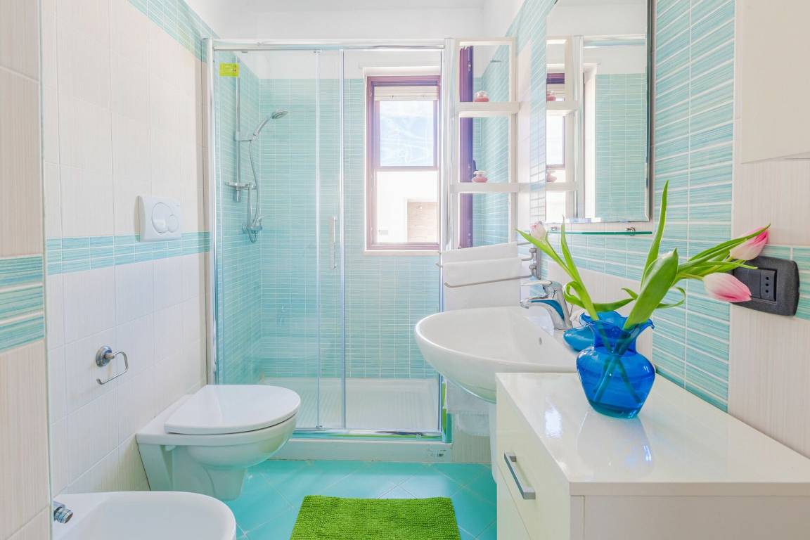 Badezimmer: Waschbecken, WC, Bidet, Dusche.