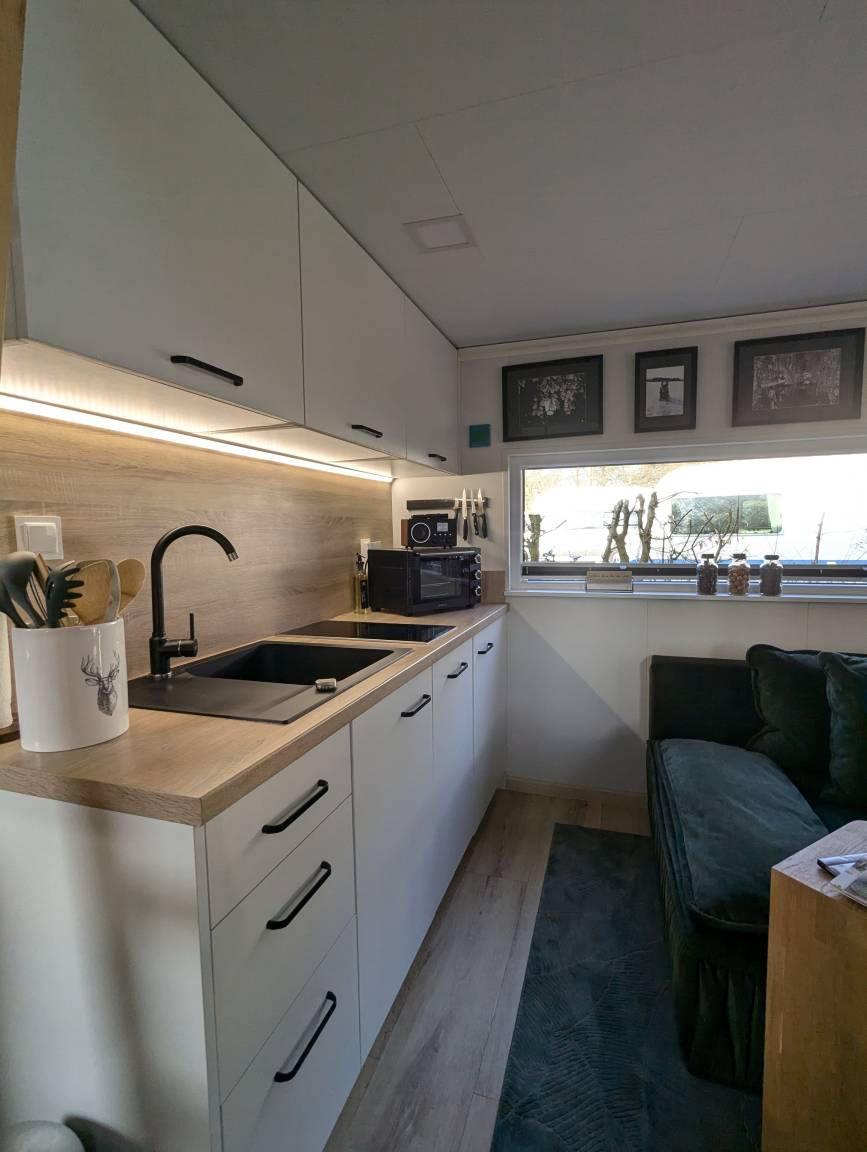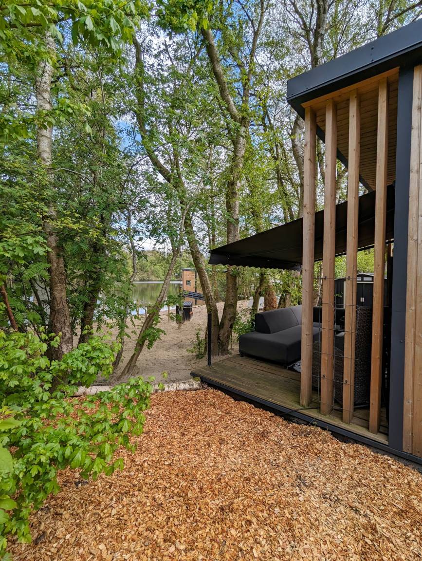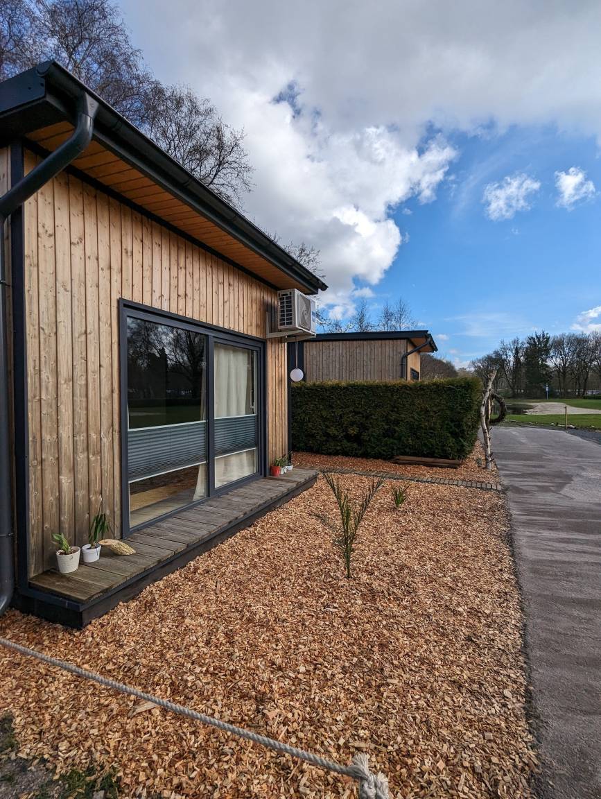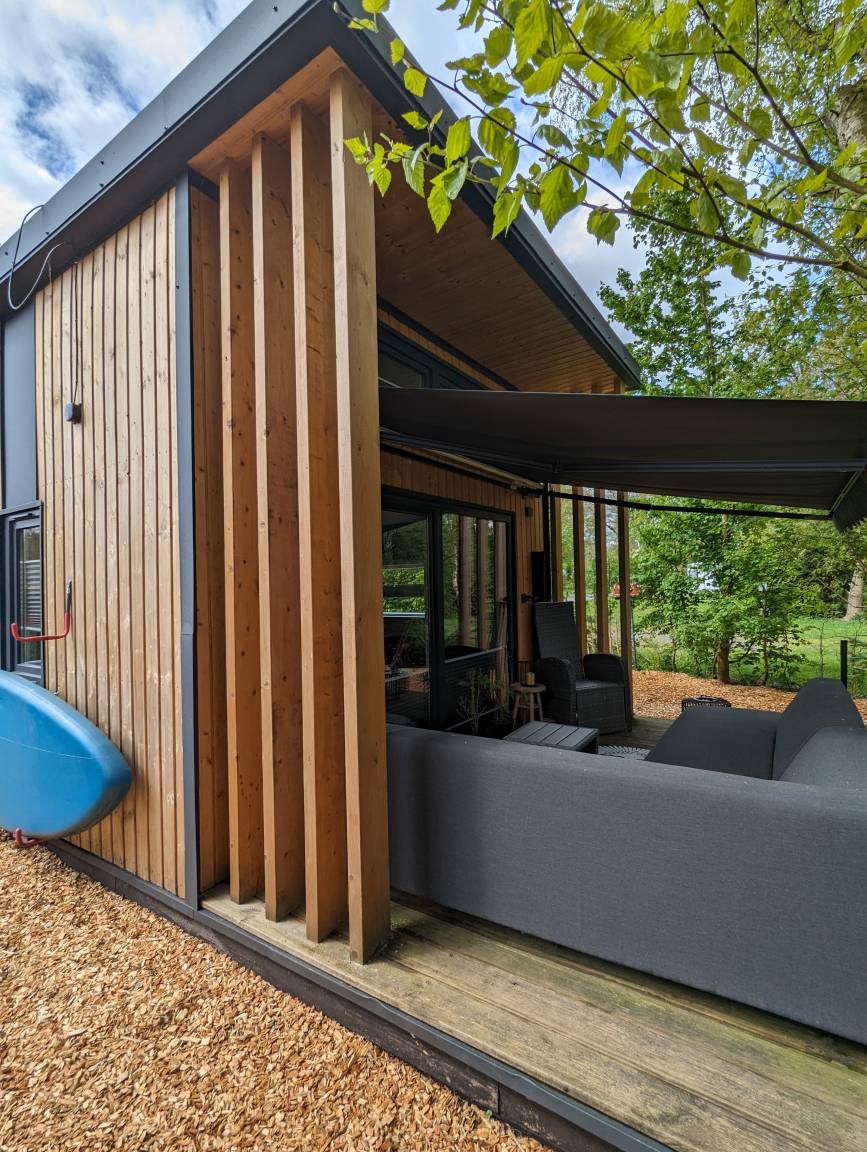 Unser Tinyhouse "Nelson" ist 32qm groß und liegt direkt am privaten Badestrand.
