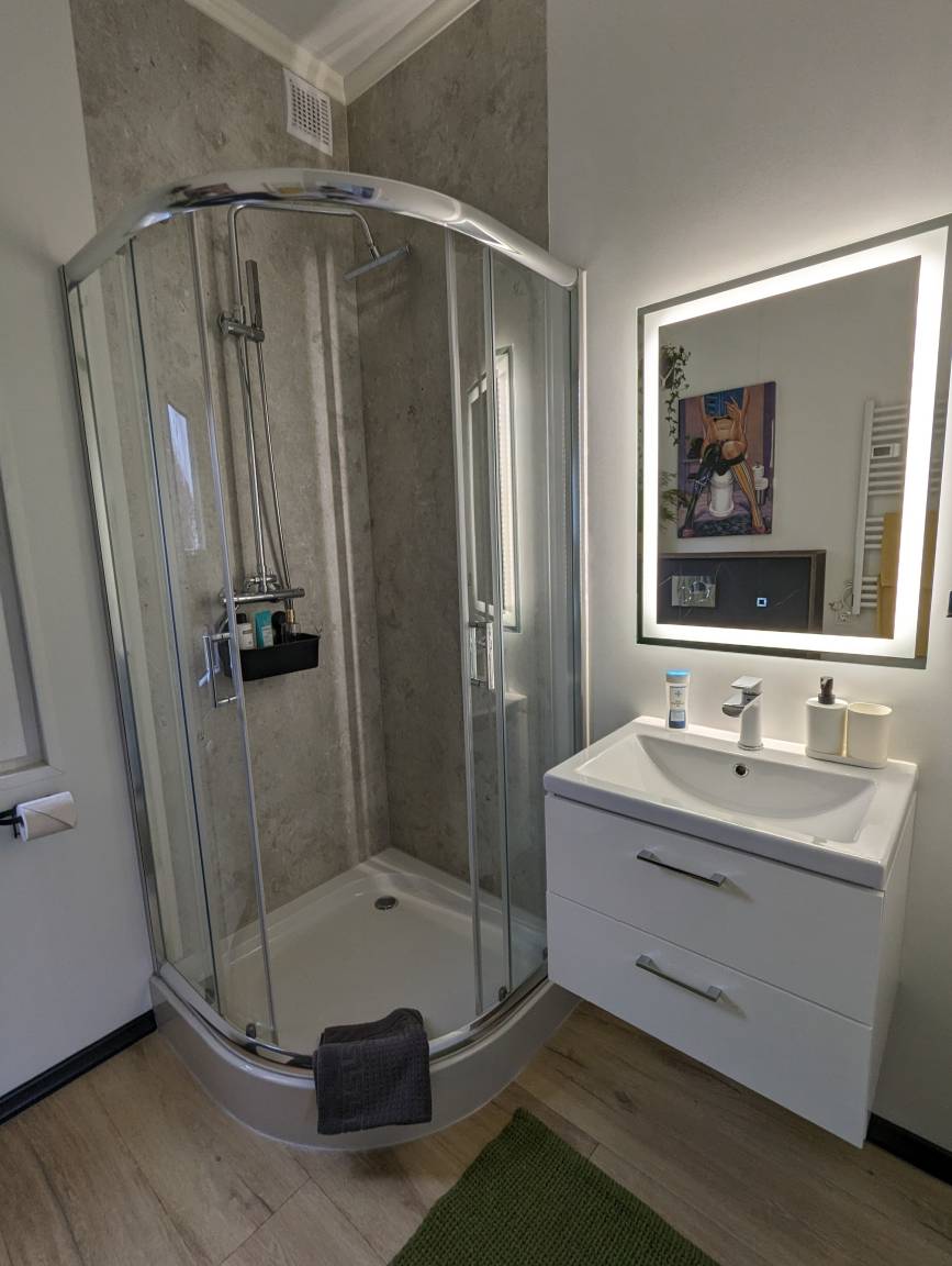 Das Tinyhouse hat ein seperates Schlafzimmer mit einem Doppelbett (180cm). Ein WC mit Dusche ist ebenfalls vorhanden und mit Shampoo und Handtüchern ausgestattet.