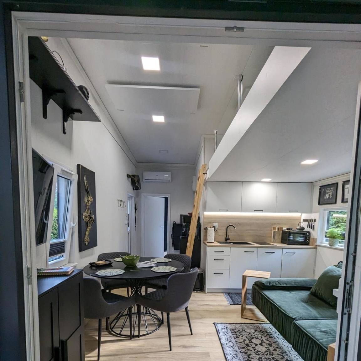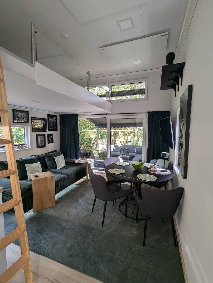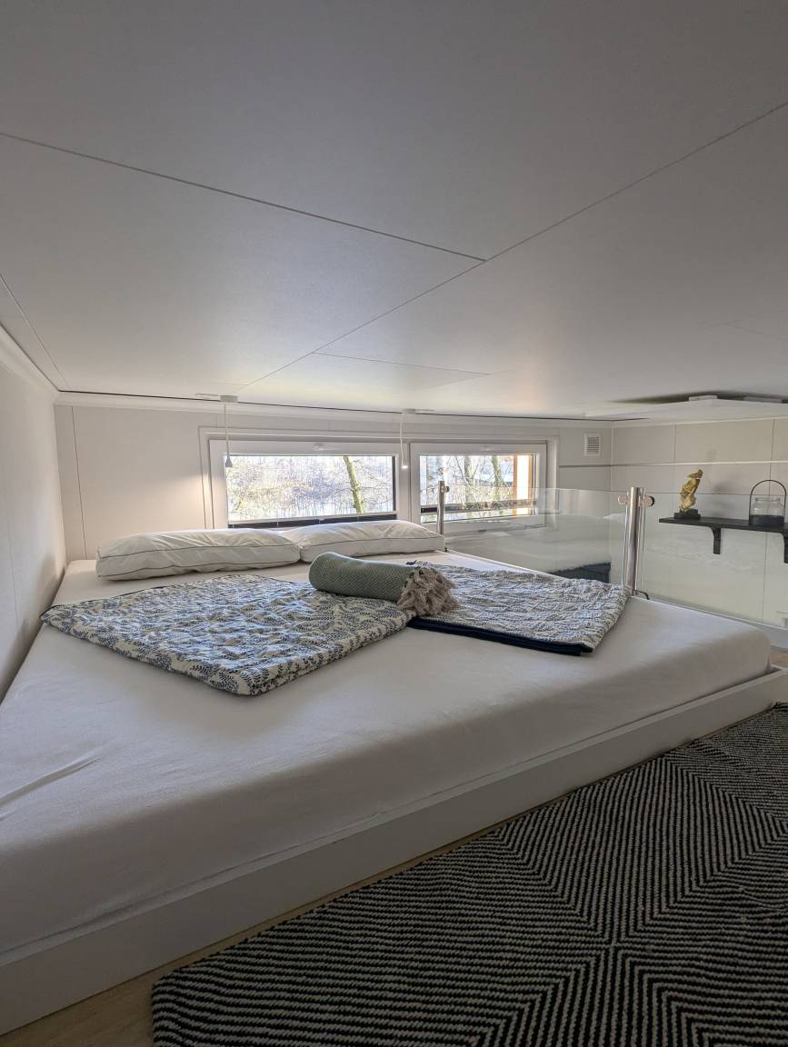 Über dem Wohnbereich geht es mit einer Leiter hoch zum Schlafloft. Dort finden weitere 2 Personen ein gemütliches Plätzchen mit dem Blick zum See(160cm Matratze). Alle Tinyhouses sind mit einer Klimaanlage und Infrarotheizung ausgestattet.