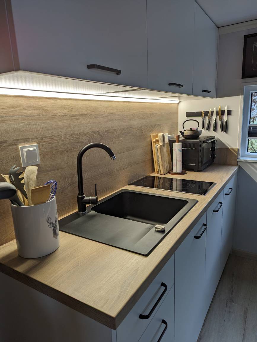 eine hochwertige und vollausgestattete Küchenzeile mit einem kleinen Backofen und einem
