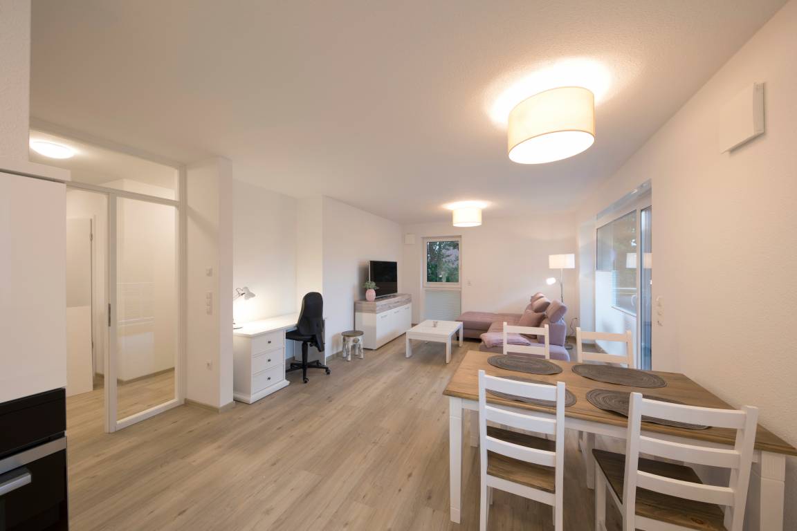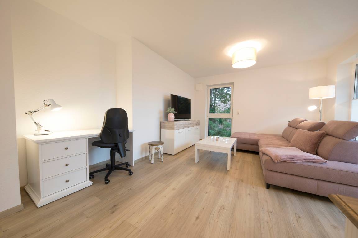 • offene, moderne, komplett ausgestattete Wohnküche mit gemütlichem Sofa, großem Smart-TV und Balkon