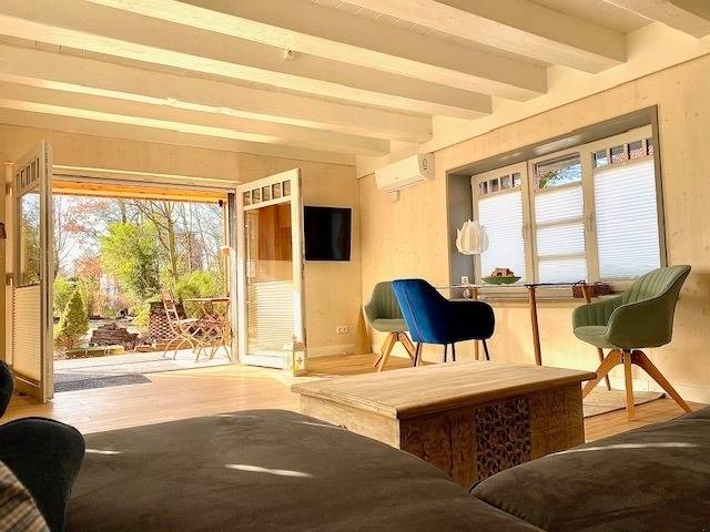 Der Wohnraum ist mit weiß lasierten Holzwänden und echtem Eichendielen- Boden mit Fußbodenheizung ausgestattet.