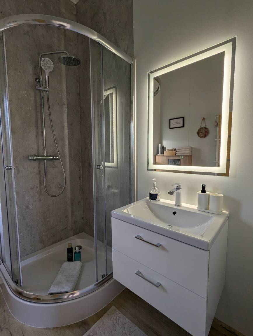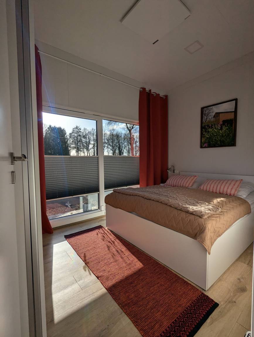 Das Tinyhouse hat ein seperates Schlafzimmer mit einem Doppelbett (160cm). Ein WC mit Dusche ist ebenfalls vorhanden und mit Shampoo und Handtüchern ausgestattet.