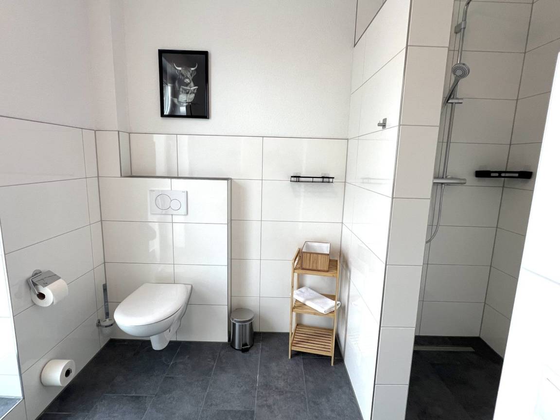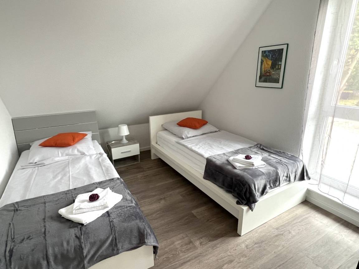 Wir bieten unseren Gästen eine komplett eingerichtete 73 qm große Ferienwohnung. Diese Wohnung befindet sich im DG und ist über eine Treppe zu erreichen. Hier fühlen Sie sich wie zuhause. Die Unterkunft ist modern und hell ausgestattet. Hier ist Platz für die ganze Familie. Es handelt sich um ein Mehrfamilienhaus mit 4 Wohneinheiten. Das Haus wurde 2023/2024 nach den neuesten Bauvorschriften im KfW 55 Standard erbaut. Die Wohnungen werden über Wärmepumpen beheizt. Die voll ausgestattete Wohnung verfügt über 2 Schlafzimmer mit jeweils 2 Einzelbetten. Im Wohn-, Küchenraum wurde eine voll eingerichtete neue Einbauküche mit Spülmaschine, Backofen, Herd, Kühlschrank mit Gefrierfach, Mikrowelle usw. eingebaut. Kaffeemaschine und Wasserkocher gehören ebenso zur Ausstattung wie Toaster und Eierkocher. Der Wohnraum ist mit einem großen Flachbild-TV ausgestattet. Kostenloses Wlan ist selbstverständlich. Das geräumige Badezimmer mit ebenerdiger begehbarer Dusche lässt keine Wünsche offen. Für längere Aufenthalte befindet sich entsprechendes Equipment wie Waschmaschine, Bügelbrett und Bügeleisen im Abstellraum. Handtücher, Bettwäsche, Duschgel, Shampoo usw. steht Ihnen kostenlos zur Verfügung. In den Sommermonaten stehen ein Grill sowie Gartenmöbel mit Sonnenschirm auf der großen Dachterrasse bereit. Ein kostenloser Parkplatz befindet direkt am Haus. Es ist an alles gedacht.