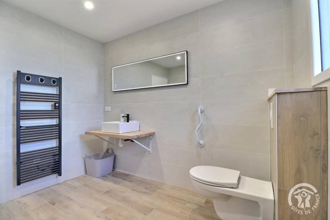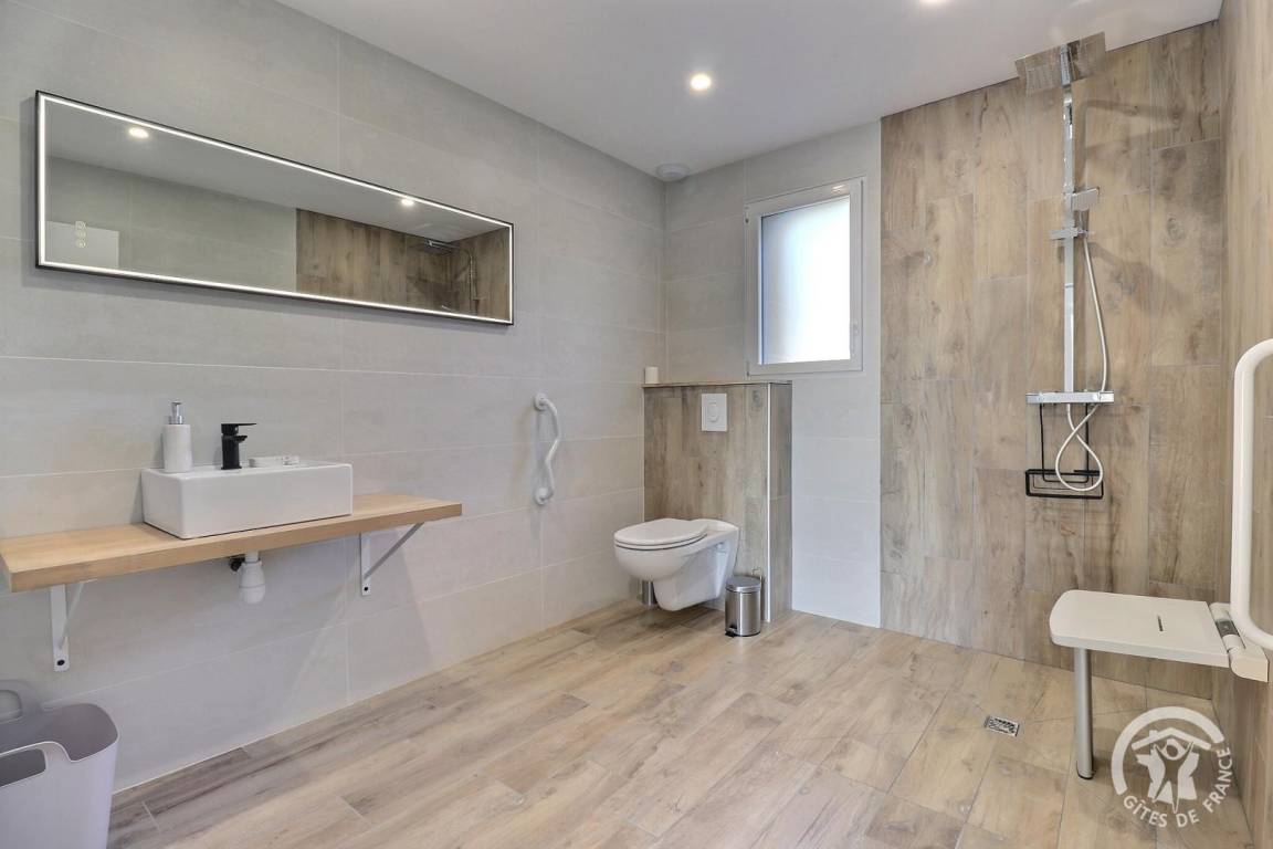 - ein für Personen mit eingeschränkter Mobilität geeignetes Badezimmer mit WC