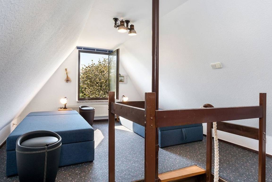 ◦großes Schlafzimmer mit zusammenschiebbaren Einzelliegen (Federkern) - dieses Zimmer ist ein Durchgangszimmer mit dem Wendeltreppen-Zugang von unten.