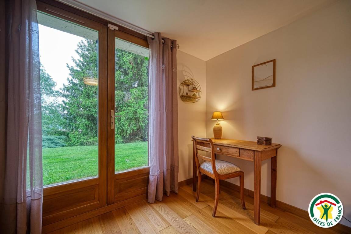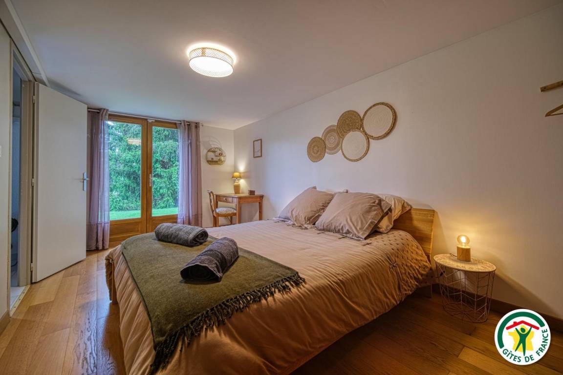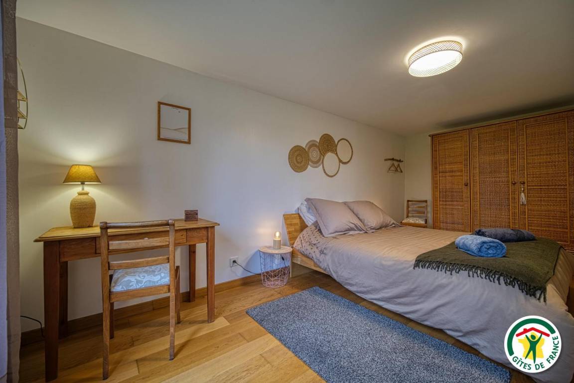 Sie profitieren von einem 15 m² großen Schlafzimmer mit einem großen 160 x 200 cm großen Bett und Schreibtisch, ideal für Telearbeit.