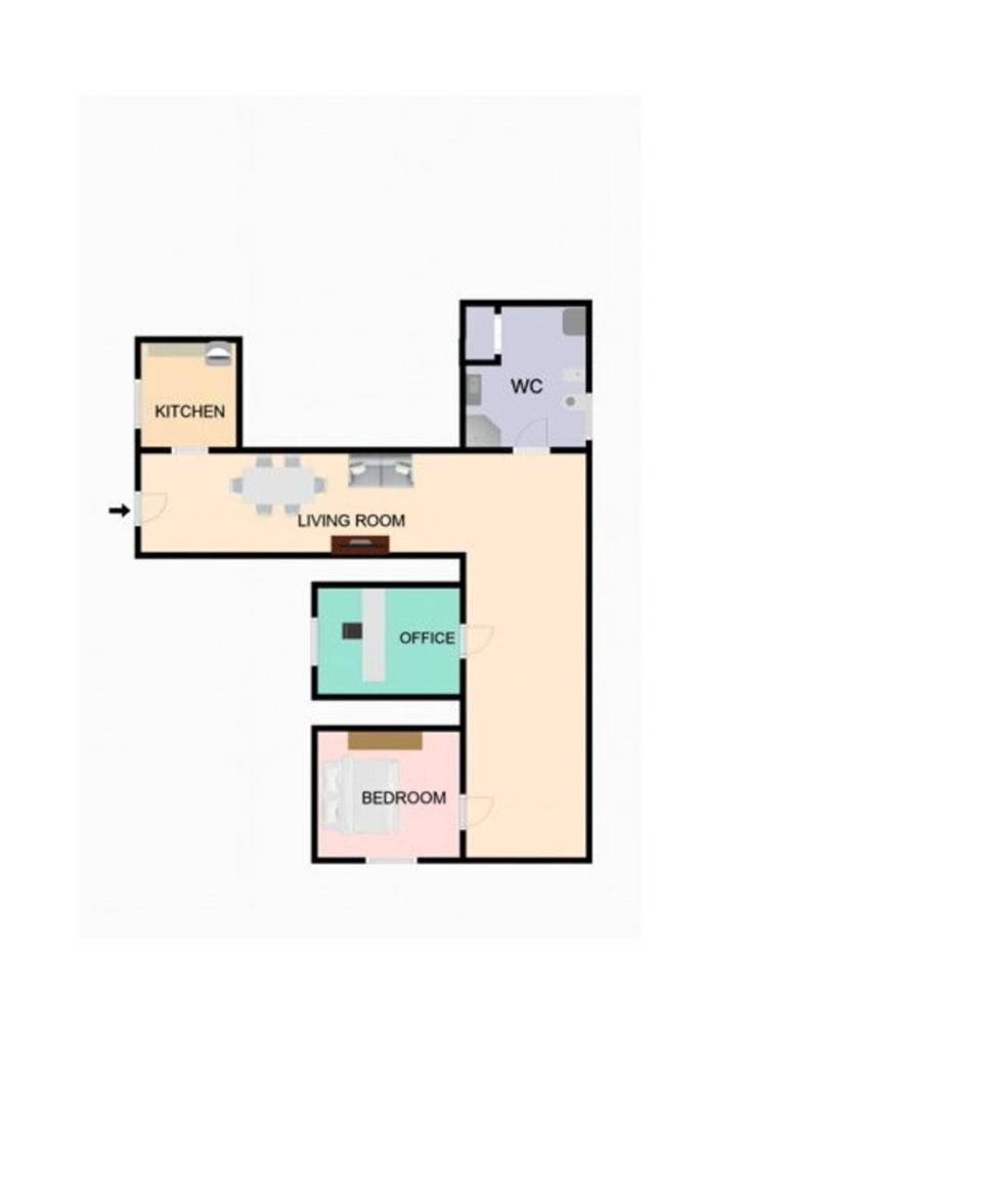 Mit Wohnküche, Schlafzimmer, Badezimmer, Arbeitszimmer.