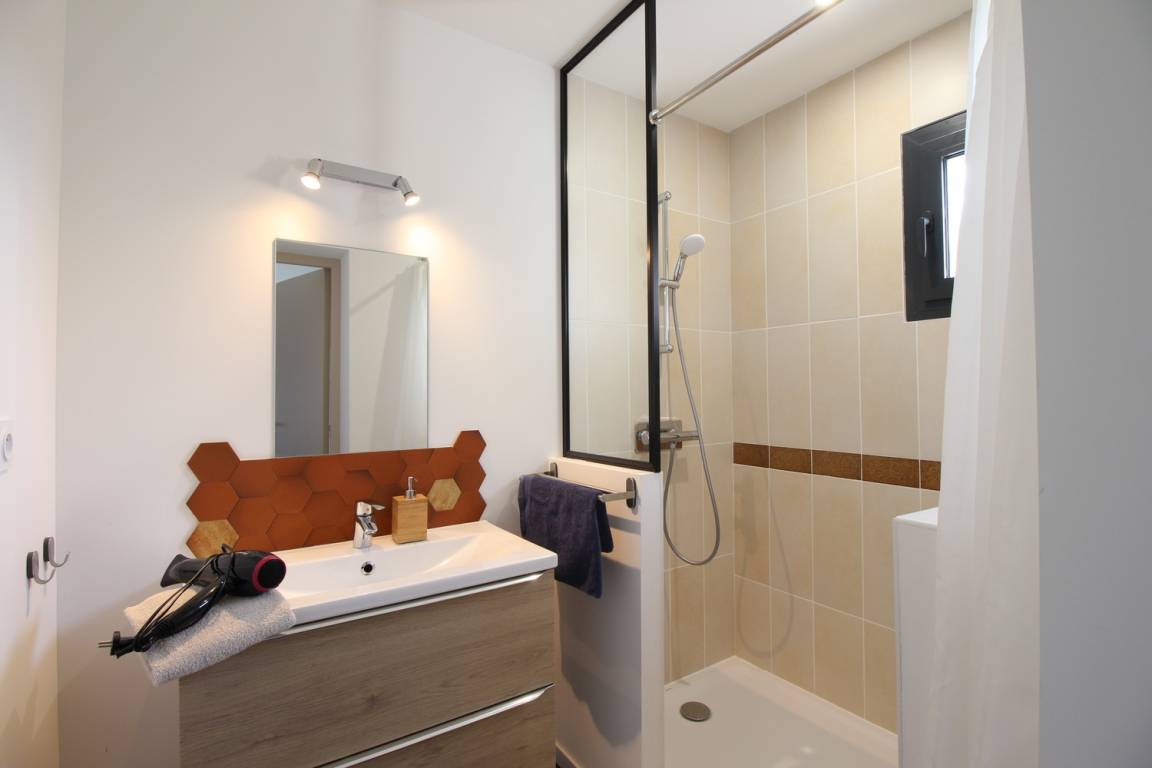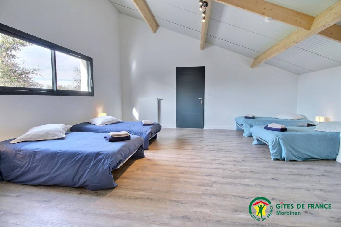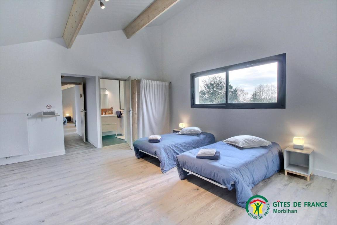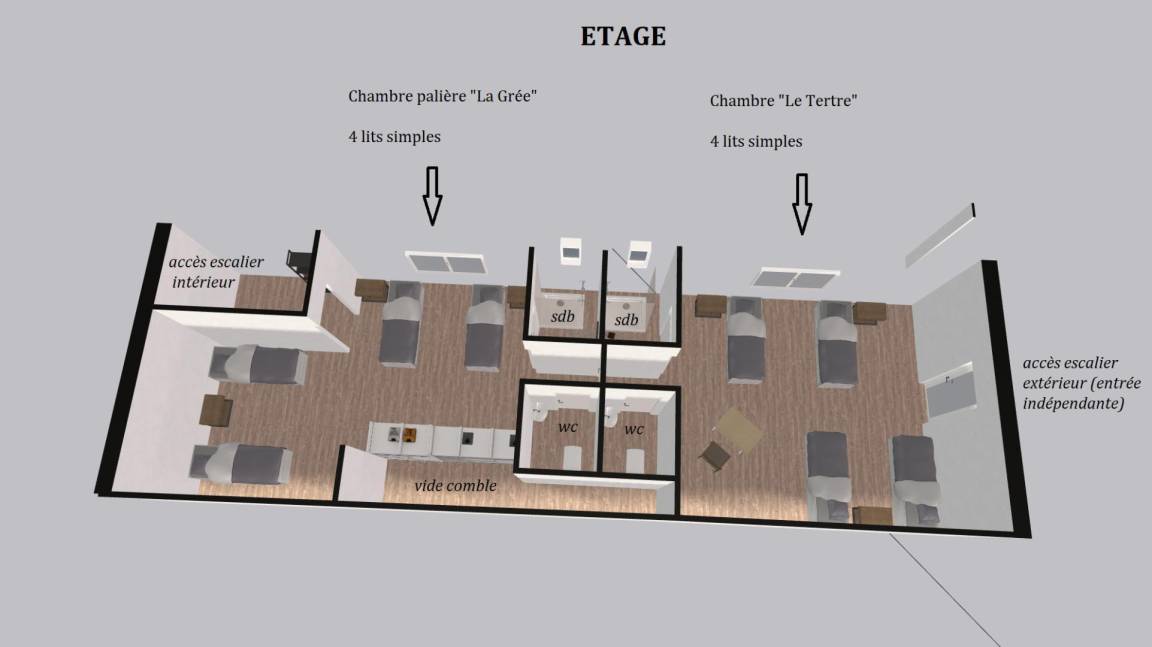 -Obergeschoss: 2 große Schlafzimmer mit jeweils 4 Einzelbetten, eines vom Haus zugänglich, das andere von außen zugänglich und das andere Schlafzimmer. Jedes Schlafzimmer hat ein eigenes Badezimmer mit separatem WC, mit Ausnahme des Schlafzimmers für 3 Personen (mit barrierefreiem Zugang), für das sich das WC im Badezimmer befindet.