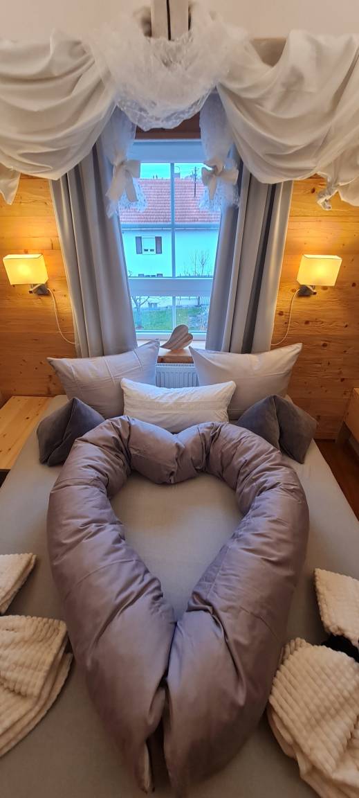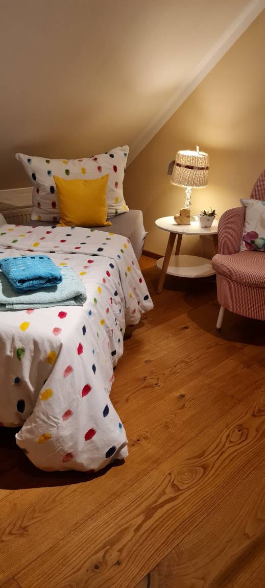 Das gemütliche Schlafzimmer mit offenen Sichtdachstuhl und 2 hochwertigen Boxspringbetten und verschiedenen Kissen lässt es sich erholsam träumen.
