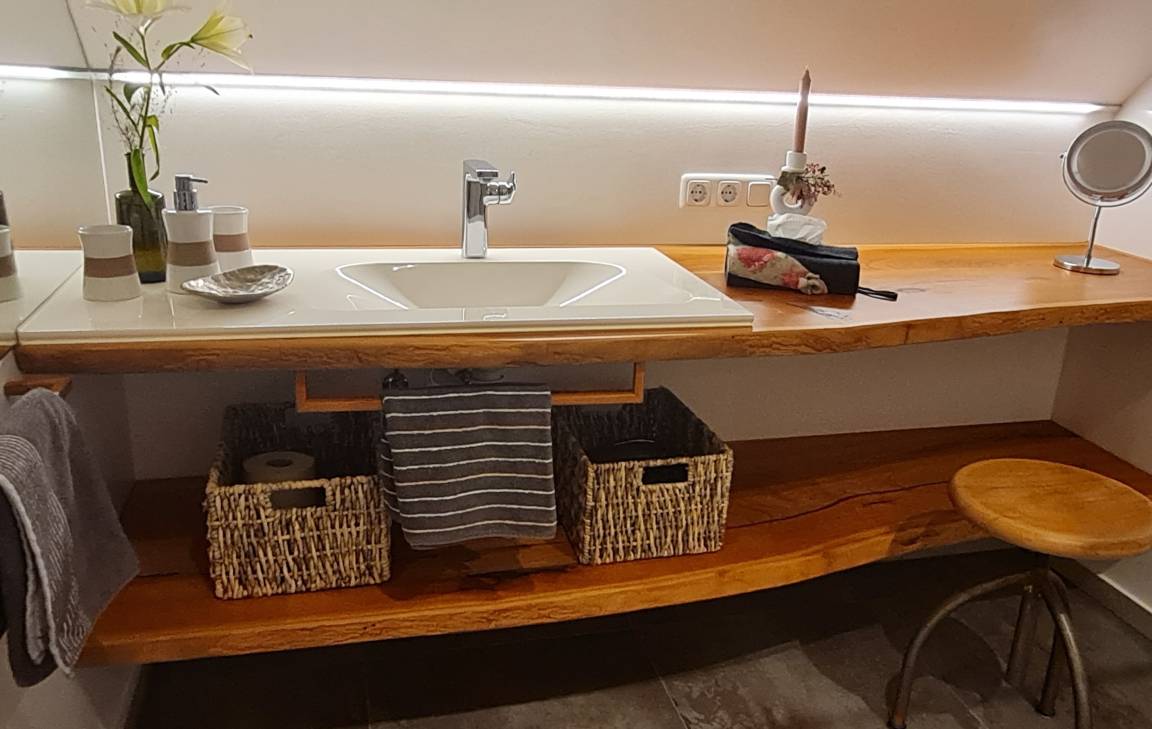 Das moderne geräumige Duschbad im Industrie Look mit Regendusche und Kirschholz Waschtisch,