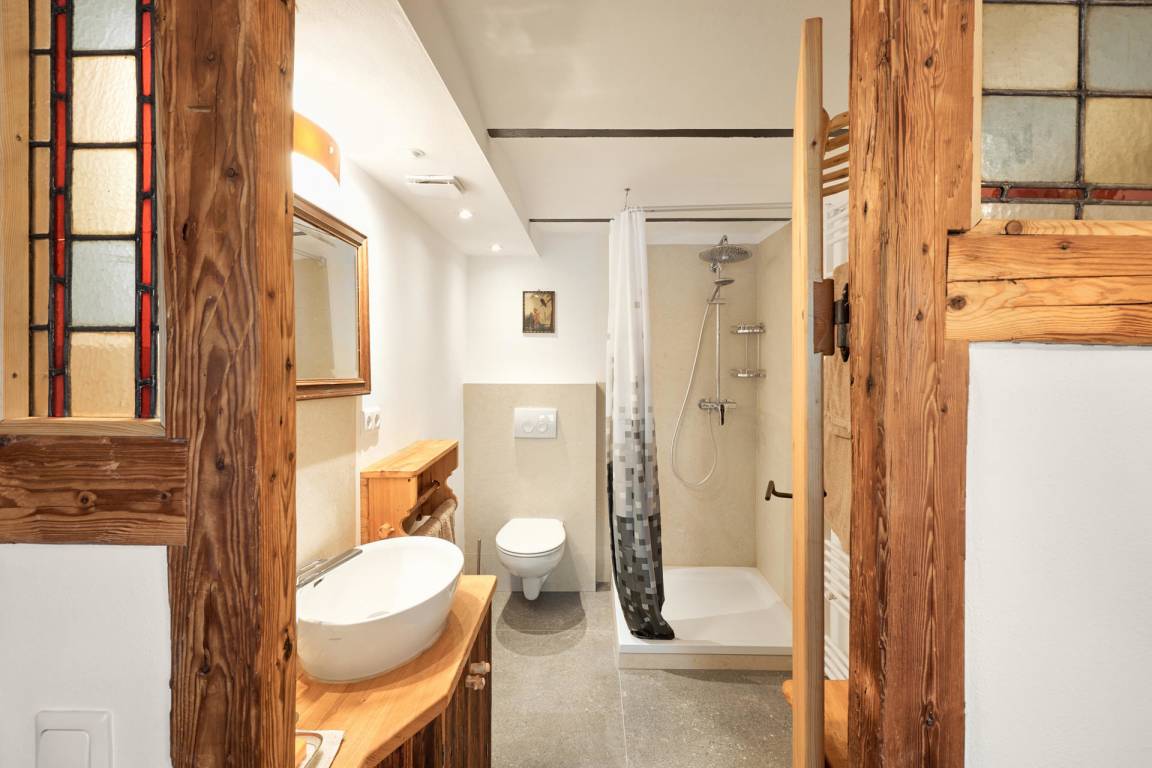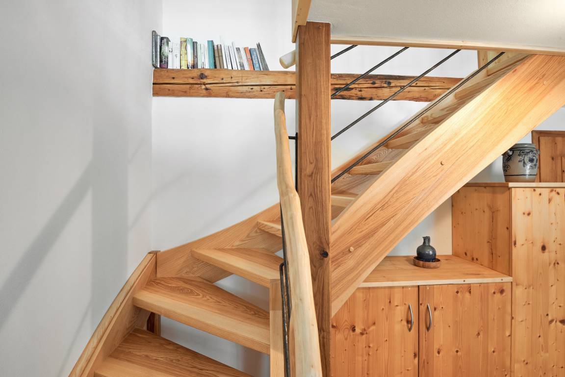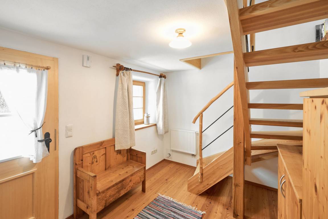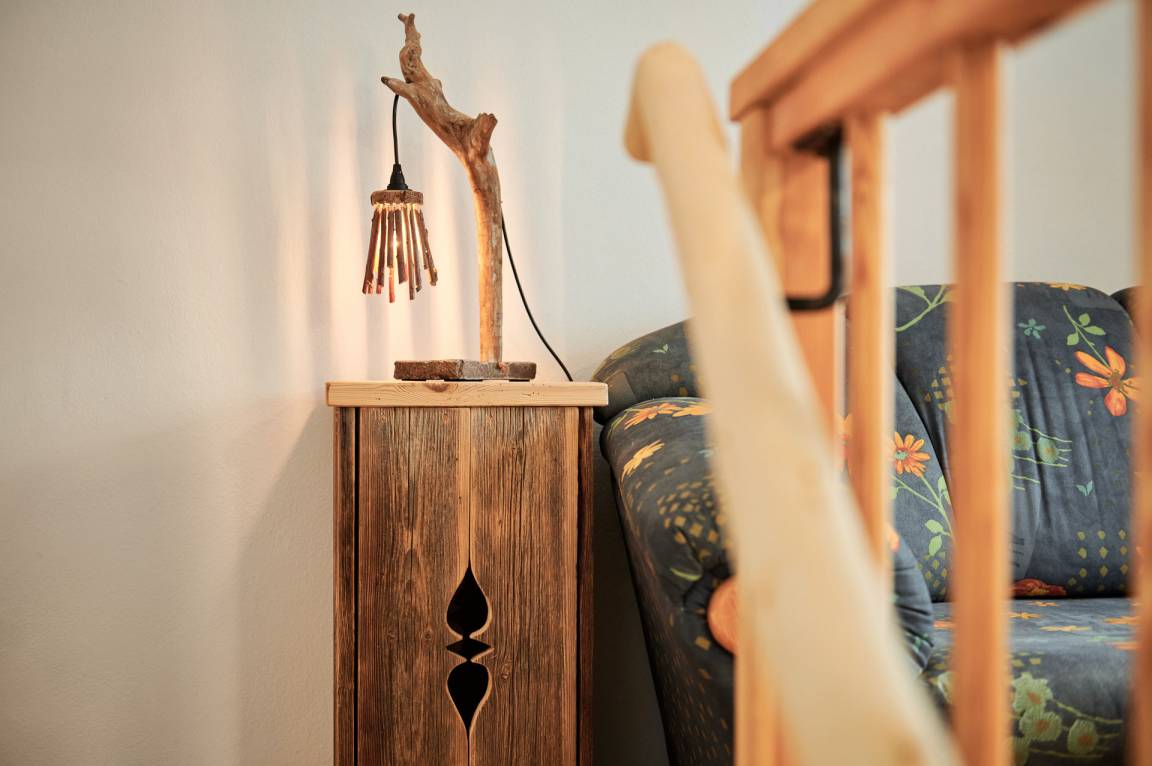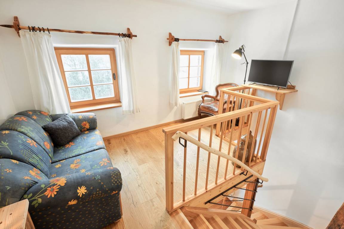 Die Wohnung "Beim Sattler" verfügt im Erdgeschoß über einen Wohn-/Essraum mit komplett eingerichteter Küchenzeile. Das Bad ist mit Dusche/WC, Waschtisch und Fön ausgestattet. Über die Diele mit Garderobe und Schuhbank erreicht man den 1. Stock. Dort befindet sich das Schlafzimmer mit großem Doppelbett ( 2x2 Meter/hochwertige Matratzen), Kleiderschrank und großer Kommode. Bei Bedarf kann ein Kindergitterbett für ein Kleinkind gemietet werden. Zwischen Schlafzimmer und Treppe wurde eine offene Loggia mit Fernseher und Leseraum eingerichtet. Dort steht eine Schlafcouch (1,25 x 2 m) für eine weitere Person zur Verfügung. Die gesamte Ferienwohnung ist mit geölten Holzböden ausgestattet (Ausnahme im Bad), liebevolle Details sorgen für eine "heimelige" Atmosphäre. Direkt vor dem eigenen Eingang liegt die Ostterrasse mit Sitzgelegenheit und Grill, ein kleiner Garten sowie der KFZ- Stellplatz. Für Fahrräder oder Ski ist ein abschließbarer Abstellraum vorhanden. Achtung - für kleine Kinder besteht eine erhöhte Aufsichtspflicht, da sich direkt nebenan unser Teich befindet.