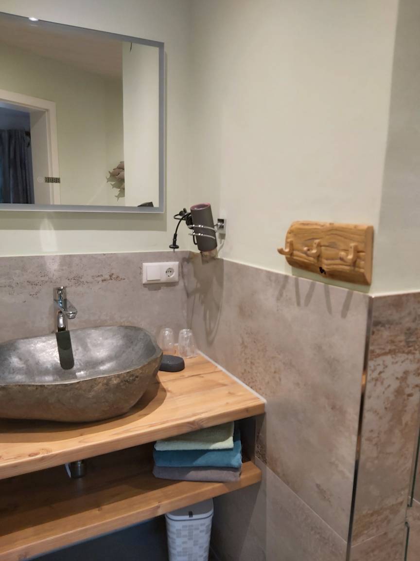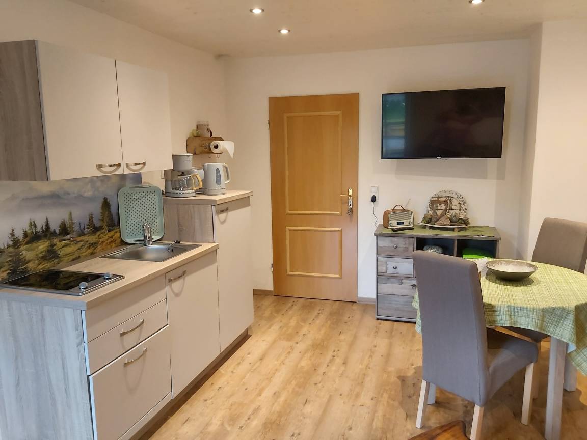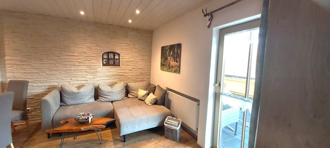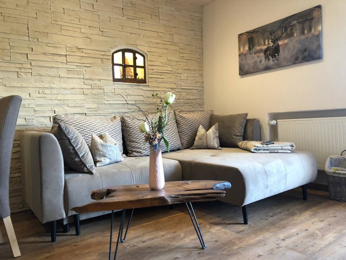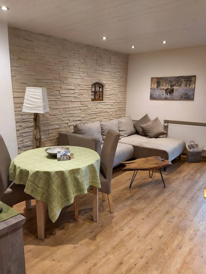 Unser Apartment "TANNE" befindet sich im ersten Stock und bietet bequem Platz für zwei Personen. Für Familien oder Belegung mit bis zu 4 Personen kann das gegenüberliegende Zweibettzimmer (in absolut ruhiger Lage zur Waldseite mit eigenem Bad/WC ) extra dazu gebucht werden. Im Wohnraum des Apartments "TANNE" das mit der gemütlichen Steinwand, Sofa, Essecke, SAT TV, DAB+ Digitalradio, kleiner Küchenzeile ausgestattet ist, werden Sie sich wohl fühlen. Von dort haben Sie Zugang zum großen Südbalkon. Hier können Sie den Urlaubstag mit einem gemütlichen Frühstück beginnen. Das Schlafzimmer mit bequemen Doppelbett (180x200cm) liegt ebenfalls nach Süden, von dort geht es in das behagliche Badezimmer. Es bietet eine bodenebene Regendusche, WC, sowie uriges Steinwaschbecken.