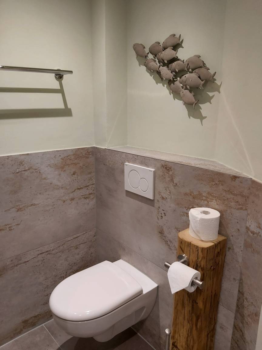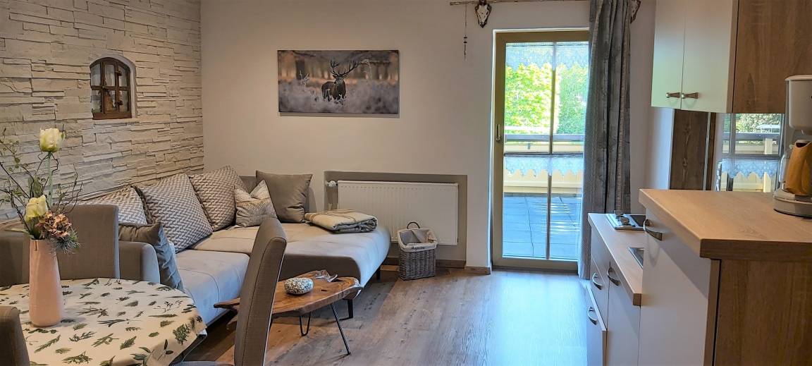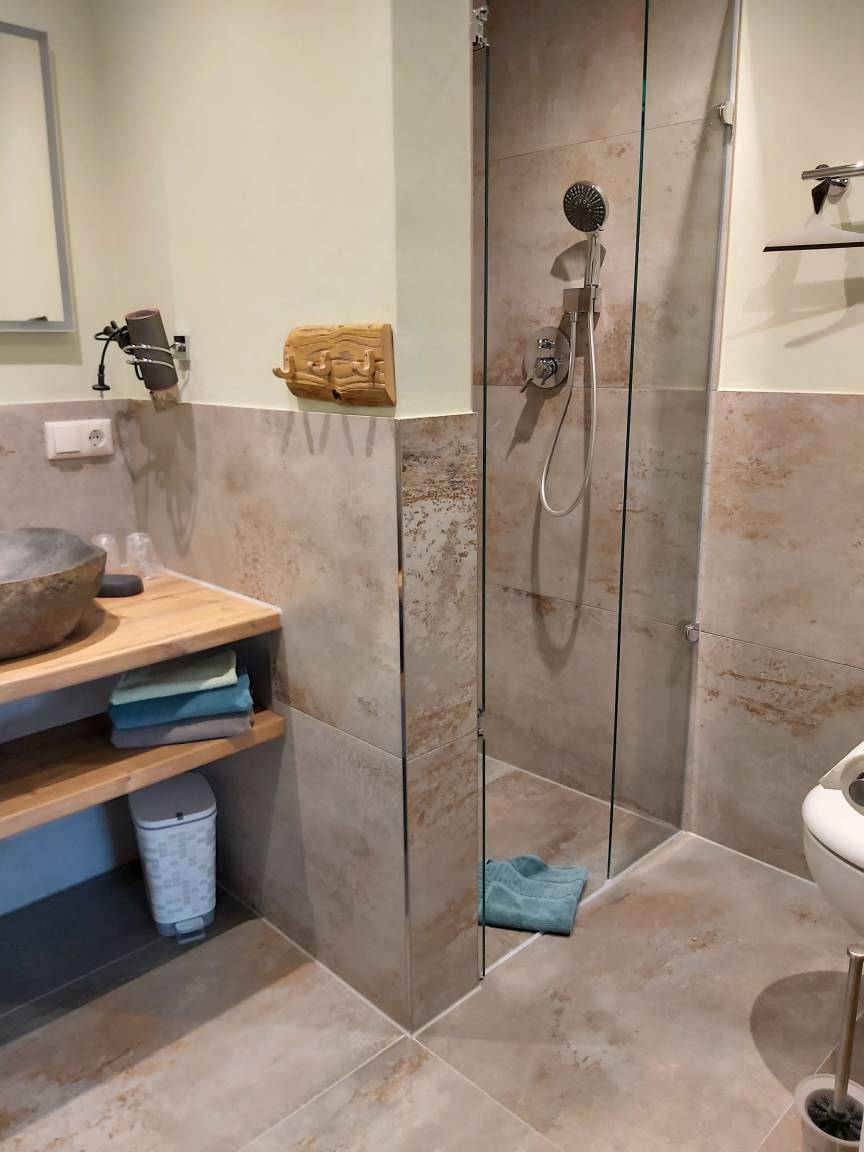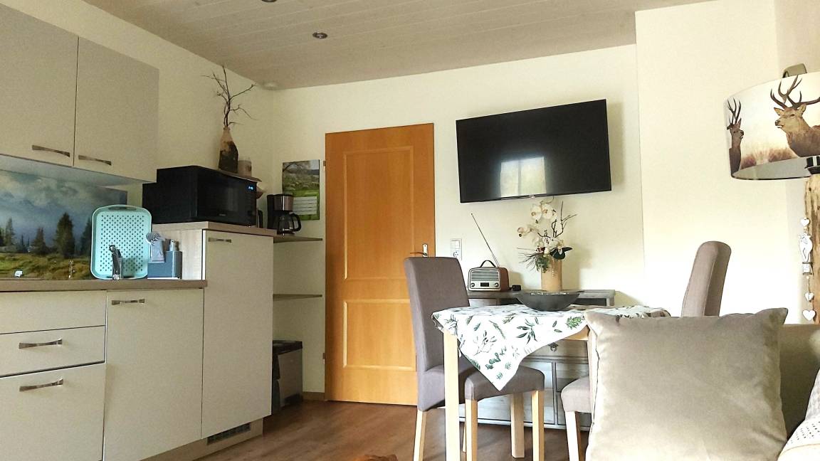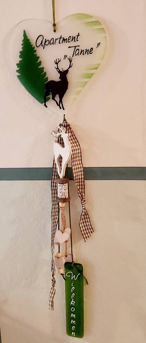 Unser Apartment "TANNE" befindet sich im ersten Stock und bietet bequem Platz für zwei Personen. Für Familien oder Belegung mit bis zu 4 Personen kann das gegenüberliegende Zweibettzimmer (in absolut ruhiger Lage zur Waldseite mit eigenem Bad/WC ) extra dazu gebucht werden. Im Wohnraum des Apartments "TANNE" das mit der gemütlichen Steinwand, Sofa, Essecke, SAT TV, DAB+ Digitalradio, kleiner Küchenzeile ausgestattet ist, werden Sie sich wohl fühlen. Von dort haben Sie Zugang zum großen Südbalkon. Hier können Sie den Urlaubstag mit einem gemütlichen Frühstück beginnen. Das Schlafzimmer mit bequemen Doppelbett (180x200cm) liegt ebenfalls nach Süden, von dort geht es in das behagliche Badezimmer. Es bietet eine bodenebene Regendusche, WC, sowie uriges Steinwaschbecken.