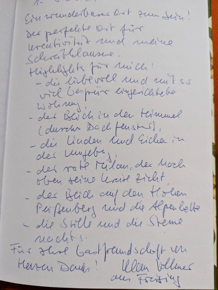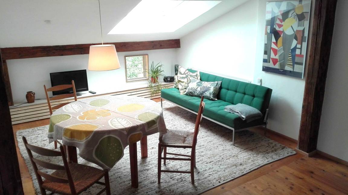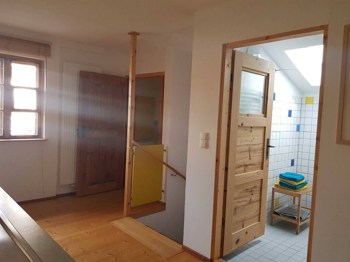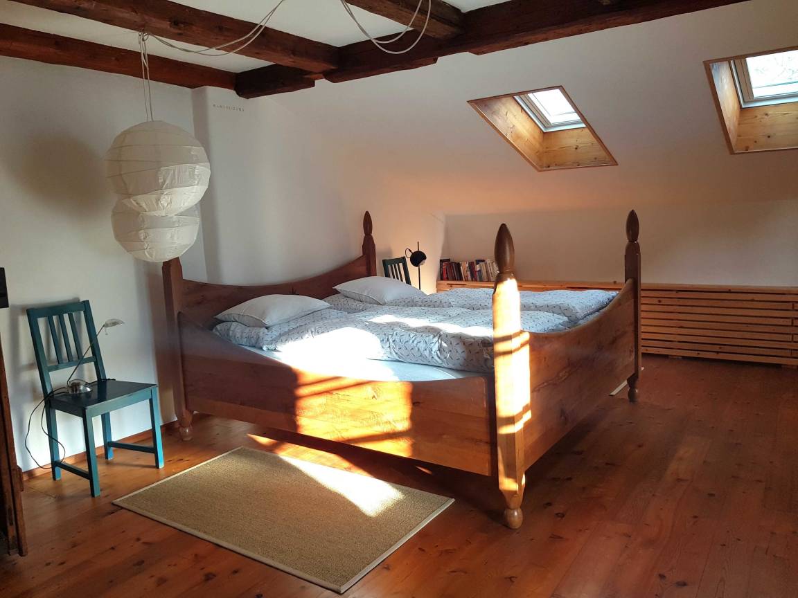Die helle Ferienwohnung für 1-3 Personen befindet sich im 1. Stock eines historischen Kleinbauernhauses. Sie wurde 2020 unter Berücksichtigung der historischen Substanz mit neuer Technik (Bäder, Heizung, Küche) eingebaut. Maßgabe war, beim Umbau eine bäuerliche Anmutung in den Räumen zu erhalten aber keine kitschige Landhausstimmung aufkommen zu lassen. Die zahlreichen Ausblicke auf das - als Naturgarten zertifizierte - Grundstück mit den alten Apfelbäumen und dem Bauerngarten machen die Räume hell und licht. Die zur Wohnung zugehörige Terrasse liegt sonnig und geschützt unter einer Pergola an der Westseite des Gebäudes.