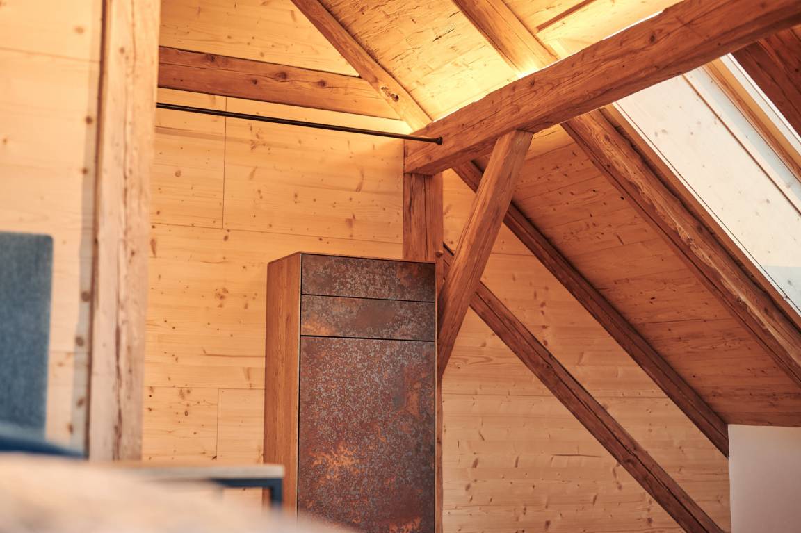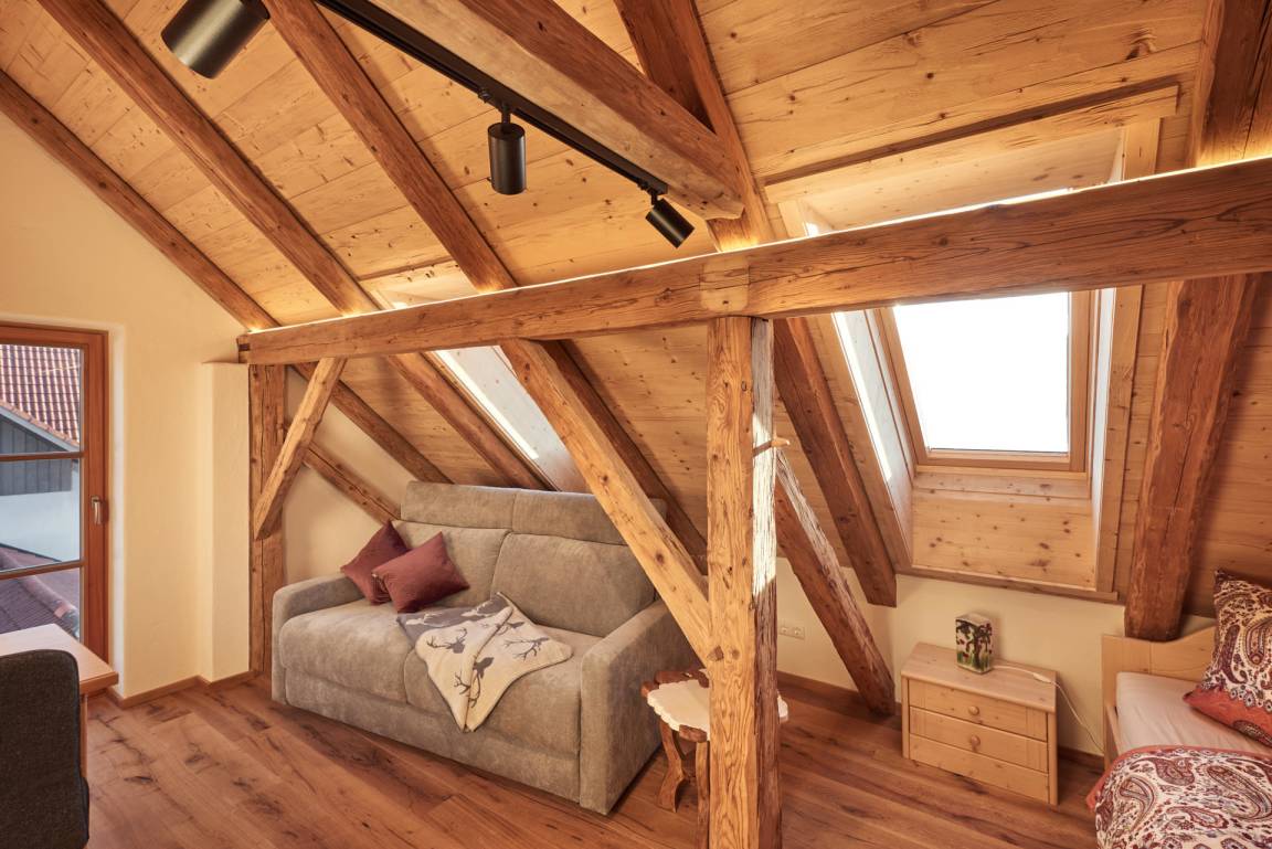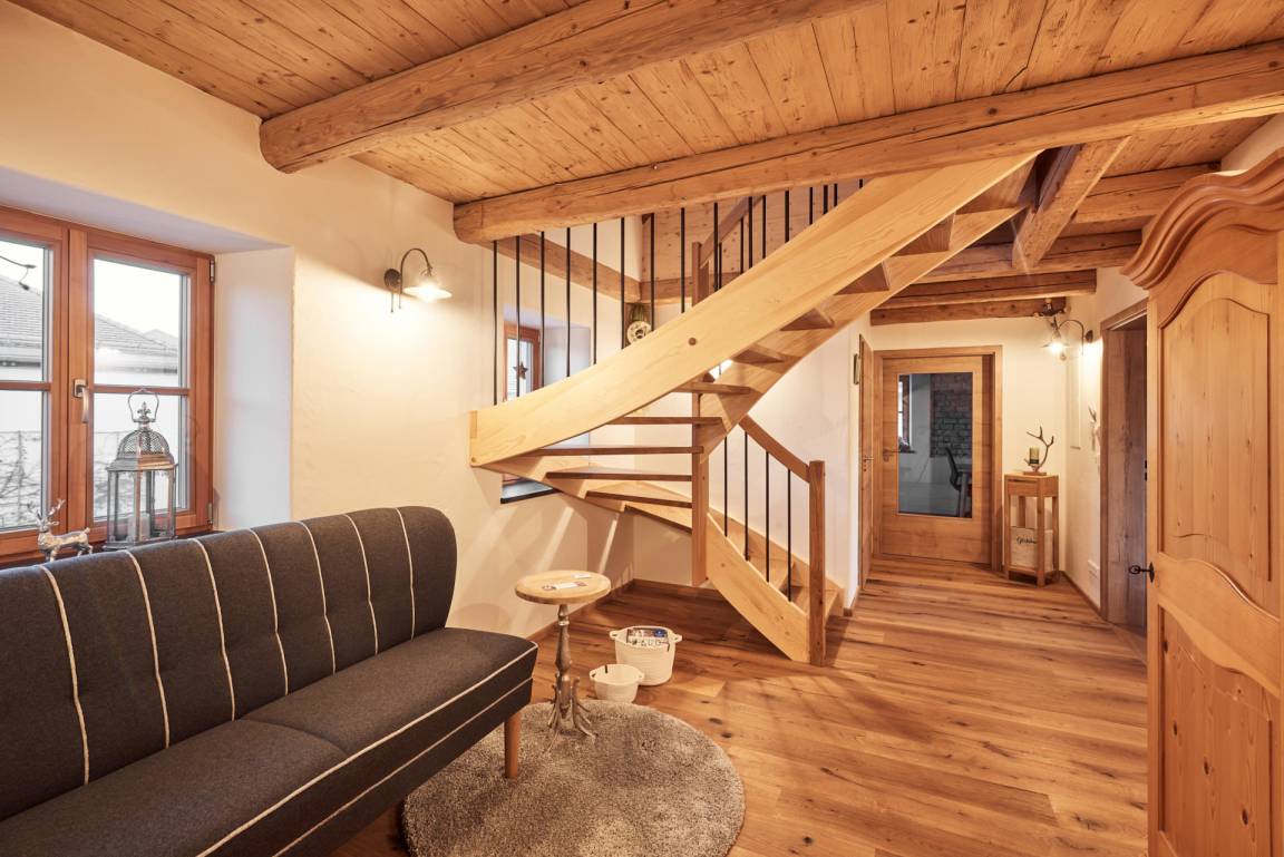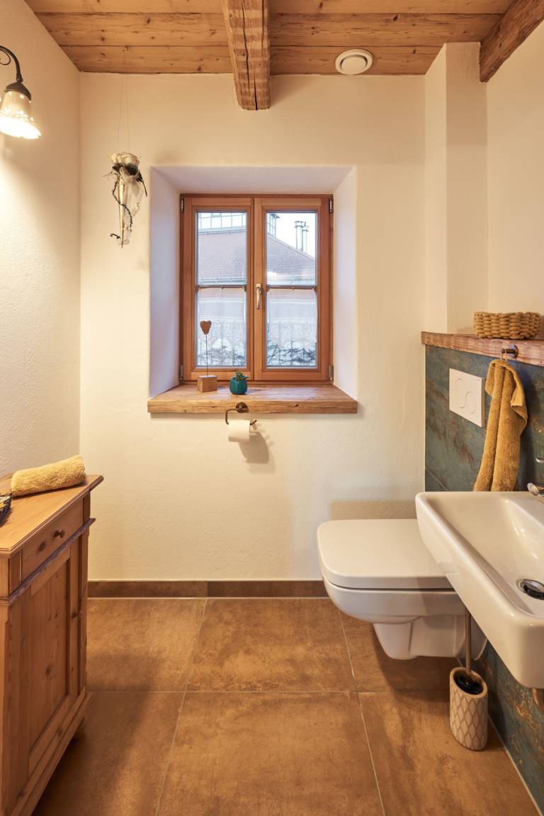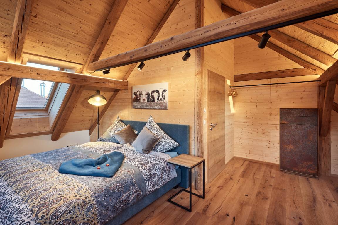 Als Zimmerei war es für uns ein MUSS, den alten Dachstuhl zu erhalten. Er ist in den beiden Schlafzimmern und auch im Badezimmer im Originalzustand (seit 1880) sichtbar. Das Dach und auch die alten dicken Mauern wurden mit nachhaltigem Holz gedämmt. So wartet zusammen mit der Fußbodenheizung und der Lüftungsanlage ein wohlig warmes Klima auf alle Gäste.