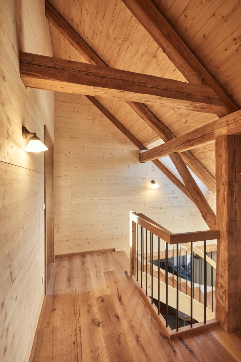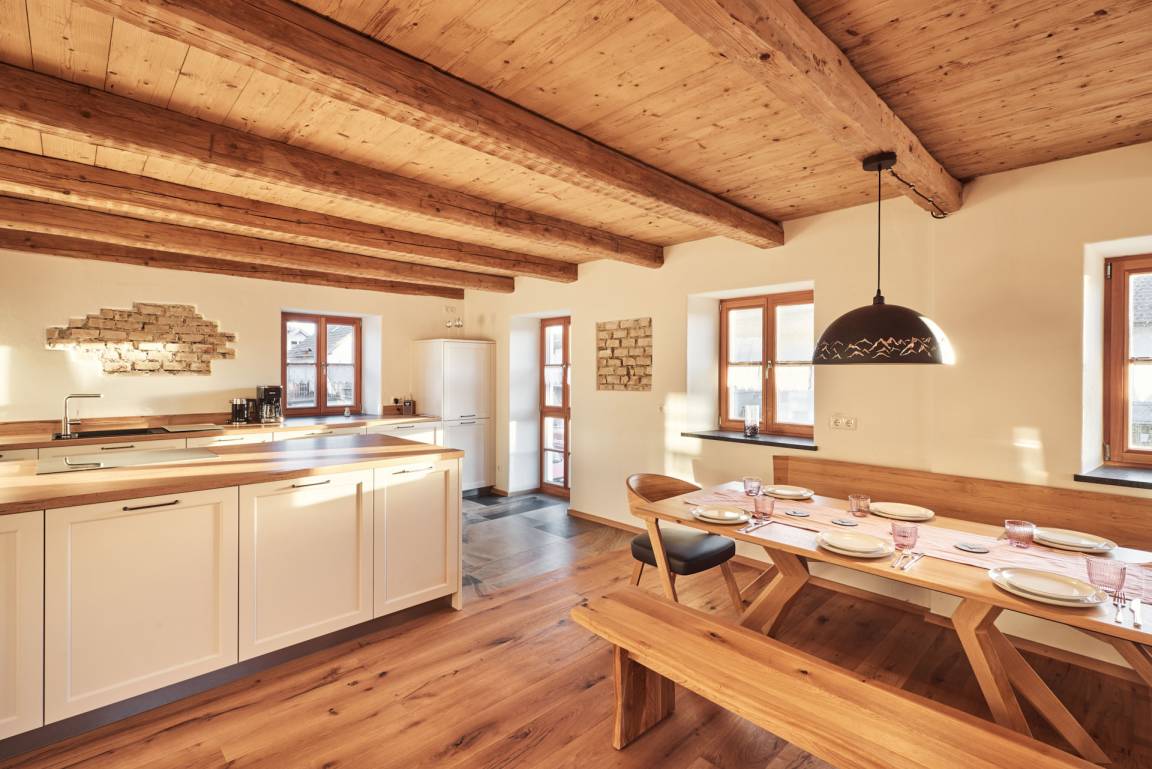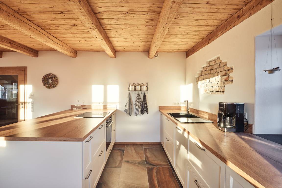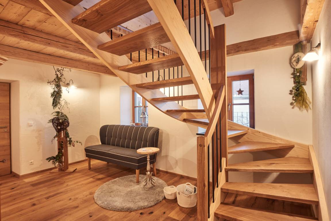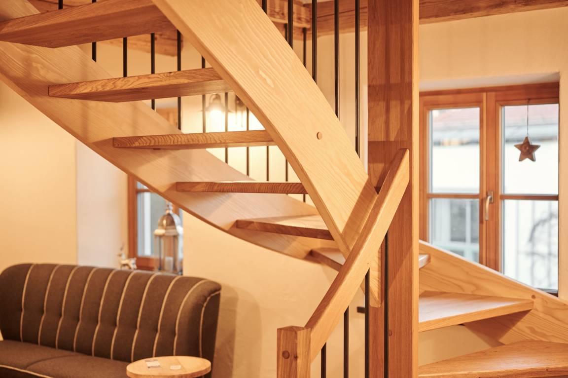 Als Zimmerei war es für uns ein MUSS, den alten Dachstuhl zu erhalten. Er ist in den beiden Schlafzimmern und auch im Badezimmer im Originalzustand (seit 1880) sichtbar. Das Dach und auch die alten dicken Mauern wurden mit nachhaltigem Holz gedämmt. So wartet zusammen mit der Fußbodenheizung und der Lüftungsanlage ein wohlig warmes Klima auf alle Gäste.