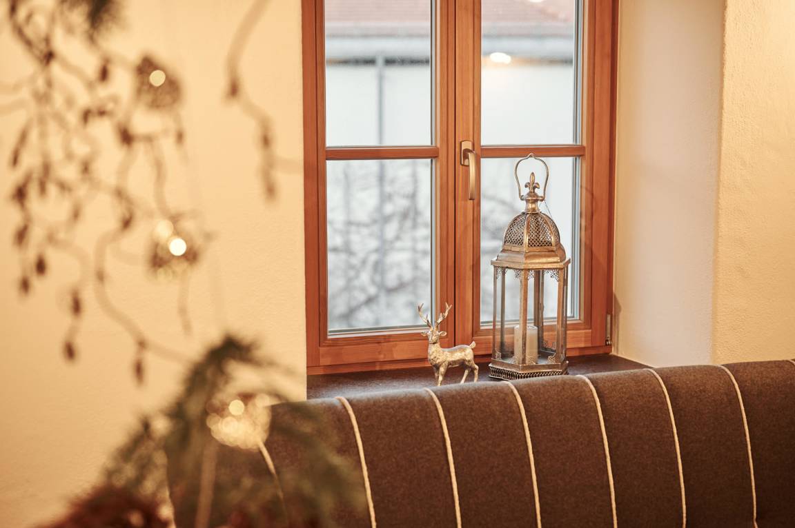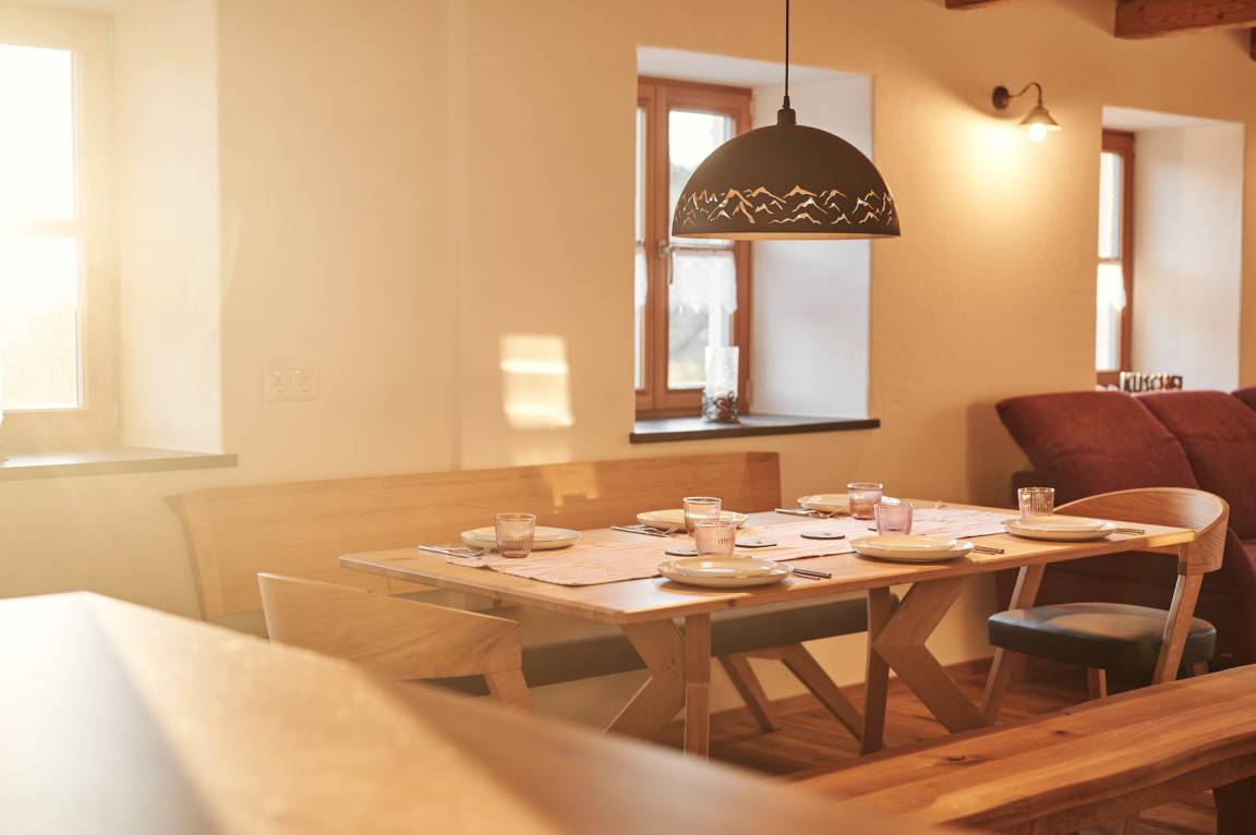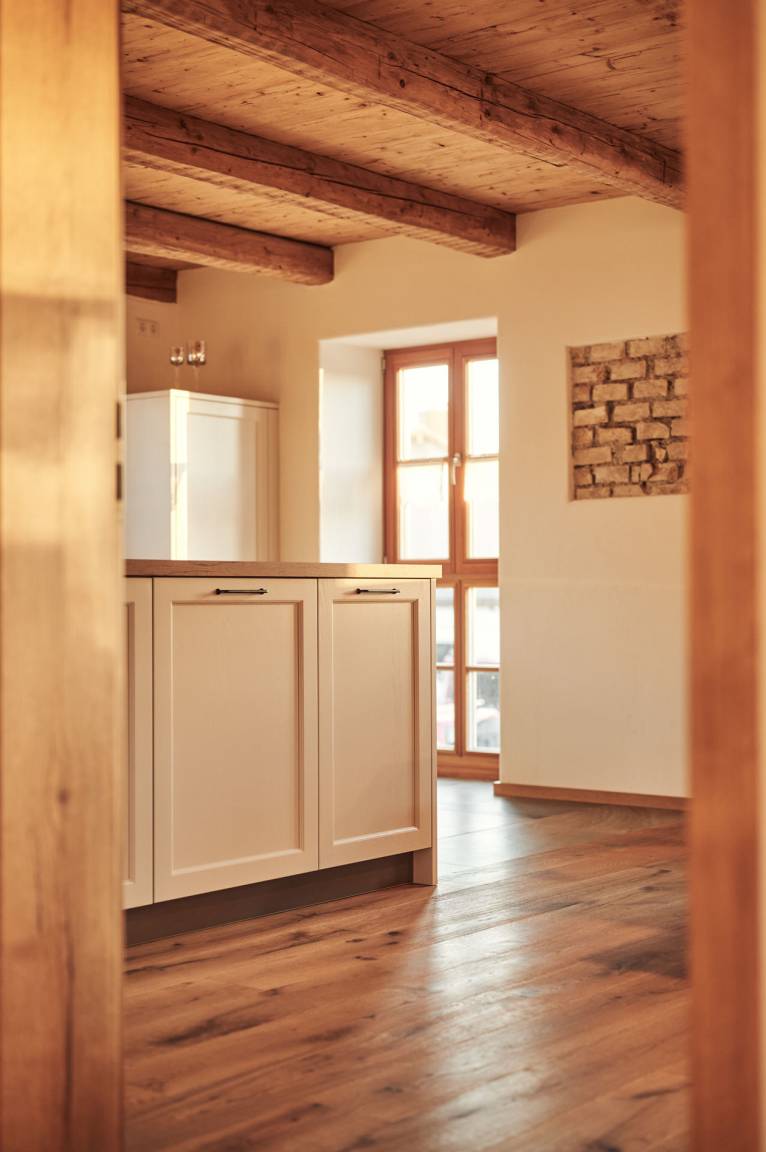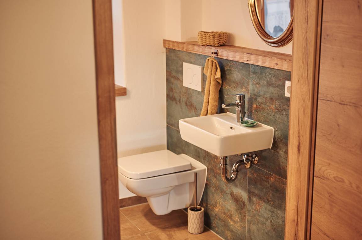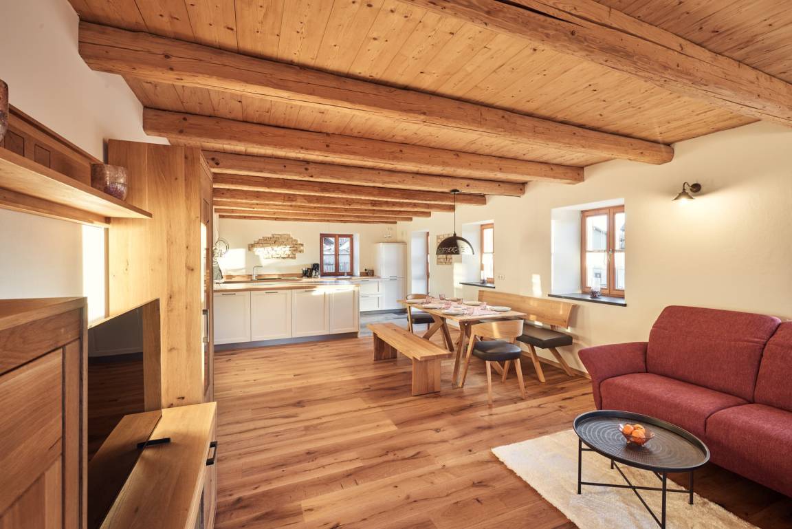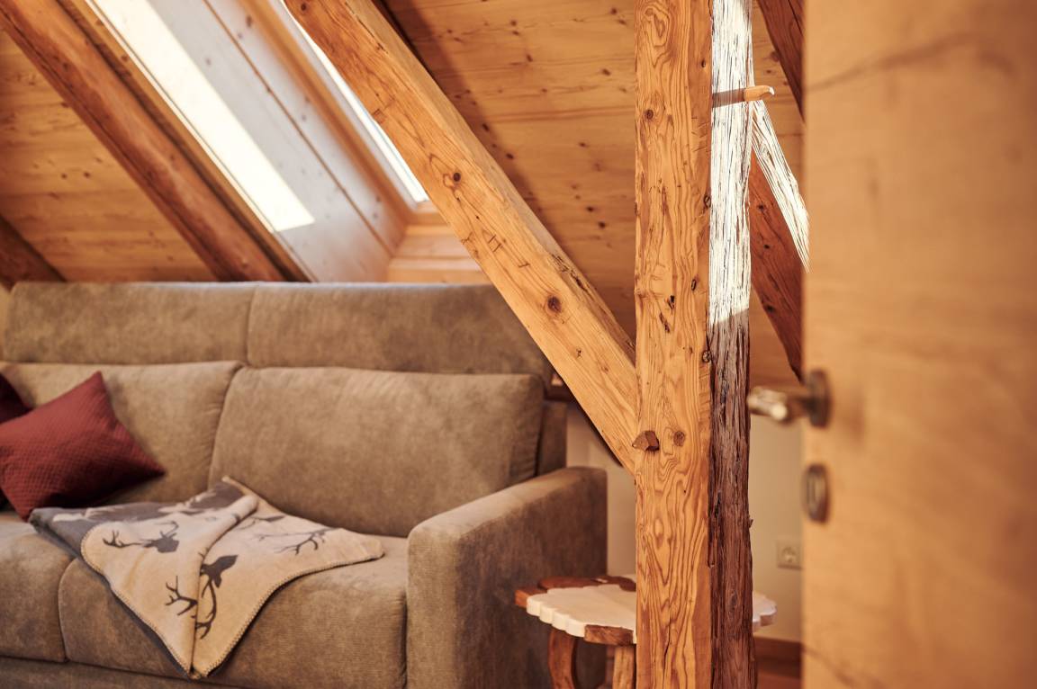 Als Zimmerei war es für uns ein MUSS, den alten Dachstuhl zu erhalten. Er ist in den beiden Schlafzimmern und auch im Badezimmer im Originalzustand (seit 1880) sichtbar. Das Dach und auch die alten dicken Mauern wurden mit nachhaltigem Holz gedämmt. So wartet zusammen mit der Fußbodenheizung und der Lüftungsanlage ein wohlig warmes Klima auf alle Gäste.