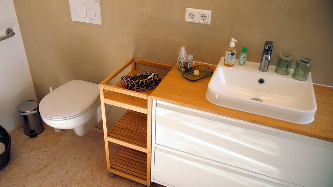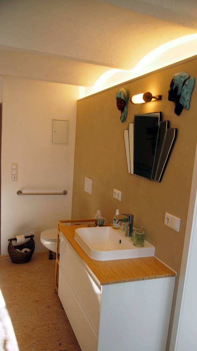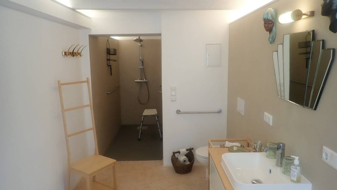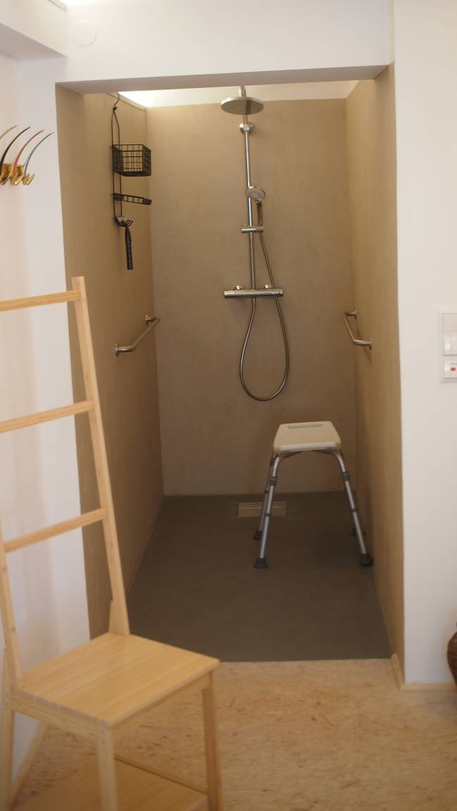 Das Schönste in dieser Wohnung aber ist das Bad: Sehr geräumig, mit einer großen ebenerdigen Dusche, versehen mit Haltegriffen auf beiden Seiten und einem Duschhocker, einer erhöhten Toilette, ebenfalls mit Haltegriff, einem Bambusstuhl und einem Waschtisch mit Schubladen, zusätzlich ein rollbares Regal für Ihre persönlichen Utensilien. Selbstverständlich gibt es eine Lüftung und ein hübsches Fenster mit gehäkelten Gardinen, das geöffnet werden kann. Sehr romantisch beleuchten am Abend versteckte Lichter die gewölbte Decke des ehemaligen Stalls!