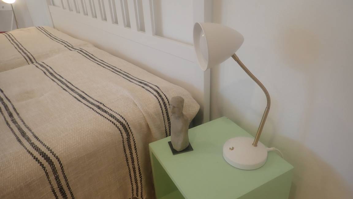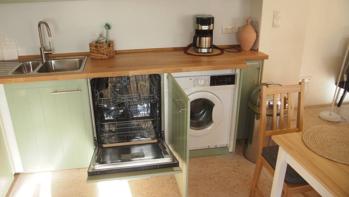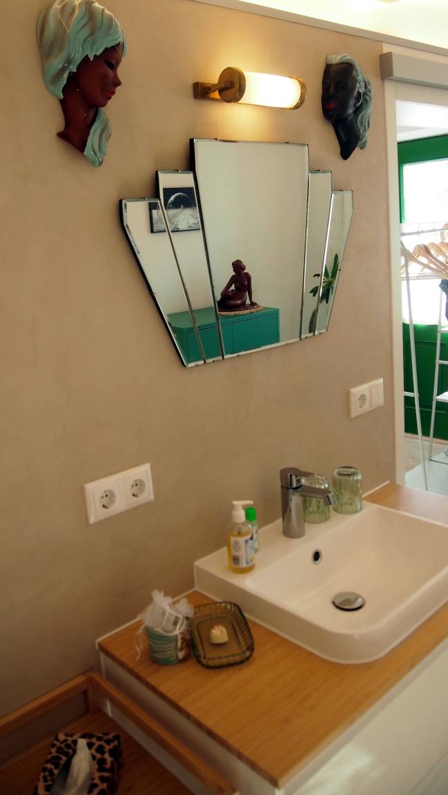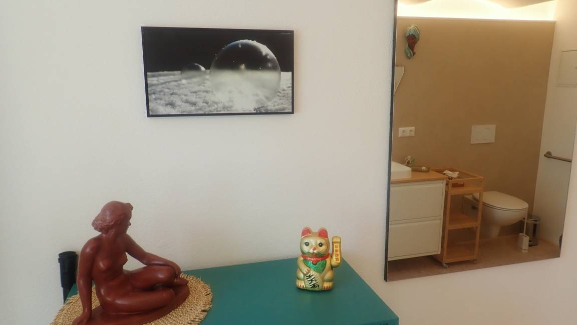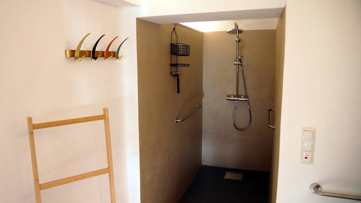 Das Schönste in dieser Wohnung aber ist das Bad: Sehr geräumig, mit einer großen ebenerdigen Dusche, versehen mit Haltegriffen auf beiden Seiten und einem Duschhocker, einer erhöhten Toilette, ebenfalls mit Haltegriff, einem Bambusstuhl und einem Waschtisch mit Schubladen, zusätzlich ein rollbares Regal für Ihre persönlichen Utensilien. Selbstverständlich gibt es eine Lüftung und ein hübsches Fenster mit gehäkelten Gardinen, das geöffnet werden kann. Sehr romantisch beleuchten am Abend versteckte Lichter die gewölbte Decke des ehemaligen Stalls!