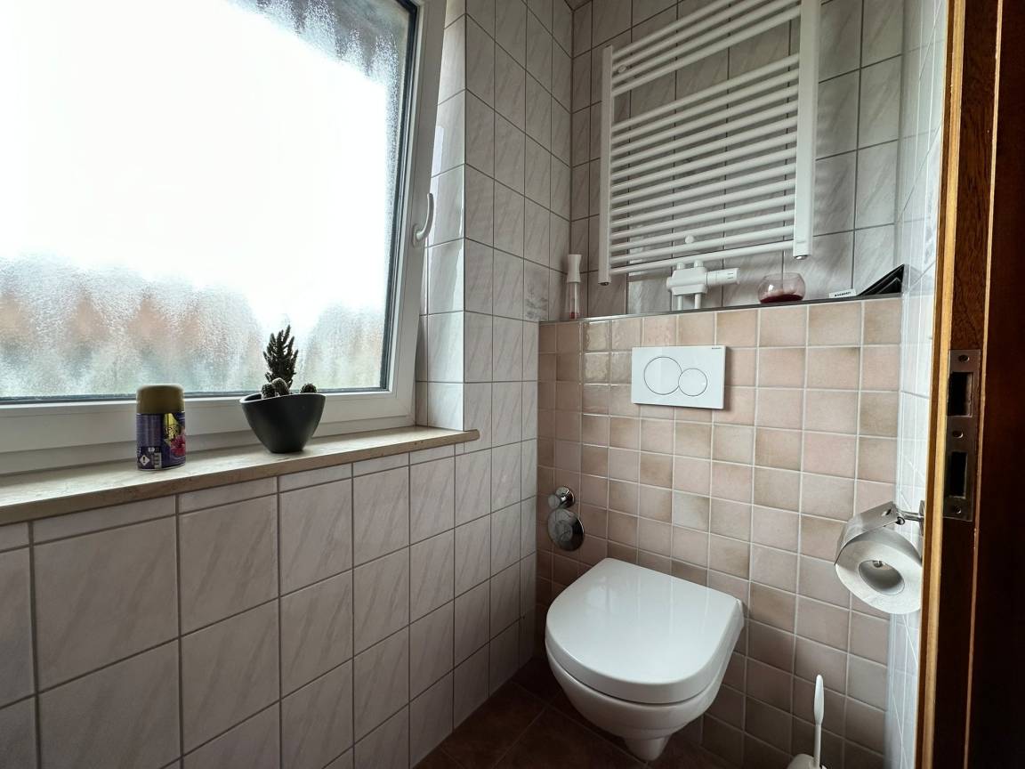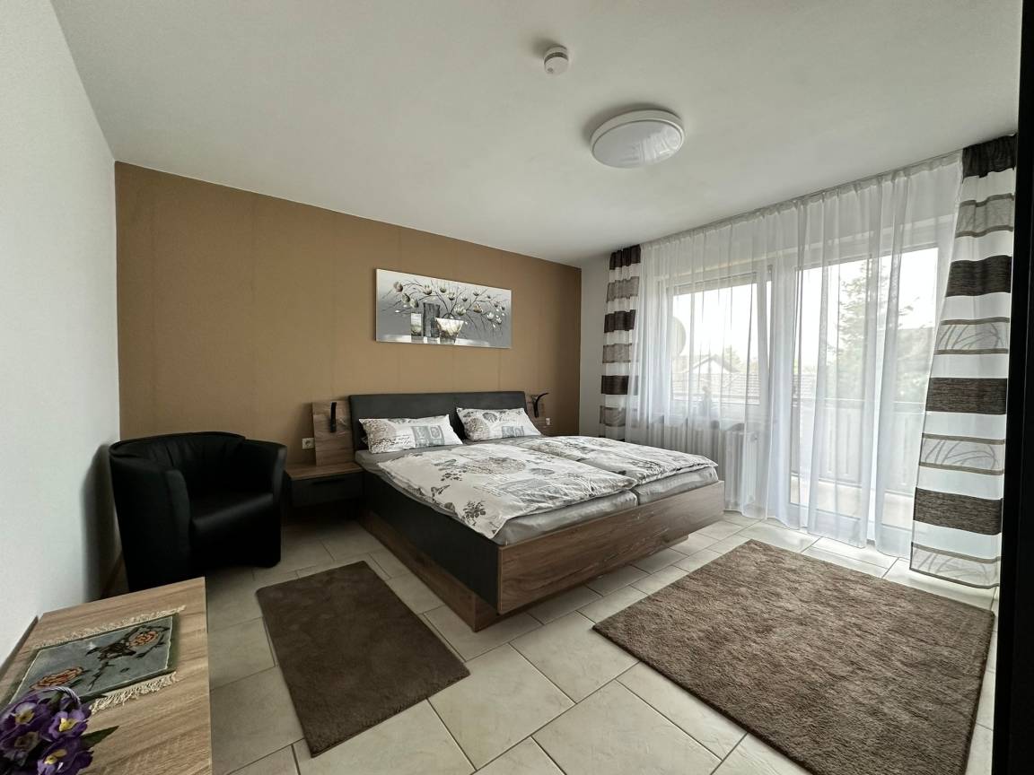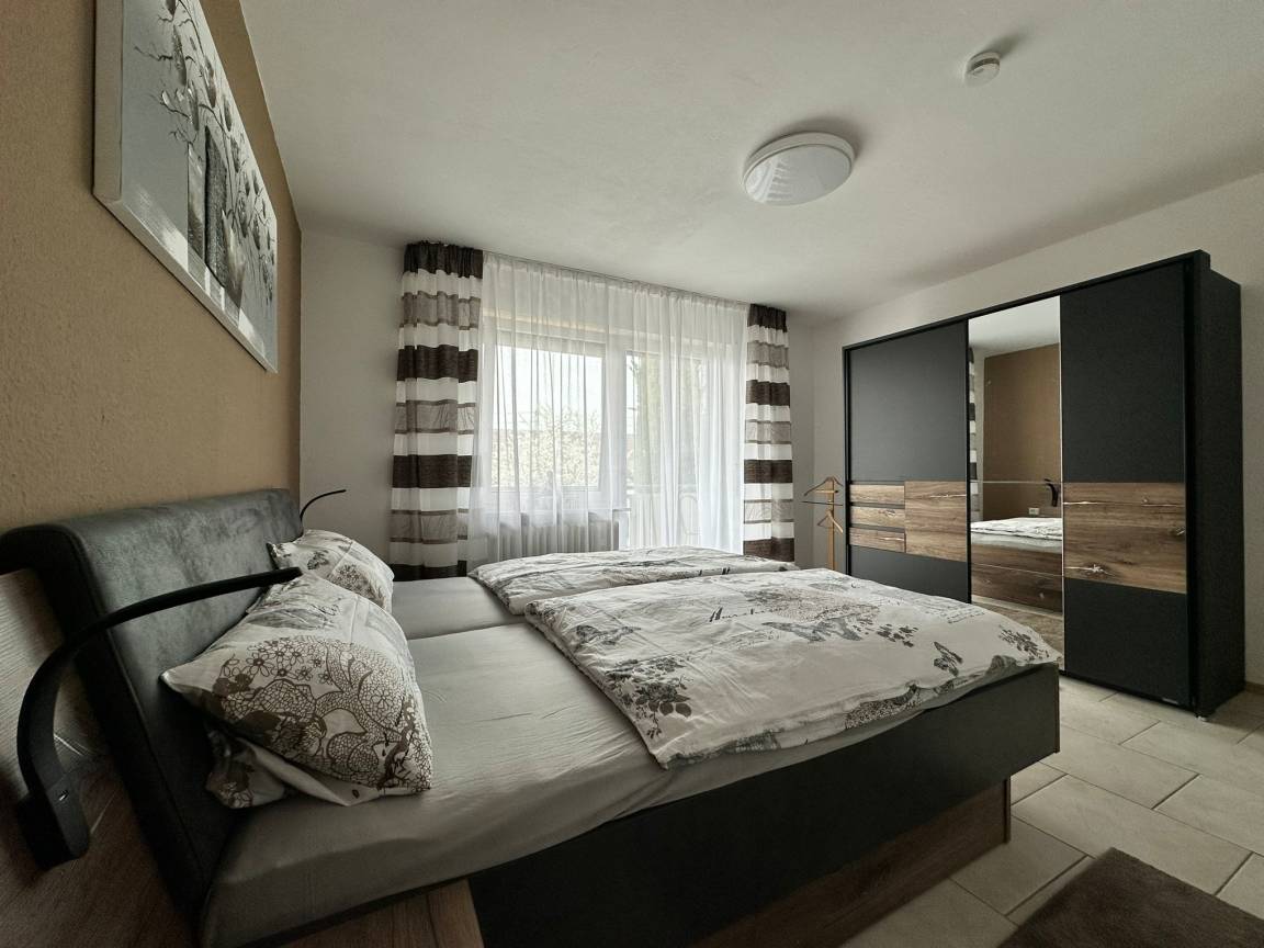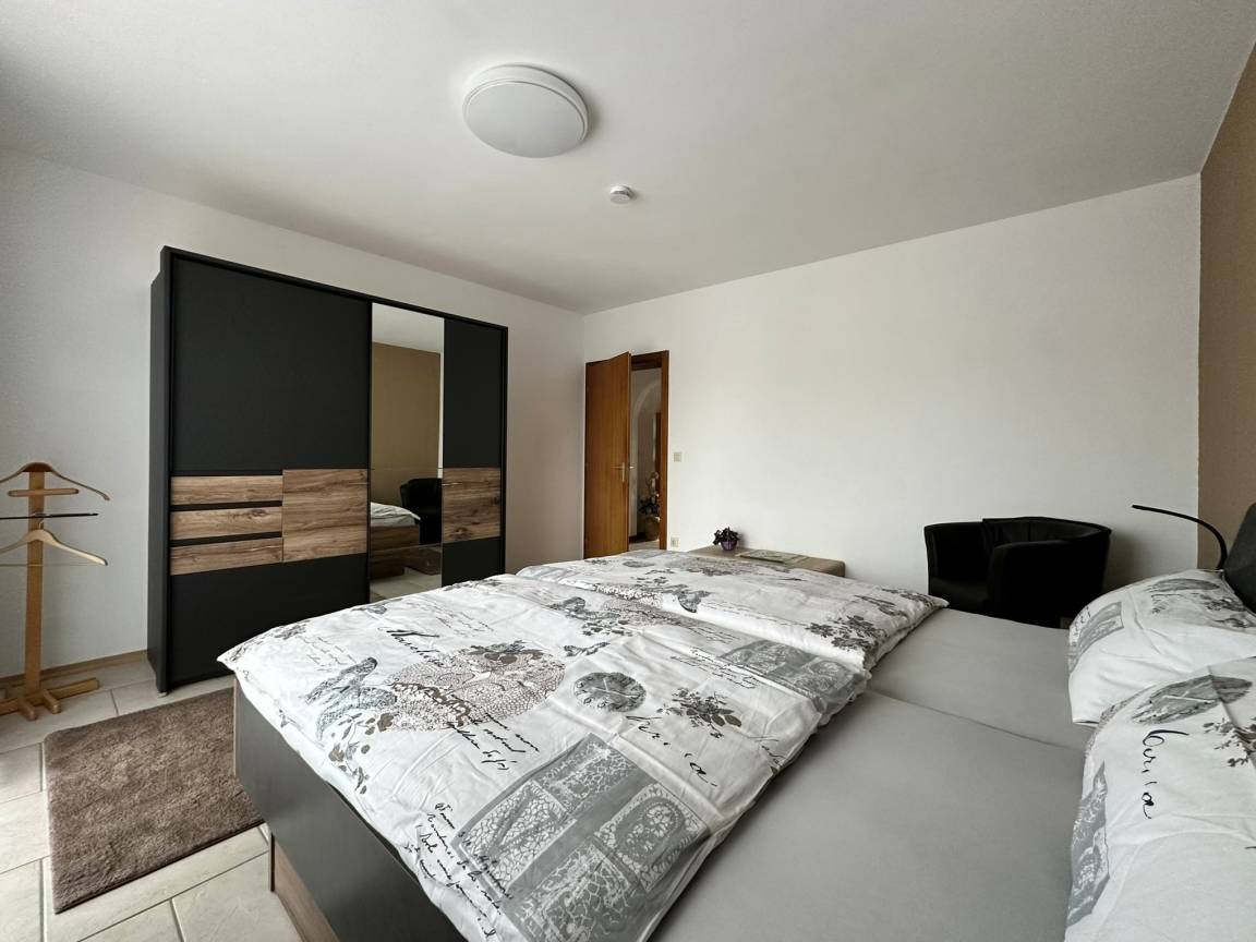 Gemütliche, komplett neu möblierte Ferienwohnung für bis zu 4 Personen, ca. 88 qm, im 1. Stock. Die Wohnung besteht aus einem Wohnzimmer, Küche mit Essbereich, 1 Schlafzimmer mit Doppelbett (180 x 200) und 1 Schlafzimmer mit Doppelbett (140 x 200), neues Bad mit ebenerdiger Dusche und einem WC extra. Garten zum Spielen für Ihre Kinder steht zur Verfügung. Überdachter möblierter Balkon.