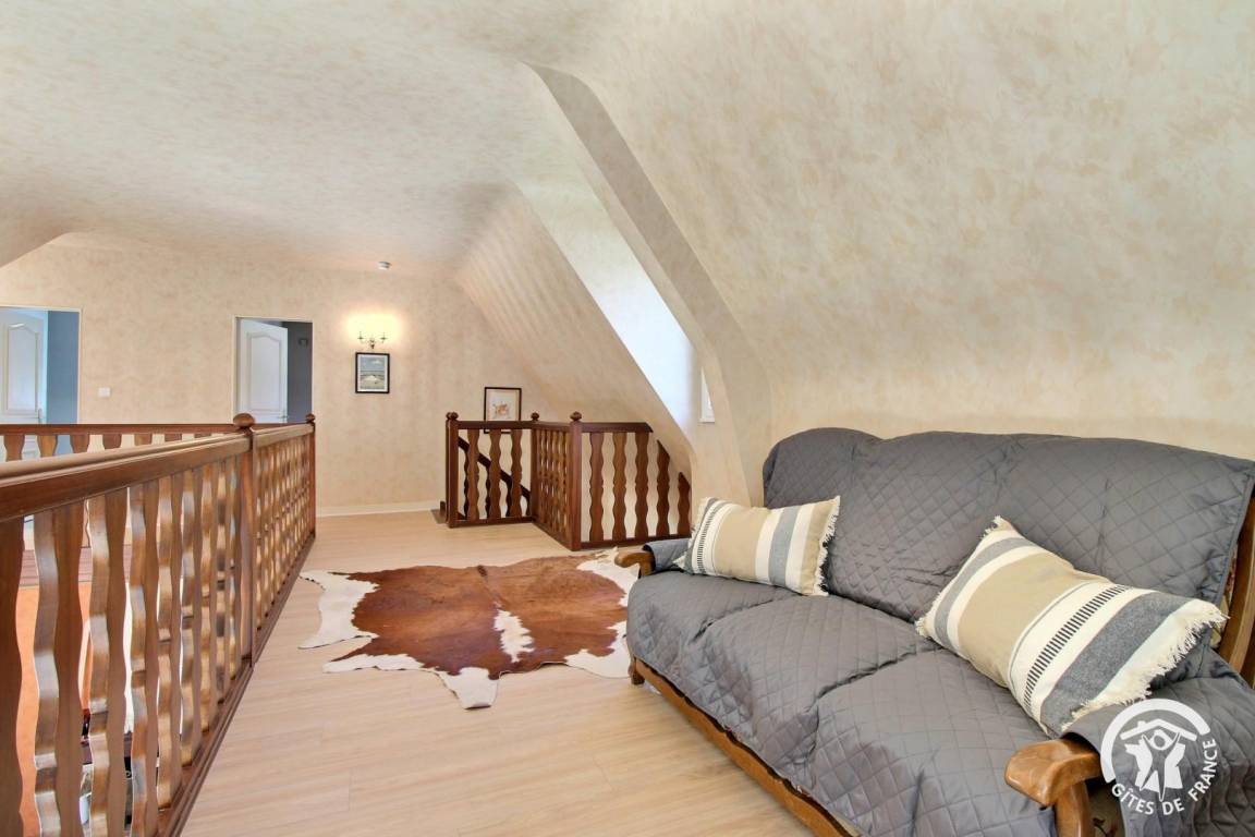 - Zwischengeschoss mit Blick auf das Wohnzimmer und einem Schlafsofa
