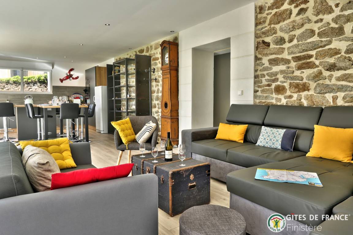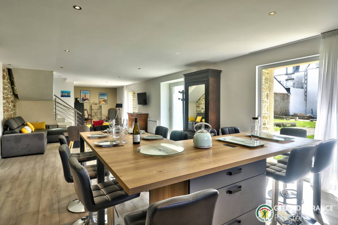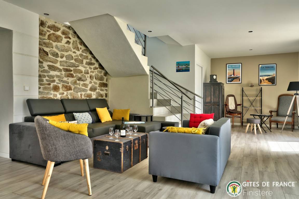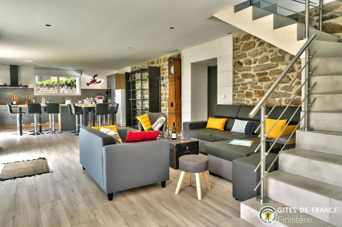 „Nous sommes venus séjourner en famille 8 adultes et 1 bébé. Nous avons été bien accueilli par Laura. Si le gîte est idéalement situé à deux pas du port, et a 200m de la mer et non loin de la plage de pors carn ainsi que des commerces, notre avis reste très mitigé quant à la prestation proposée par ce gîte. Pour commencer, bien que signalé aux propriétaires avant de venir il n'y avais pas de chaise haute bébé à notre arrivée et le lit parapluie était cassé. Heureusement Laura qui s'occupe de la conciergerie a été réactive. Le gîte est proposé pour 10 adultes et 4 enfants, cependant le salon ne permet pas d'accueillir tous le monde en même temps. Prévoyez de ne pas tous vous doucher en même temps (manque d'eau chaude le ballon est petit pour 10/14 personnes, je me pose la question de la gestion des douches en plein été bref) Si le gîte est grand et spacieux, et la literie confortable, l'escalier qui monte à l'étage est quant à lui extrêmement dangereux (très raide et marche très étroites) les barrières de garde corps de sont pas stables. Passons Le gîte est refais à neuf et laisse apparaître partout dans le gîte des murs charmant en pierre apparentes, superbe si ce n'est le point le plus noir du séjour. Tout les murs de pierre partent en lambeaux de plâtre... Quand nous avons le soin de le signaler au propriétaire (car cela est dangereux pour notre bb) ce dernier s'est montré hautain et condescendant au téléphone, nous traitant presque de menteurs... Nous avons du passer l'aspirateur tous les jours et nos vêtements, valises était couvert de plâtre. Nous avons bien sûr fait remonter à la conciergerie, qui a bien entendu constaté... Bref très désagréable... Passons sur les autres détails: Verres ébréchées, sèche linge en panne, lumière salle de bain défectueux, et j'en passe... Bref pas un gîte à la hauteur du prétendu standing défendu par l'annonce. Je ne recommande pas avec de jeunes enfant.“