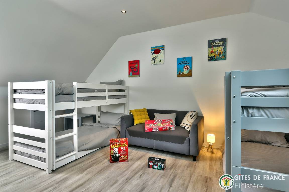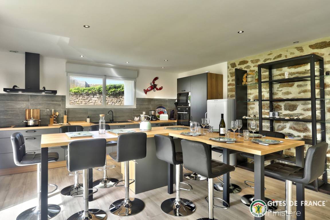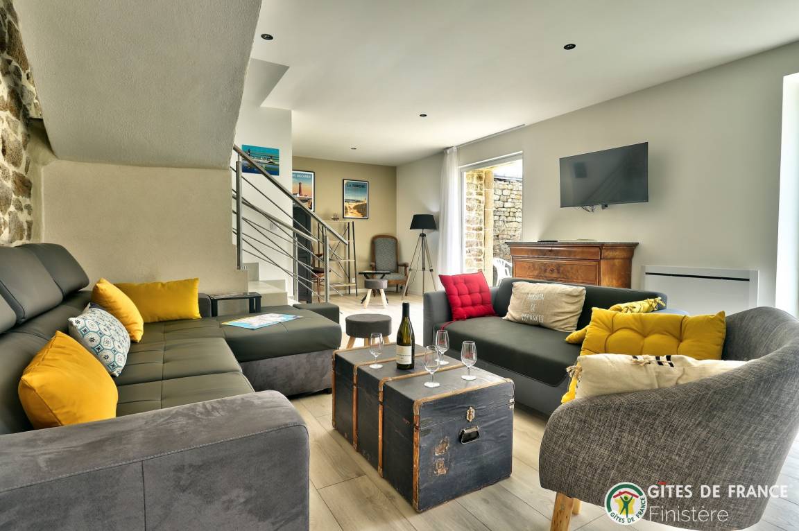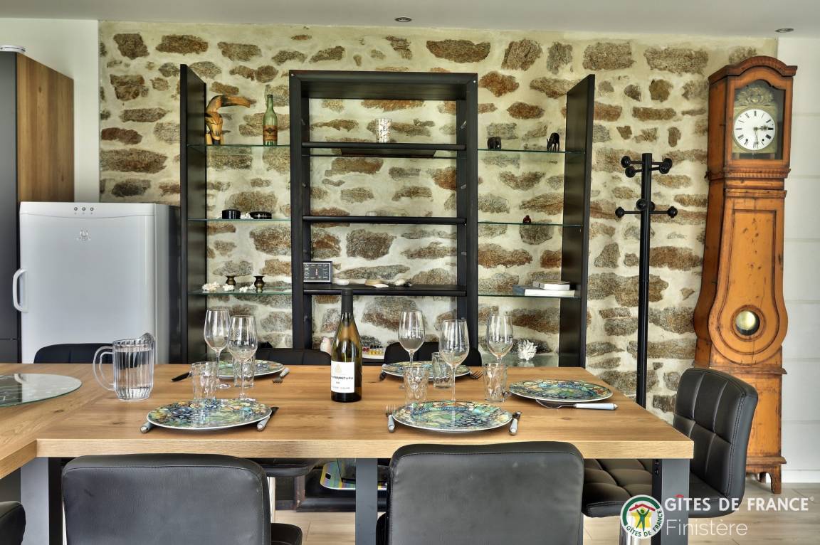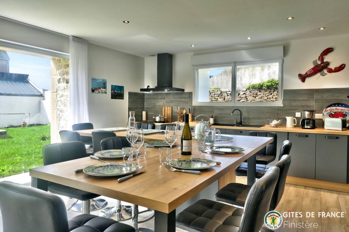 „Nous sommes venus séjourner en famille 8 adultes et 1 bébé. Nous avons été bien accueilli par Laura. Si le gîte est idéalement situé à deux pas du port, et a 200m de la mer et non loin de la plage de pors carn ainsi que des commerces, notre avis reste très mitigé quant à la prestation proposée par ce gîte. Pour commencer, bien que signalé aux propriétaires avant de venir il n'y avais pas de chaise haute bébé à notre arrivée et le lit parapluie était cassé. Heureusement Laura qui s'occupe de la conciergerie a été réactive. Le gîte est proposé pour 10 adultes et 4 enfants, cependant le salon ne permet pas d'accueillir tous le monde en même temps. Prévoyez de ne pas tous vous doucher en même temps (manque d'eau chaude le ballon est petit pour 10/14 personnes, je me pose la question de la gestion des douches en plein été bref) Si le gîte est grand et spacieux, et la literie confortable, l'escalier qui monte à l'étage est quant à lui extrêmement dangereux (très raide et marche très étroites) les barrières de garde corps de sont pas stables. Passons Le gîte est refais à neuf et laisse apparaître partout dans le gîte des murs charmant en pierre apparentes, superbe si ce n'est le point le plus noir du séjour. Tout les murs de pierre partent en lambeaux de plâtre... Quand nous avons le soin de le signaler au propriétaire (car cela est dangereux pour notre bb) ce dernier s'est montré hautain et condescendant au téléphone, nous traitant presque de menteurs... Nous avons du passer l'aspirateur tous les jours et nos vêtements, valises était couvert de plâtre. Nous avons bien sûr fait remonter à la conciergerie, qui a bien entendu constaté... Bref très désagréable... Passons sur les autres détails: Verres ébréchées, sèche linge en panne, lumière salle de bain défectueux, et j'en passe... Bref pas un gîte à la hauteur du prétendu standing défendu par l'annonce. Je ne recommande pas avec de jeunes enfant.“