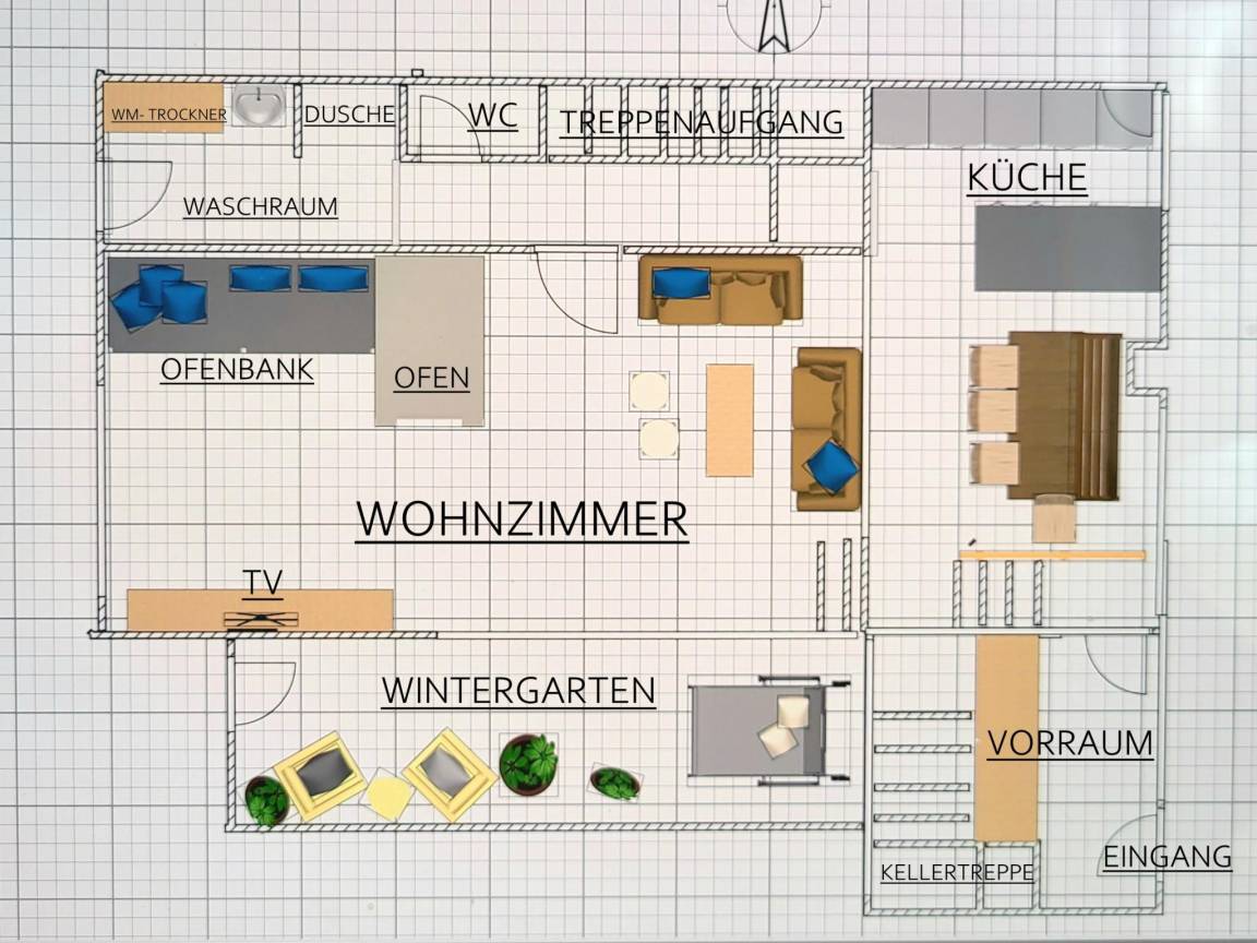 Layout : Parterre: offene Küche mit Wasserkocher, Toaster, Kochherd(4 Kochplatten, Ceranfeld, elektrisch), Kaffeemaschine(Vollautomat, Bohnen), Backofen(elektrisch), Mikrowelle, Geschirrspüler, Kühlschrank , Wohn/Esszimmer mit TV, Esstisch(8 Personen), Ofen(Holz), 2x Sitzecke, Gesellschaftsspiele , Badezimmer mit Waschbecken, Dusche , Toilette mit Waschbecken, Toilette , Wintergarten