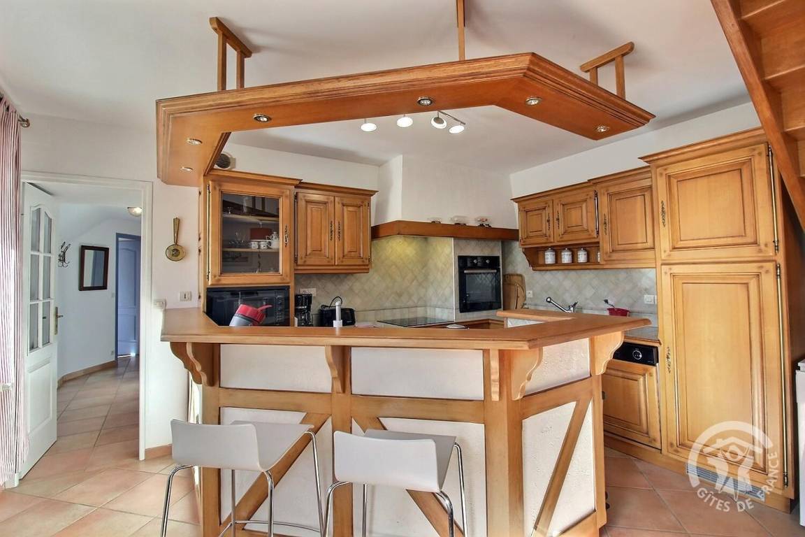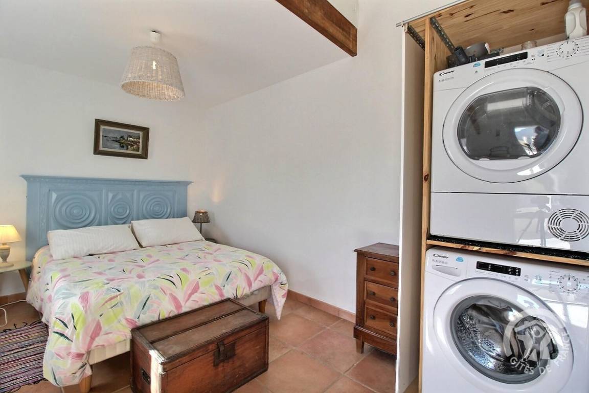 Wohnzimmer (Kamin mit Einsatz: 1. feuerfrei) mit Einbauküche, 1 Flur, der zu 1 separater Toilette führt, 1 Badezimmer (Dusche und Badewanne) und ein Schlafzimmer mit direktem Zugang zur vorderen Terrasse, mit Abstellraum, wo sich die Waschmaschine und der Trockner befinden gelagert (1 140x190 Bett).