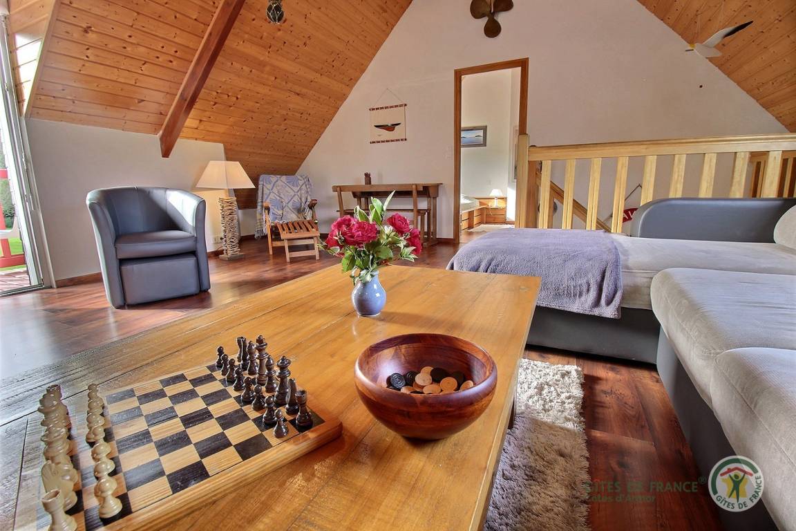Dieses Ferienhausangebot enthält: Im Erdgeschoss: einen Essraum mit Einbauküche, 1 Schlafzimmer (1 Bett x 2 Personen), einen Wäscheschrank, ein Badezimmer mit Dusche und WC. Im 1. Stock: ein angenehmes Wohnzimmer von 27 m² im Meer-Dekor mit sichtbaren Balken. 1 geräumiges Schlafzimmer (1 Bett x 2 Personen, 1 Bett x 1 Person). Babyausstattung vorhanden : Bett, Badewanne, Hochstuhl, Spielzeug. Zu Ihrer Verfügung steht auch: ein 2000 qm großes, von einem Bach umgebenes Grundstück. Kurtaxe vor Ort zahlbar.