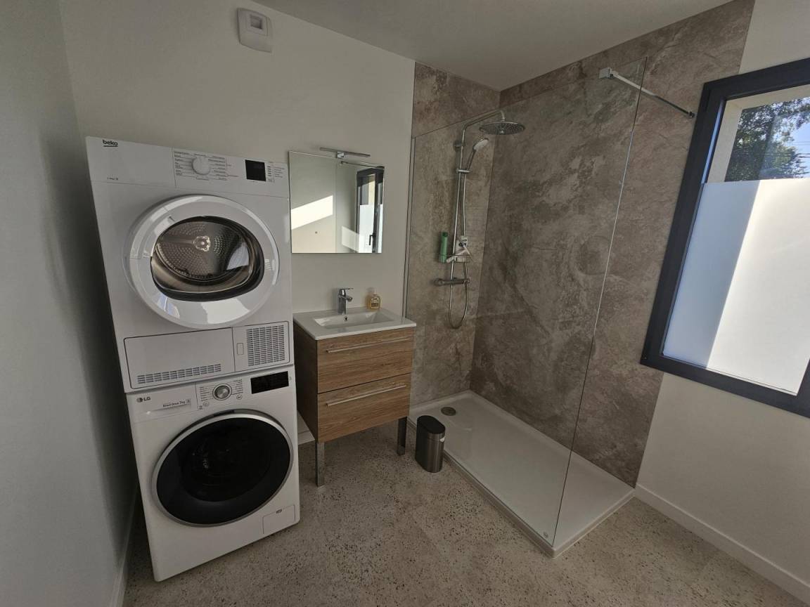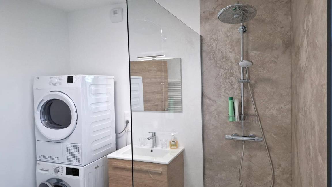 - ein Badezimmer mit Dusche und Waschbecken + LL- und SL-Waschküche