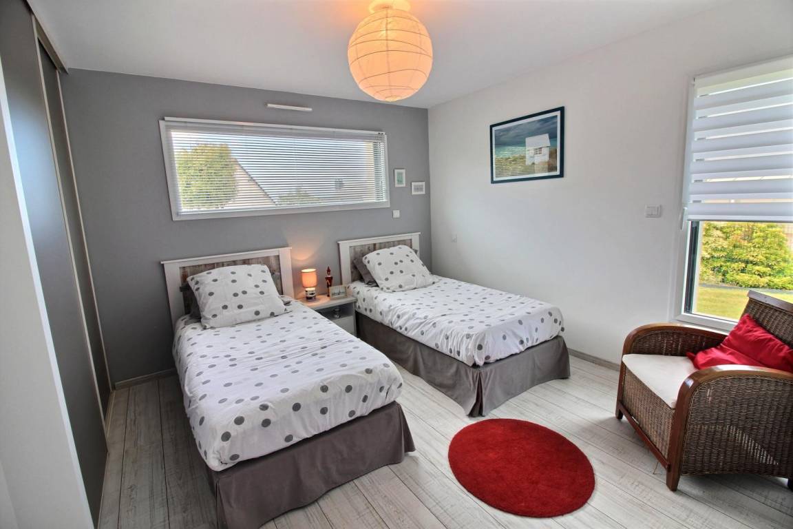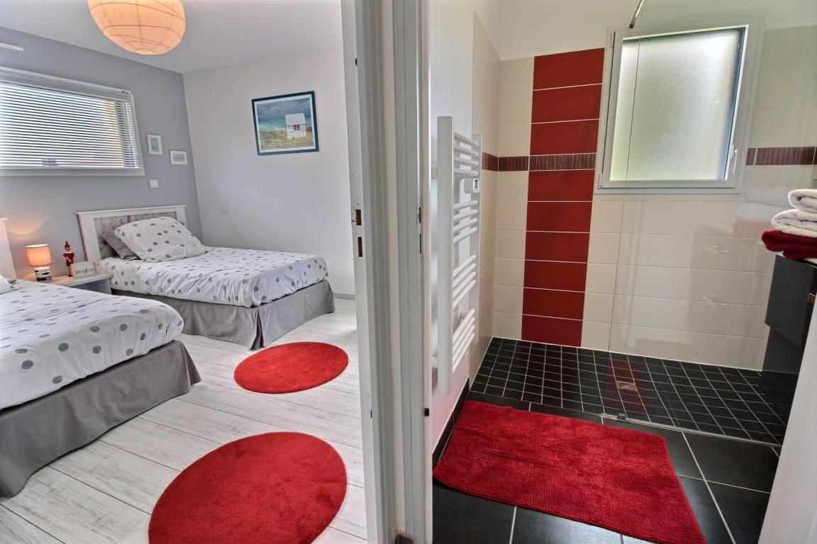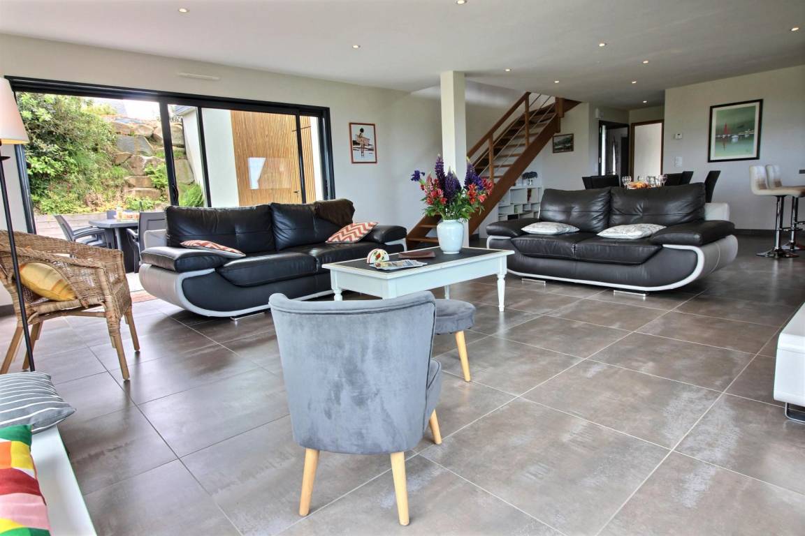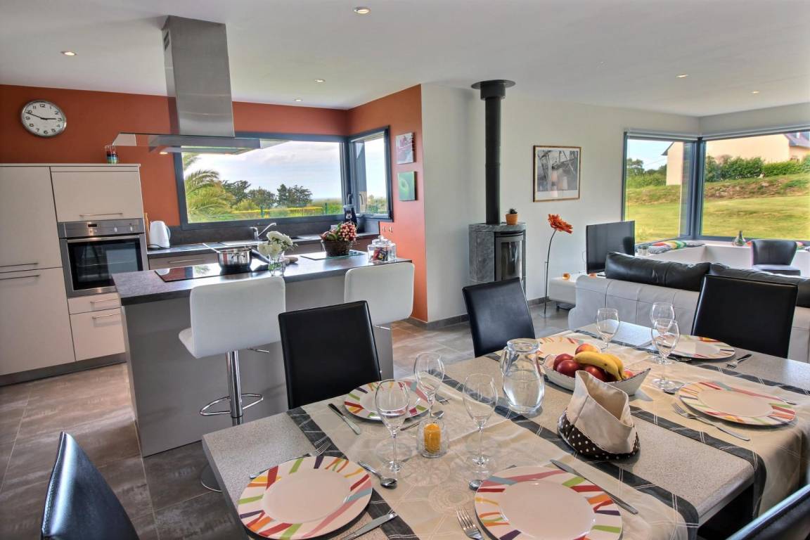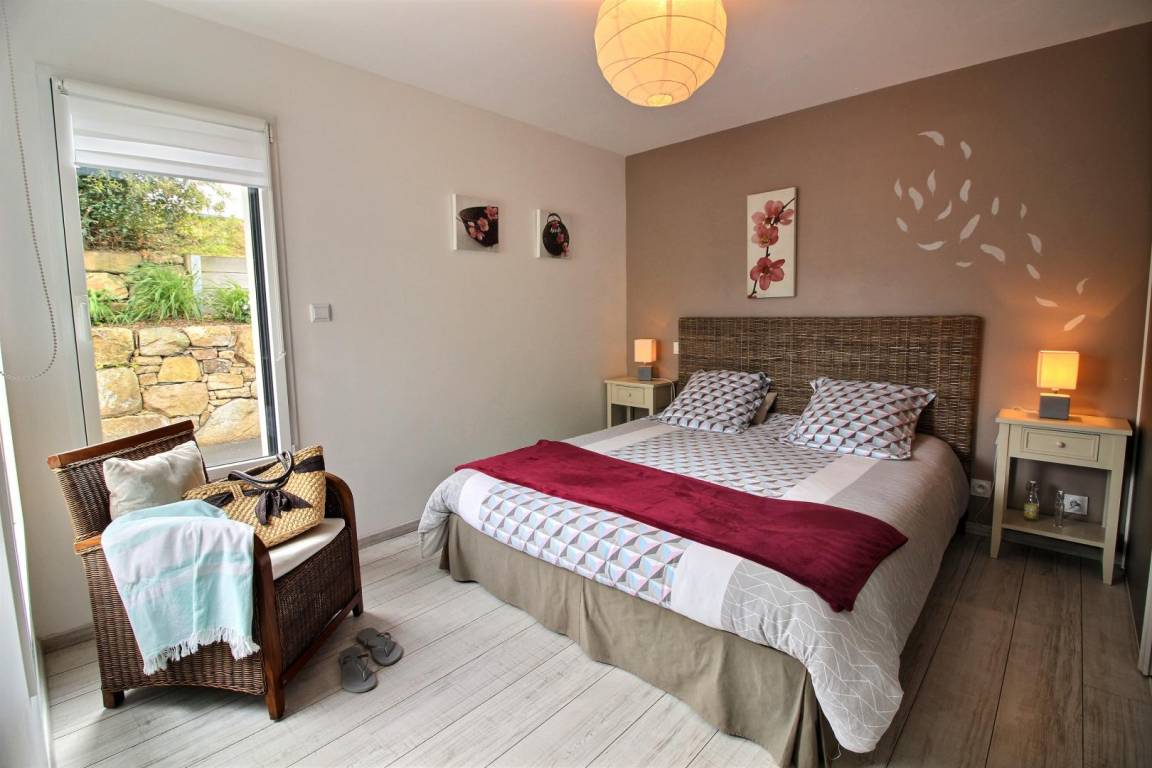 Ihre Ferienwohnung umfasst: Ausgestattete Küche mit Kochinsel, geräumiges Wohnzimmer und Lounge (USB-Flachbildfernseher) Holzofen. Wäschekammer. 1 Schlafzimmer (1 Doppelbett 160x200 mit eigenem Bad), 1 Schlafzimmer (1 Doppelbett 160x200), 1 Schlafzimmer (2 Einzelbetten 90x190, die zusammengestellt werden können), Badezimmer mit Dusche, 2 separate Toiletten. Zwischengeschoss und Terrasse im Obergeschoss mit Blick auf die Inseln. 800 m² großer Garten mit 2 Terrassen. Parkplatz und Hof für Autos, Abstellraum für Fahrräder oder Motorräder.