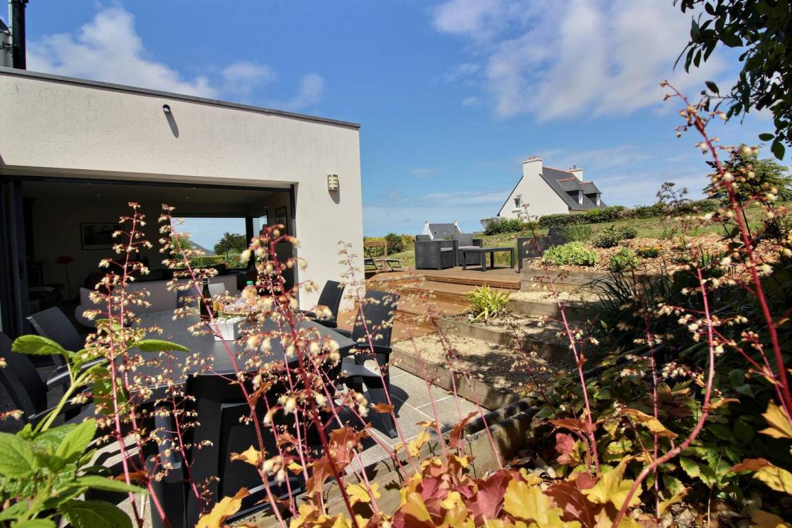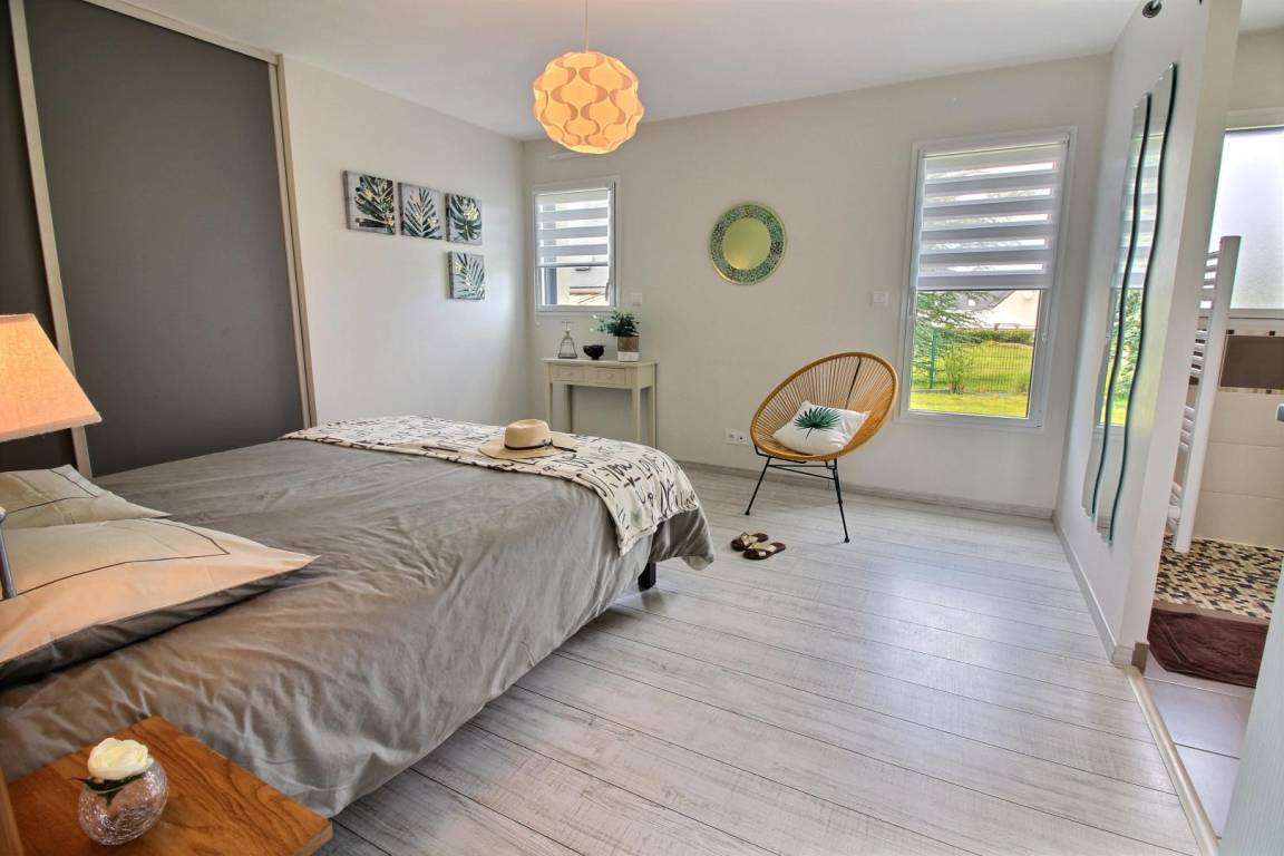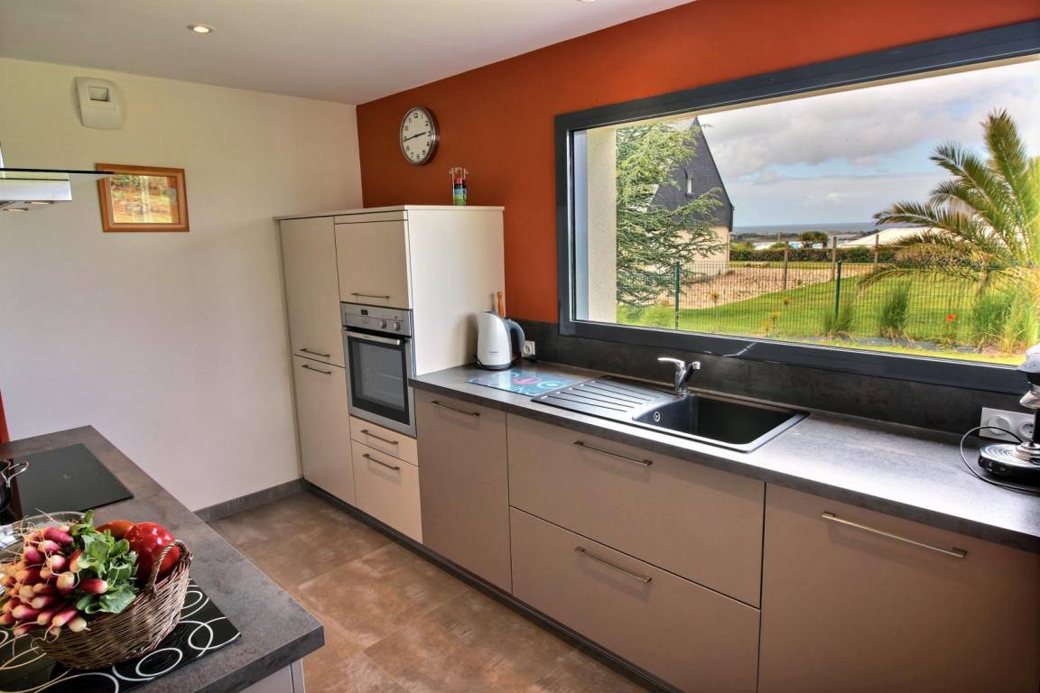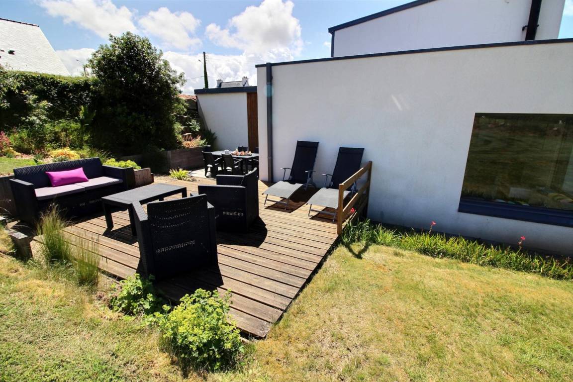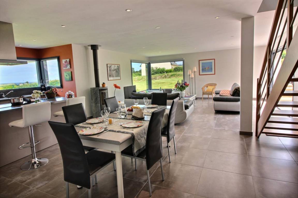 Ihre Ferienwohnung umfasst: Ausgestattete Küche mit Kochinsel, geräumiges Wohnzimmer und Lounge (USB-Flachbildfernseher) Holzofen. Wäschekammer. 1 Schlafzimmer (1 Doppelbett 160x200 mit eigenem Bad), 1 Schlafzimmer (1 Doppelbett 160x200), 1 Schlafzimmer (2 Einzelbetten 90x190, die zusammengestellt werden können), Badezimmer mit Dusche, 2 separate Toiletten. Zwischengeschoss und Terrasse im Obergeschoss mit Blick auf die Inseln. 800 m² großer Garten mit 2 Terrassen. Parkplatz und Hof für Autos, Abstellraum für Fahrräder oder Motorräder.